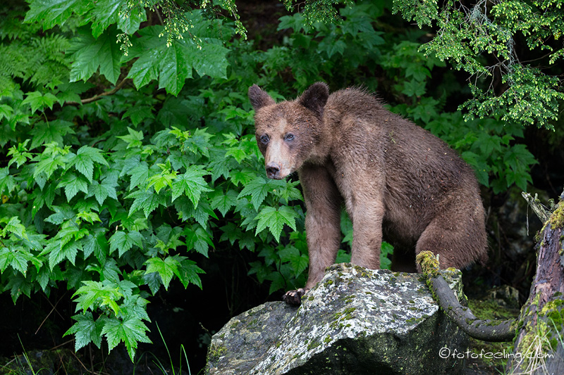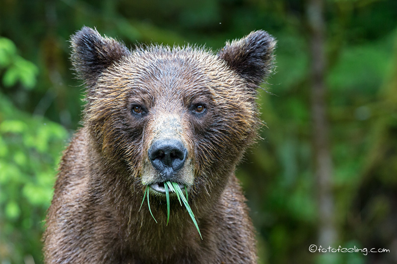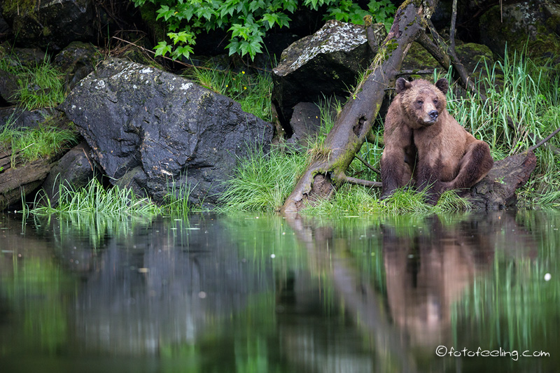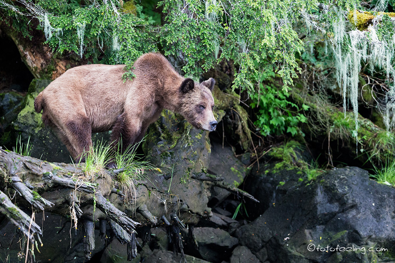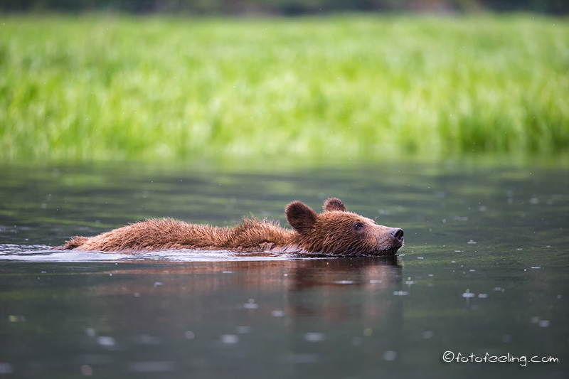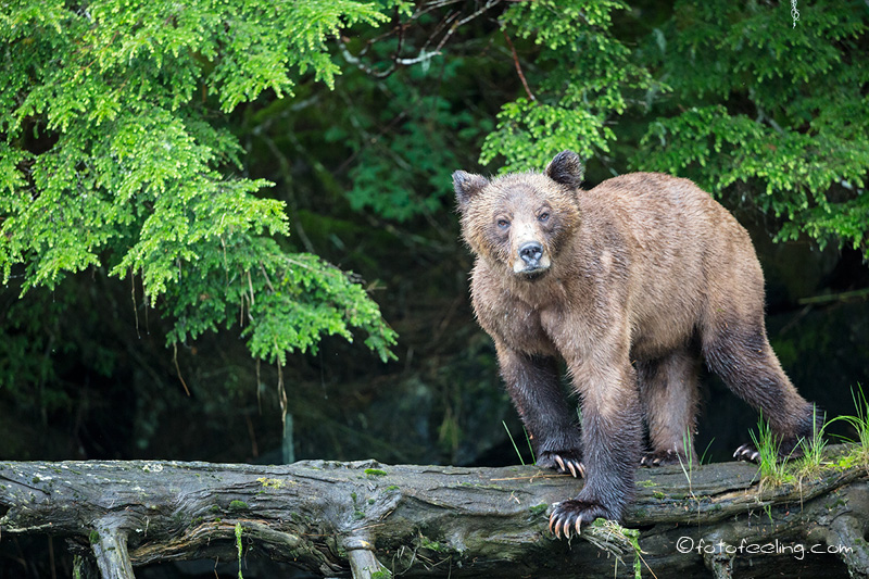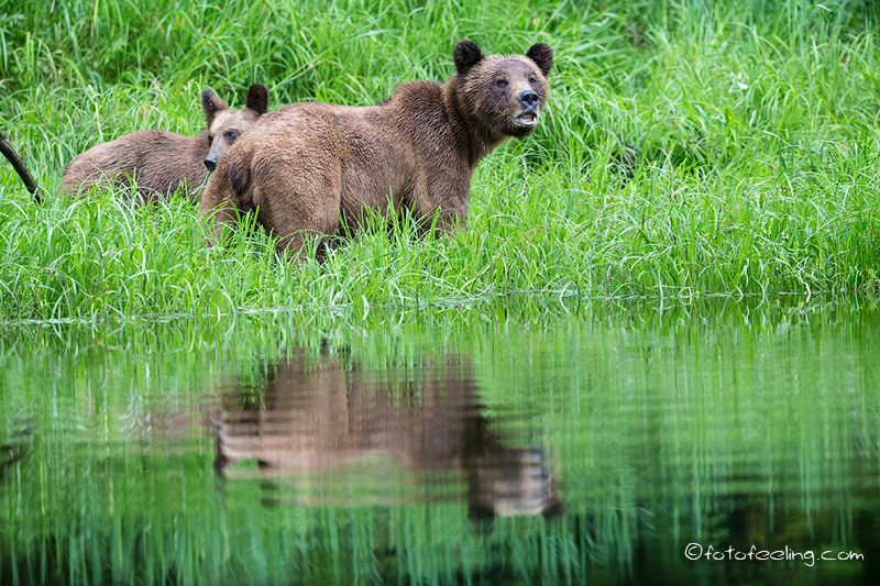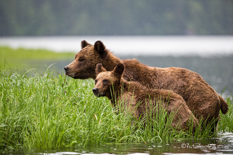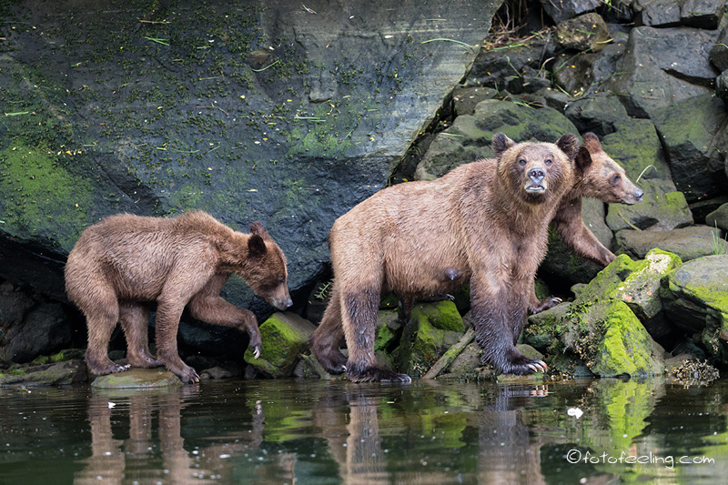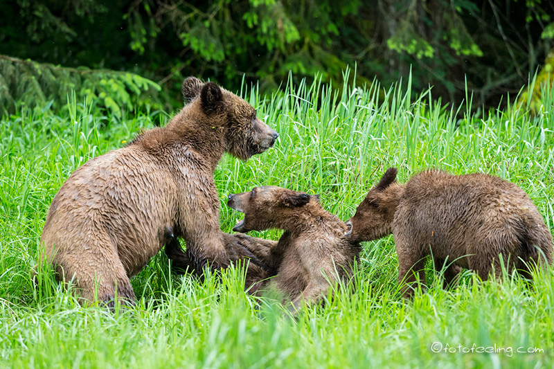 Die Grizzlys sind viel kleiner als ihre Kameraden, die Küstenbraunbären. So kam uns die Bärenmutter schon klein vor und auch ihre dreijährigen Jungen wirkten irgendwie noch wie kleine Bärchen auf uns.