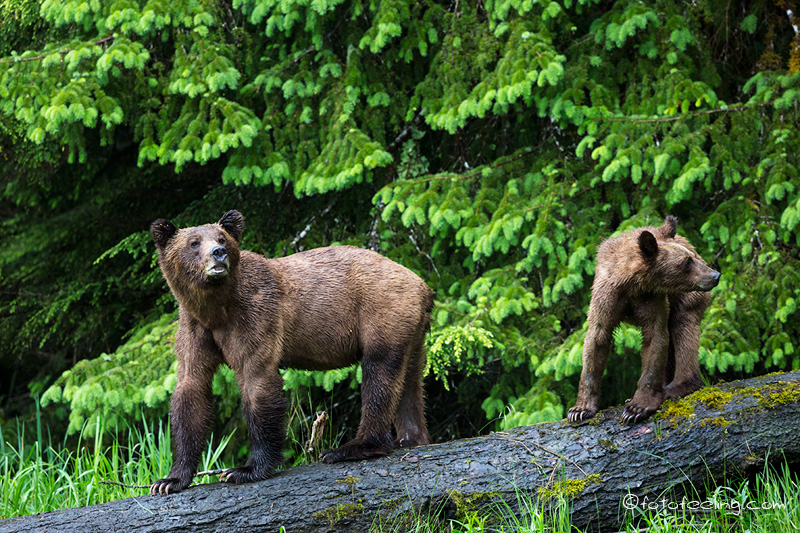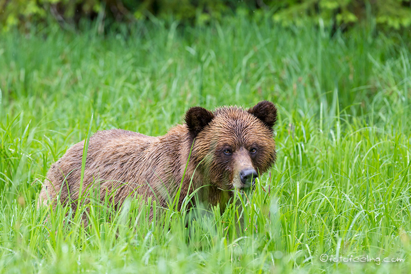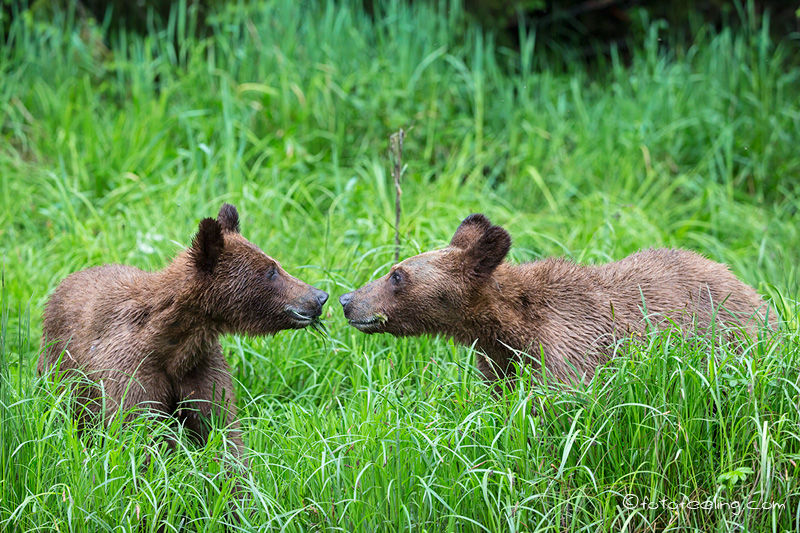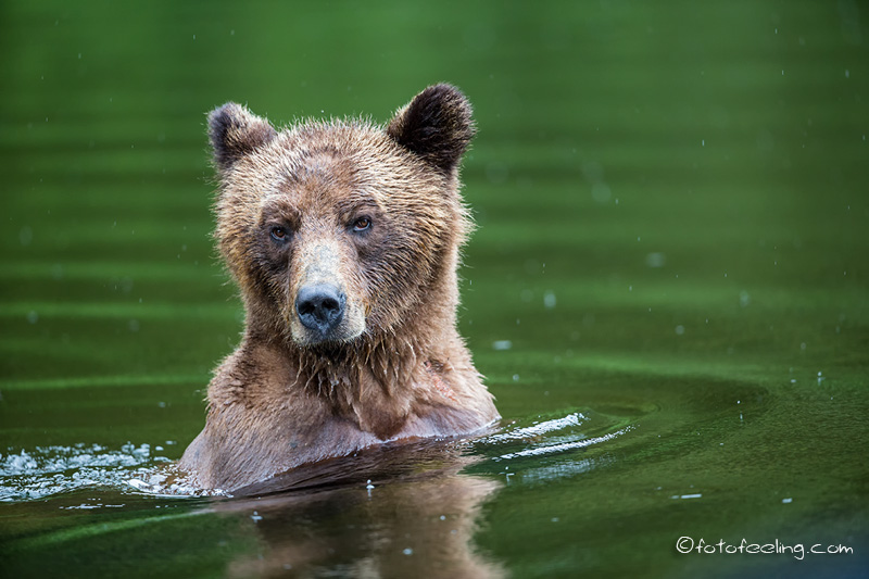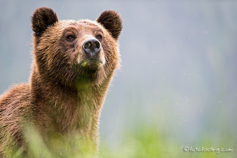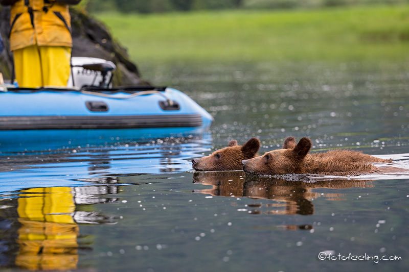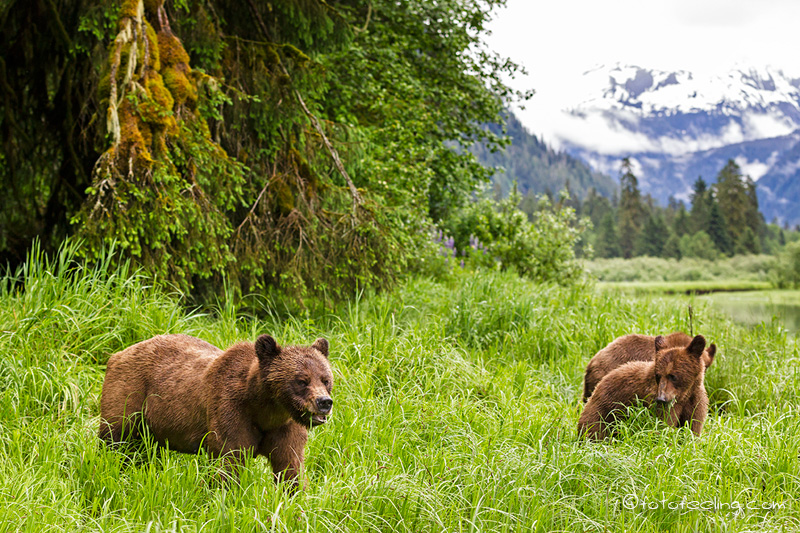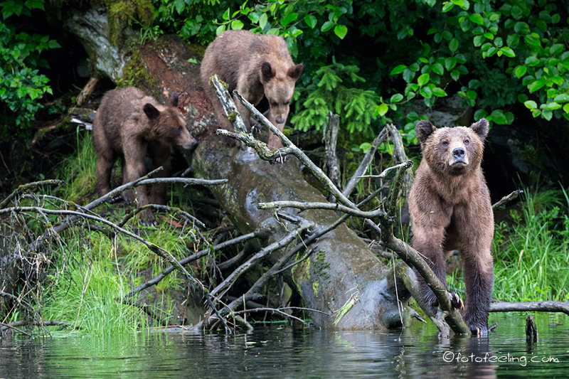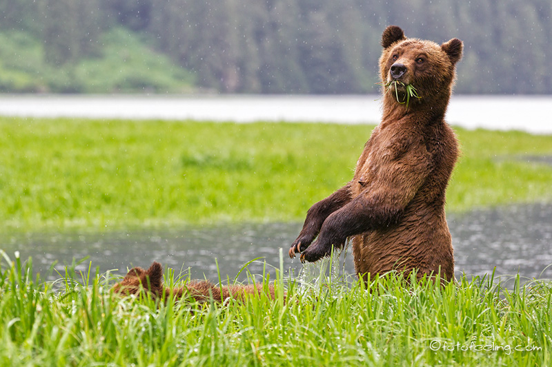 Die Grizzlys sind viel kleiner als ihre Kameraden, die Küstenbraunbären. So kam uns die Bärenmutter schon klein vor und auch ihre dreijährigen Jungen wirkten irgendwie noch wie kleine Bärchen auf uns.