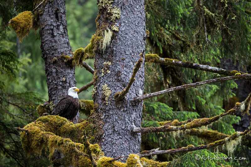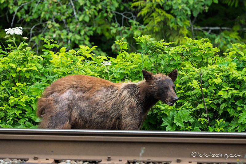 Dann ging es auf den Yellowhead Highway, dem wir bis zum Abzweig nach Stewart/Hyder folgen würden. Die Landschaft war sehr schön unterwegs, aber wir waren schon viel zu verwöhnt, um sie wirklich würdigen zu können. So sehr hatte uns gerade der letzte Morgen im Khutzeymateen beeindruckt. Bei einem jungen Schreiseeadler, der majestätisch auf einer Wurzel saß, hielten wir an und Chris wollte gerade los laufen und ein paar Bilder machen, als ein riesiger Laster vorbeigeschossen kam und der Adler davon flog und sich etwas weiter weg hinsetzte. Dort gelangen Chris zwar noch ein paar Bilder, aber es war nicht das Gleiche wie zuvor. Beim Losfahren schaue ich aus dem Fenster und rufe: „Stopp, da ist ein Bär.“ Der Arme sah aber gar nicht gut aus. Das Fell war räudig und er humpelte. So machte er einen etwas traurigen Eindruck nach den gesunden Bären zuvor.