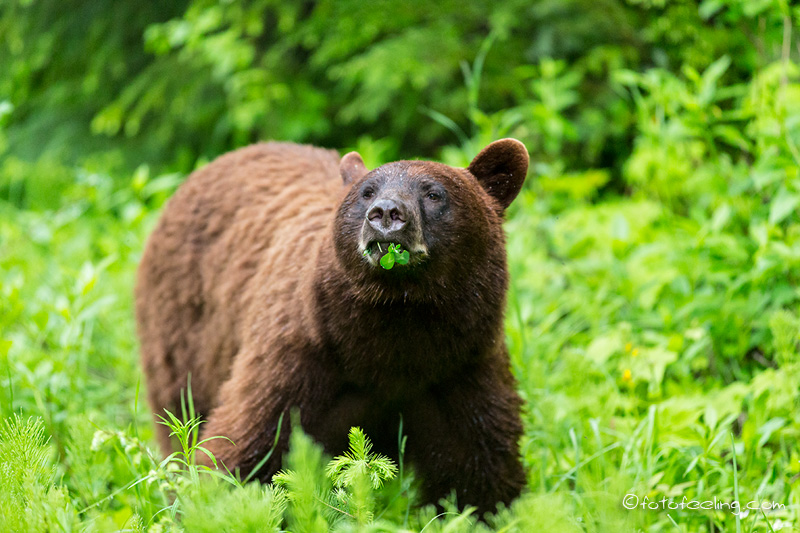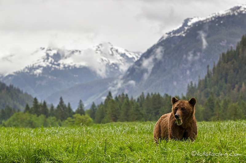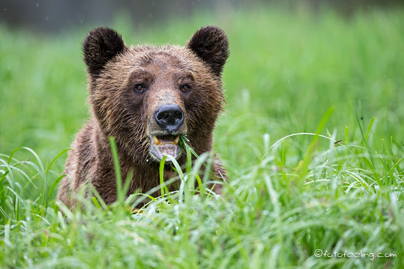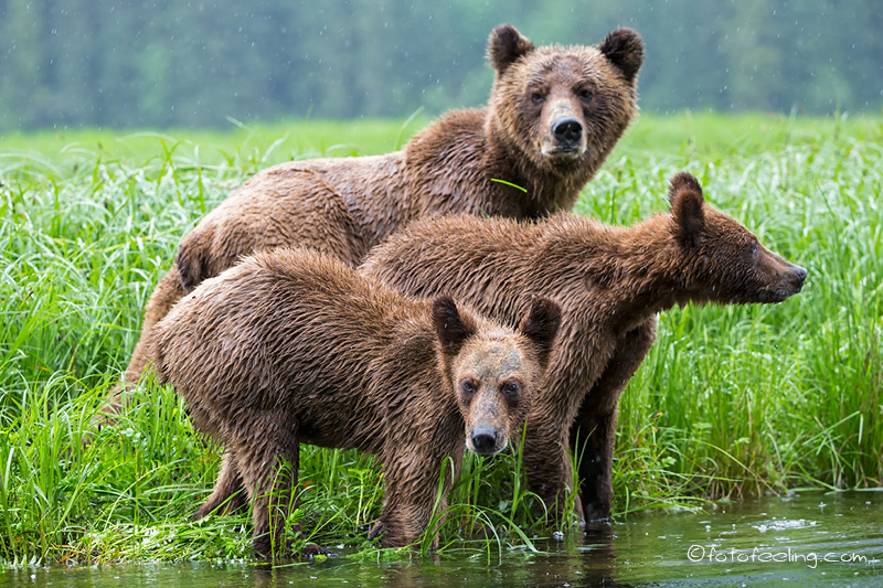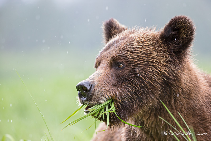 Etwas enttäuscht waren wir ja schon, aber zum Glück steigerte sich der Tag noch. Als erstes ließ der Regen merklich nach und dann kam die Bärin mit den Jungen den Berghang hinab. Sie kletterten auf einen Baumstamm und schauten uns an, dann ging es weiter am Ufer entlang bis zu einer saftigen Wiese, wo alle drei das frische Gras fraßen. Man hörte richtig das Schmatzen und wenn man nicht hinschaute konnte man fast denken, dass man auf einer Almwiese ist und den Kühen beim Grasen zuhört. Es war eine so friedliche Idylle bei den Bären, die nur etwas vom Dauerfeuer der Kameras gestört wurde. Tom bremste die Übereifrigen (unter anderem Chris) immer wieder und sagte, dass man auch genießen muss, denn das vergisst man allzu schnell, wenn man die Kamera vor dem Auge hat. Dann ist man nur noch auf die Bären fixiert und nimmt nichts mehr von der Umgebung wahr.