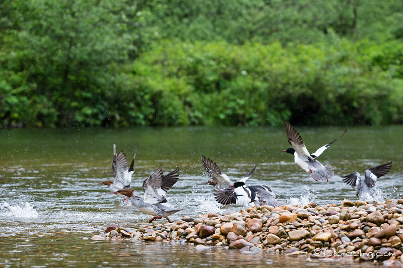 Bis 11 Uhr hatten wir Freizeit, dann machte Tom das Boot klar und wir gingen an Bord, denn erst jetzt war die Flut hoch genug, um ein paar besonders seichte Stellen passieren zu können. An diesem späten Vormittag suchten wir vergeblich nach den Bären. Dafür betrachteten wir intensiver die Landschaft. Lupinen wuchsen überall und auch andere schöne Blumen reckten ihre Köpfchen dem Himmel entgegen. Wasservögel schauten uns interessiert an und wir sie selbstverständlich auch. Hey, das waren ja Gänsesäger, stellten wir erstaunt fest. Sie hatte zwar keine Jungen, aber dafür waren es ca. 6 Paare, die hier zusammen im Wasser schwammen. Auch ein paar Möwen und andere Enten ließen sich bewundern. Doch sie waren natürlich ziemlich scheu und flogen davon, als wir zu nah kamen.