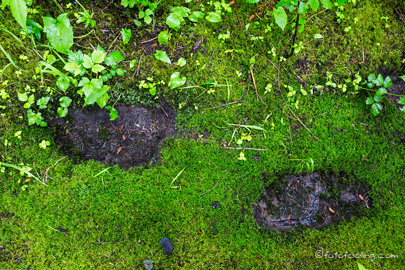 An einer tollen Stelle im Wald ankerten wir und gingen an Land. Hier zeigte Tom uns eine Grizzlyspur und erklärte uns, dass die Bären immer den gleichen Weg gehen und dabei ihre eigenen Spuren benutzen. Dementsprechend tief waren die Abdrücke und in den Fußabdrücken wuchs kein Gras mehr. An einem Baum sahen wir frische Kratzstellen und eine Bissspur.