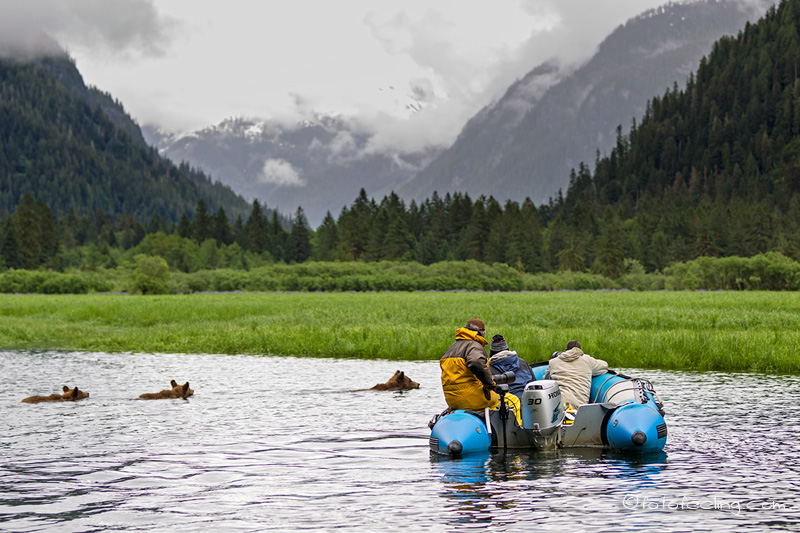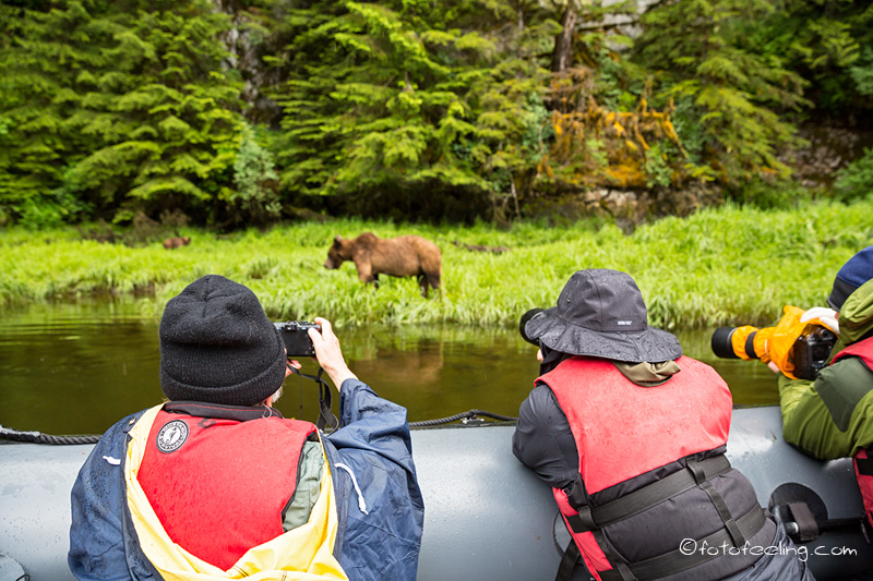 Aber wir hatten keine Zeit zum Schauen oder Rasten, denn schon bald ging es zurück aufs Zodiac. Über unsere Hosen zogen wir die Regenhosen, oben herum über das Fleece noch die Regenjacke und auch die Kameras packten wir in ihre Regencapes, denn es goss immer noch wie aus Kübeln. Wer schon mal auf einem Zodiac längere Zeit verbracht hat, der weiß, dass man auf diesem Gummiboot sehr schnell auskühlt und draußen war es nass und es ging ein kalter Wind. Zum Glück waren wir gut eingepackt und trotzdem wurden wir bald klamm und es wirkte so als ob die Nässe durch alle Poren drang. Wir fuhren lange herum, aber kein Bär ließ sich sehen. Dann entdeckte Tom eine Bärin mit zwei dreijährigen Jungen. Doch leider liefen sie davon, als wir uns ihnen näherten. Auch ein anderer Bär hatte keine Lust auf ein Shooting und verschwand sehr schnell, kaum dass wir ihn entdeckt hatten. So gab es erst einmal Lunch. Jeder bekam ein Schinken-Käse Sandwich und Tom reichte Gemüse mit einem schmackhaften Dip herum.