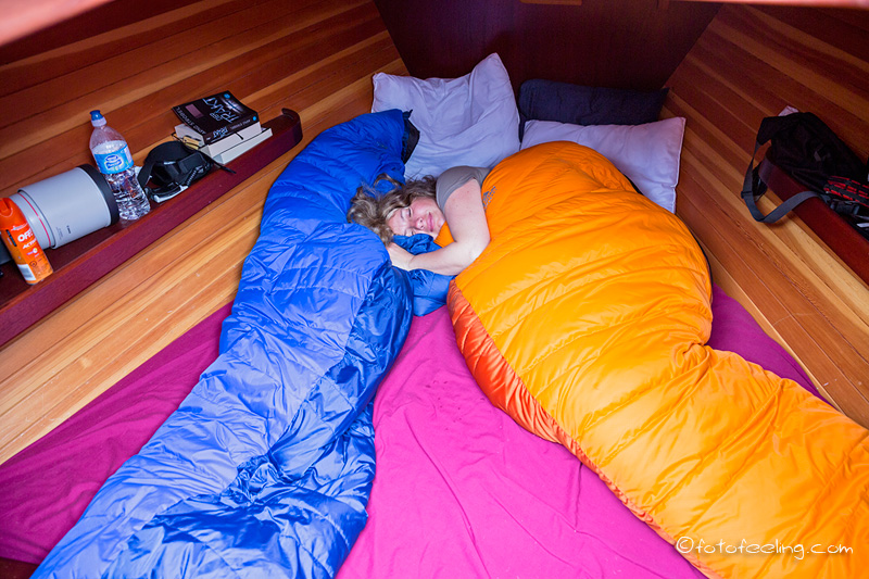 Nach einer kleinen Einweisung und leckeren selbstgebackenen Keksen, bekam erst einmal jeder eine Tasse mit einer Farbmarkierung zugeteilt, die sozusagen für die Zeit an Bord, einem gehörte. Danach wurden die Betten verteilt und wir bekamen die Honeymoonsuite direkt im Bug des Schiffes, da wir das einzige Paar waren. Klein aber fein und wir hatten kein Doppelstockbett, wie die anderen, sondern ein Doppelbett, das zwar nach vorne hin sehr schmal wurde, aber für unsere Köpfe reichte es allemal. An den Seiten hatten wir ein paar Regale, auf denen wir unser Zeug verstauen konnten. Vor dem Bett war noch etwas Platz zum Reinhopsen und schon kam die Tür. Das Beste war jedoch, das genau über dem Bett ein riesiges Fenster war, durch das wir zur Not auch ein- und aussteigen konnten.