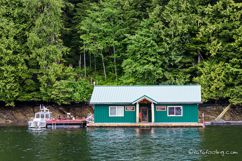 Durch endlose Wälder näherten wir uns um ca. 13 Uhr bei leichtem Nieselregen dem Örtchen Telegraph Cove. Wir schauten uns den Ort etwas genauer an. Er besteht aus einigen wenigen historischen Häusern, die rund um den Hafen gebaut wurden. Im Schnitt leben hier so ca. 20 Leute, dafür kommt die Zahl der Besucher auf über 100.000 pro Jahr. Wir konnten auch verstehen warum, denn der Ort ist total knuffig und es soll eine der besten Walbeobachtungsmöglichkeiten auf Vancouver Island sein. Wir kamen etwas zu spät, denn das Boot war gerade weg, aber das Mädel hinter dem Tresen sagte uns, dass es sich noch nicht wirklich lohnen würde. Einen Tag sahen sie Wale und dann wieder nicht. Die Boote fuhren bisher auch nur 2x die Woche. So setzten wir uns in das schöne Café mit Blick auf das Meer und genossen die Aussicht bei einem guten Kaffee mit einem leckeren Keks dazu.