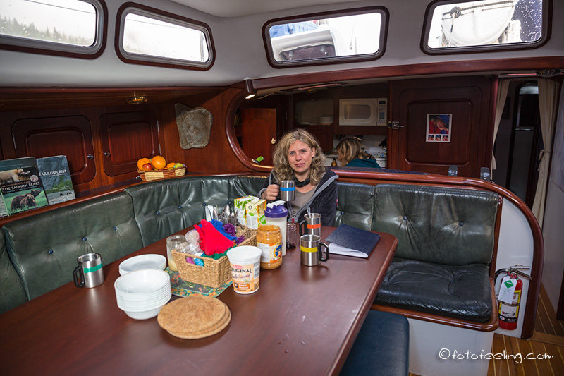 Als es wieder anfing zu regnen, brachte Tom uns zum Schiff zurück. Wir hängten unsere nassen Sachen in den Maschinenraum, wechselten die Schuhe und gingen in den kuschelig warmen Bootsraum. Drinnen brutzelte schon das Essen im Ofen und verführerische Düfte ließen unsere Mägen knurren.