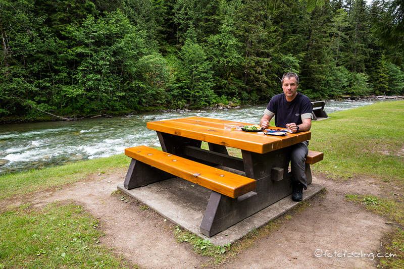 Unsere Mittagspause machten wir im Klenza Creek Provincial Park, der 15 km östlich von dem Ort Terrace liegt. Hier gibt es auch einen Campingplatz und einen schönen Picknickplatz mit Bänken und Tischen direkt am Fluss.