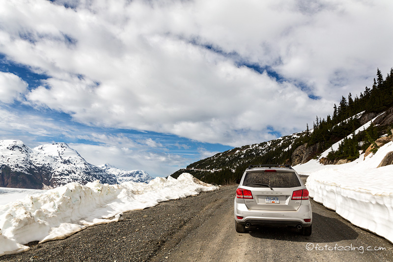 In Hyder wurde gerade die Straße geteert und so standen wir mal wieder an einer Baustelle. Wir nutzten die Zeit und fragten gleich nach dem Weg zum Salmon Gletscher, dem vierthöchsten Gletscher Nordamerikas. Die Frau lachte und wies uns geradeaus. Immer dem Weg folgen und wir sollten das schöne Wetter nutzen. Genau das hatten wir vor!