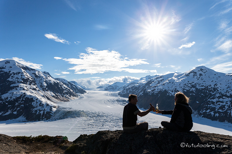 Bald verließ die Straße den Fluss und stieg stetig an. Mit der Höhe kam auch der Schnee. Es war irre, wie sich auf einmal entlang der Straße der Schnee auftürmte. Immer wieder ging es um eine Kurve und plötzlich lag die Gletscherzunge vor uns. Was für ein Anblick! Kilometerweit zog sich das Eis dahin, bedeckt von einem fadenscheinigen Tischtuch aus Schnee, aus dem ab und zu etwas blaues Eis hindurchblitzte und etwas von der ganzen Schönheit des Gletschers offenbarte. Zum Glück gab es auf der engen Piste Haltebuchten, denn immer wieder mussten wir staunend anhalten, um einen Blick auf den Gletscher zu werfen. Doch noch ging es stetig bergauf und wir folgten der Straße weiter, bis wir zu einem großen Parkplatz kamen. Hier gab es Tische und Bänke sowie Toilettenhäuschen. Chris war begeistert von unserer heutigen Campsite. Wir stellten unser Auto ab und warfen erst einmal einen Blick auf den Hauptgletscher. Gigantisch! Hier lag noch mehr Schnee auf dem Eis und trotzdem waren wir wie gebannt von seiner Schönheit. Auch die Berge ringsherum lagen noch im schönsten Winterkleid. Die Sonne glitzerte uns entgegen und das Weiß blendete unsere Augen und trotzdem schauten wir immer wieder begeistert hin und strahlten wie die kleinen Kinder beim Anblick ihrer Lieblingssüßigkeit. Nachdem wir uns erst einmal sattgesehen hatten, meldeten sich unsere Mägen und ich begann zu kochen. An diesem Abend gab es frische Knoblauchshrimps mit Salat. Unsere Getränke kühlten wir im Schnee. Später machten wir sogar noch eine kleine Schneeballschlacht, so ausgelassen waren wir. Es war mit 18°C relativ warm an diesem Abend und die Sonne blieb bis ca. 21 Uhr, ehe sie hinter den Bergen verschwand. Zum Sonnenuntergang saßen wir an einer besonders schönen Stelle oberhalb des Gletschers und genossen die Aussicht. Wieder einmal wurde einem bewusst wie klein und unbedeutend der Mensch ist und wie groß und gigantisch die Natur. Dieser Ort war für uns etwas Besonderes und wir genossen jede Minute hier.