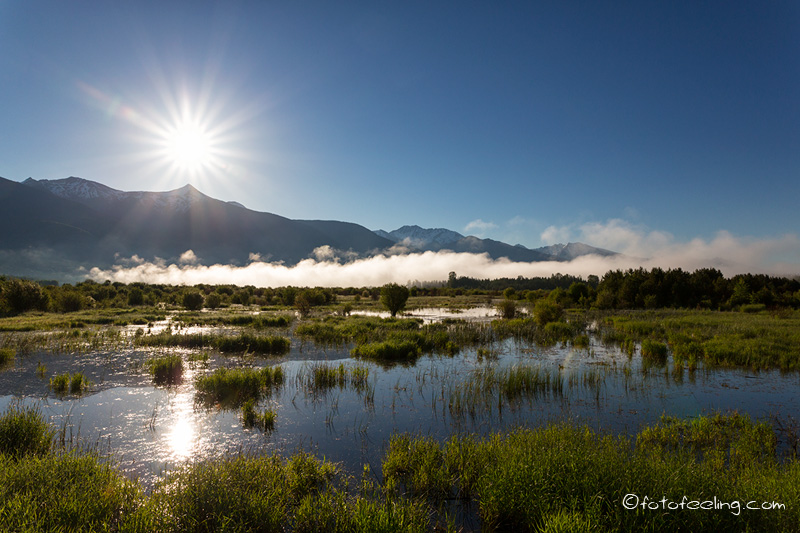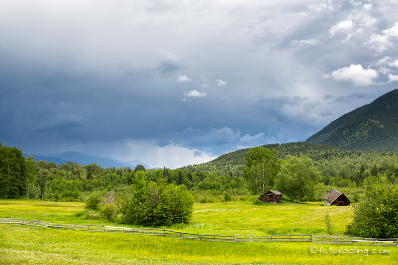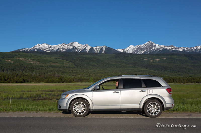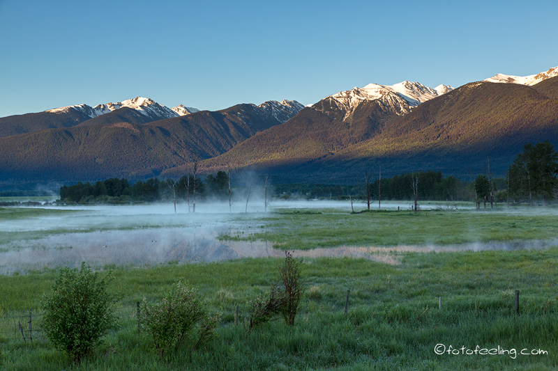 Unsere Fahrt führte uns durch endlose Wälder vorbei an schneebedeckten Bergen. Nebel zog sanft über die Wiesen dahin. Wieder waren wir inmitten einer Bilderbuchlandschaft. Dazu hörten wir sehr passende Indianermusik.