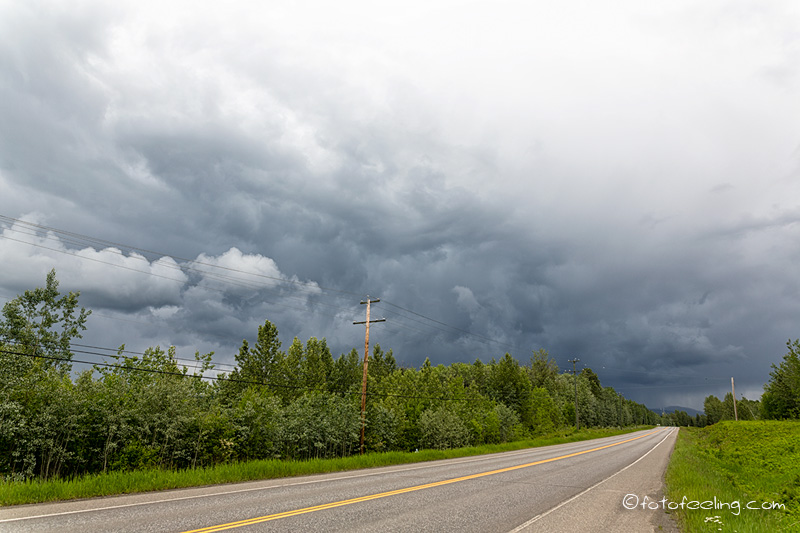 Das Wetter verschlechterte sich weiter und so regnete es immer wieder, aber zwischenzeitig schien auch immer wieder die Sonne. Kurz vor Fraser sahen wir wieder einen Schwarzbären, diesmal erfreute er sich zum Glück bester Gesundheit und fraß das frische Gras am Straßenrand. Auch das Wetter besserte sich stetig und so schien kurz vor Prince George schon wieder die Sonne. Auf einem Parkplatz aßen wir unser Abendbrot, denn wir wollten noch ein wenig weiterfahren, bevor wir uns eine Übernachtungsmöglichkeit suchten. Hier herrschte relativ viel Verkehr, aber nach Prince George wurde der Highway wieder einsamer. Immer wieder sahen wir Elchwarnschilder, doch nirgends war auch nur ein Elch zu sehen. Einen toten Elch sahen wir dann doch noch am Straßenrand. Er war über und über mit einer weißen Schicht bedeckt. Doch das wirklich Interessante war, daß neben ihm ein Kojote saß, vermutete ich jedenfalls. Doch leider fuhren wir viel zu schnell an ihm vorbei und als wir wendeten, war das hundeähnliche Tier natürlich verschwunden.