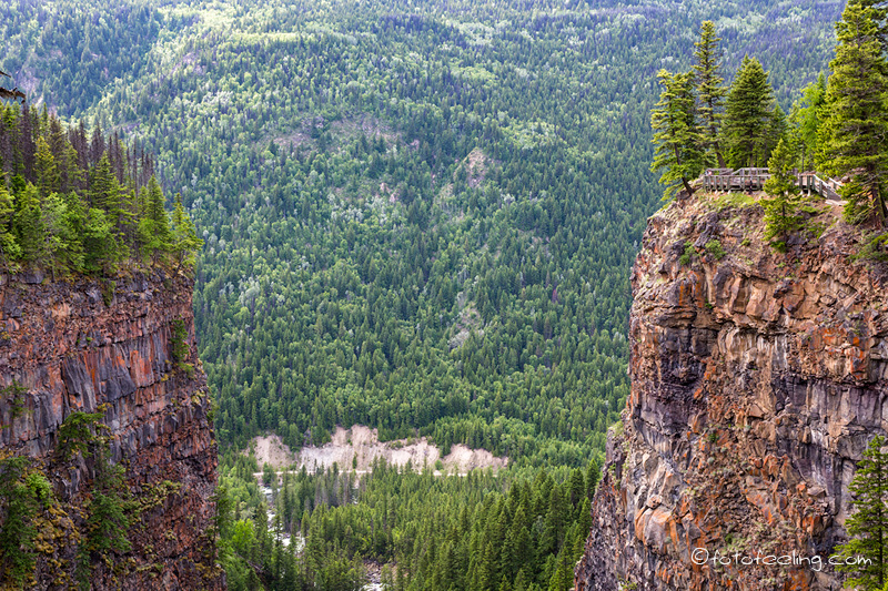 Zuerst erreichten wir die Spahats Falls. Ein großer Parkplatz ließ erahnen, was hier so in den Sommermonaten an Publikumsverkehr zu erwarten war. Doch an diesem Morgen waren nur wenige Autos außer uns da. Am Rand stand ein Stand an dem eine Frau frische Waffeln anbot. Wir waren jedoch satt von den leckeren Teilchen aus der Bäckerei. Wir folgten dem Wanderweg zu den Fällen der parallel zur Flussrichtung verläuft, so dass wir nach 250 Metern den Wasserfall erreichten. Die Spahats Falls lagen am Morgen im Gegenlicht. Hier hat sich der Spahats Creek seinen Weg durch das Vulkangestein gesucht, mittlerweile 120 Meter unterhalb der Canyon Abbruchkante und stürzt 60 Meter hinab in den Creek Canyon, wo er kurz darauf in den Clearwater River mündet.
