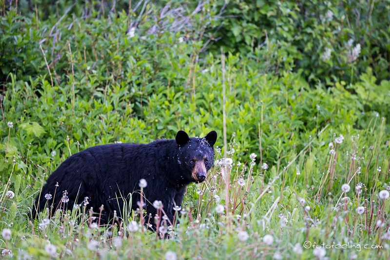 Als nächstes besuchten wir die Helmcken Falls, die auch wieder ein paar Kilometer weiter nördlich durch eine Stichstraße zu erreichen waren. Nach einer kurzen Wanderung erreichten wir auch hier den Wasserfall. Hier hatte sich der Murtle River tief in das Vulkangestein gegraben, sammelt sich in einer kleinen Höhle, aus der er dann 137 Meter tief in den Canyon stürzt. Für uns war dies der schönste Wasserfall im Park. Auch hier wäre jedoch das Licht am Nachmittag deutlich besser und so setzten wir unsere Fahrt durch den Park fort. Wir hielten noch an einigen Parkbuchten mit Ausblick auf den Fluss bis wir den nördlichsten Punkt des Parks, den großen Clearwater Lake erreichten. Dort gibt es einen riesigen Campingplatz mit Versorgungsmöglichkeiten, sowie ein Mini-Restaurant mit Terrasse und herrlichem Blick auf den See und einen Bootsverleih. Das Beste für uns waren jedoch die Münzduschen, wo man für 2$ 3 Minuten duschen konnte, was wir sofort ausgiebig nutzten. Frisch gewaschen und gekleidet stürzten wir uns wieder in den Park, denn mittlerweile war es mittags und Chris wollte unbedingt die vielgepriesenen Buffalo Burger kosten. Leider war der Ausflug zu der Ranch umsonst, denn aus Personalmangelgründen war das Restaurant geschlossen. Der Abstecher aus dem Park hinaus war zwar umsonst, aber dafür sahen wir auf dem Rückweg unseren ersten Schwarzbären im Park. Er fraß sich durch das saftige Gras einer Pusteblumenwiese und war überall mit kleinen Fallschirmen übersät.