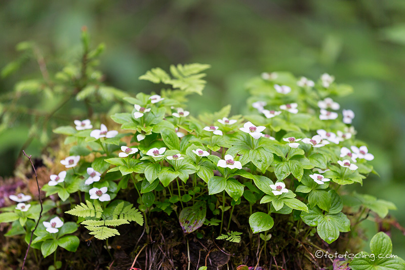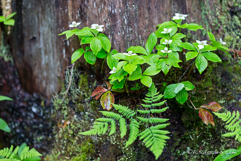 Der Weg führte uns weiter durch üppigen Küstenregenwald. Farne und Moose wuchsen am Boden und auf den Bäumen und überall blühten hübsche Blumen.