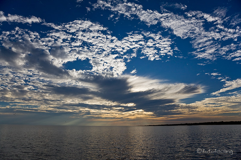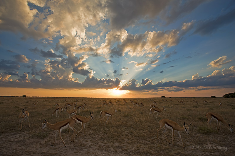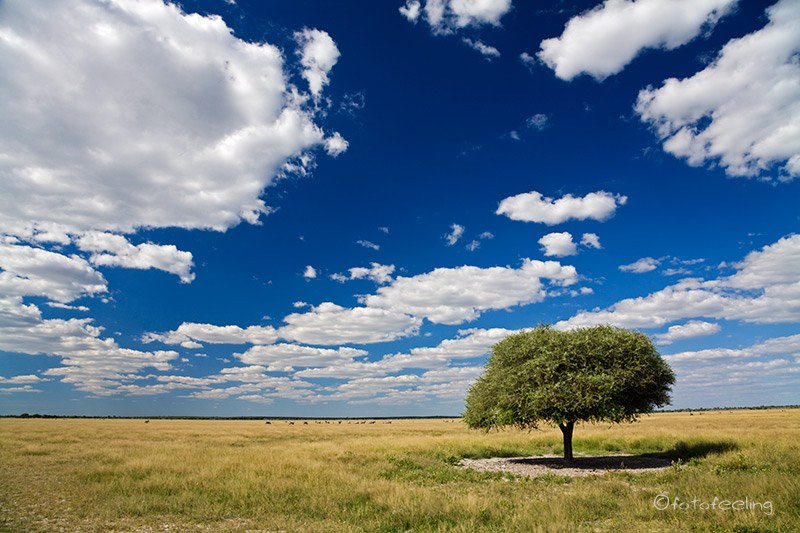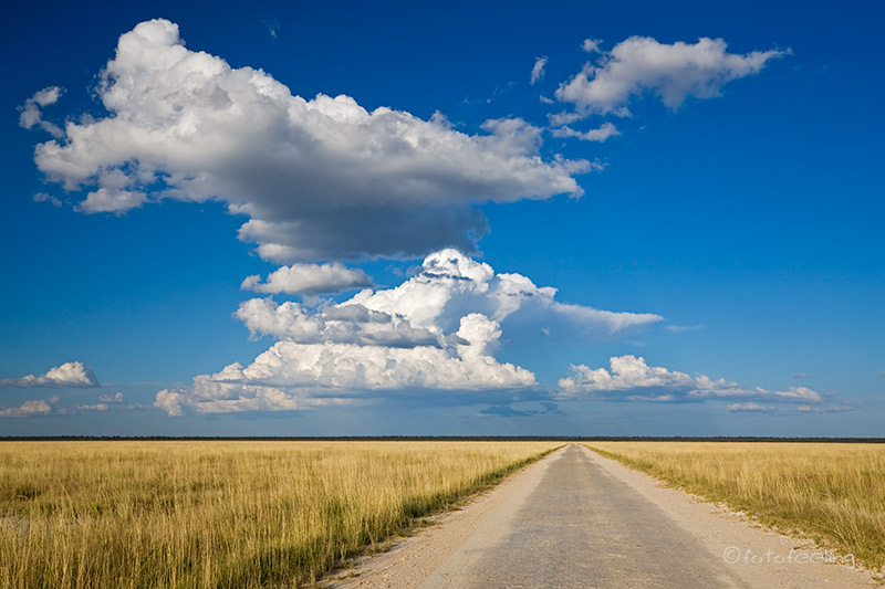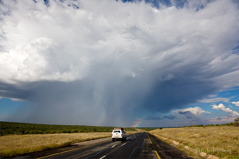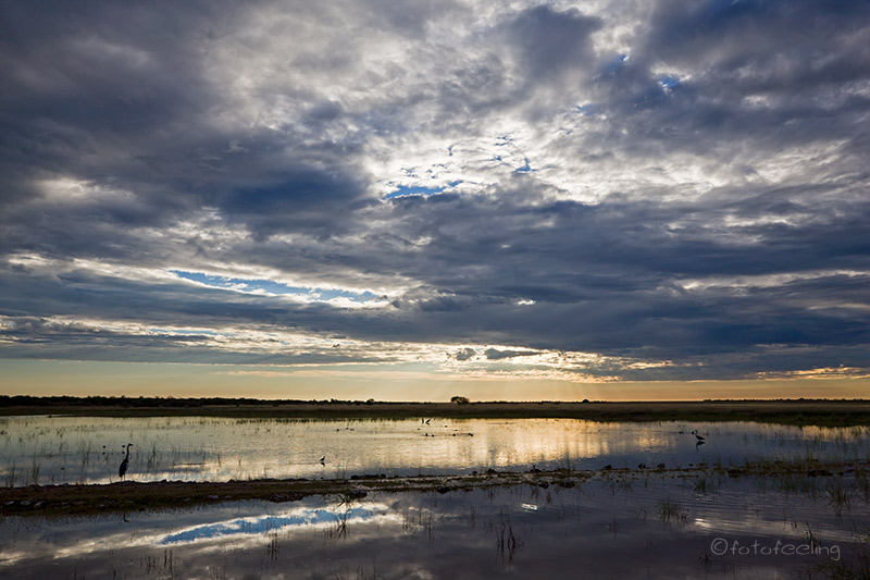 Da sich die Wolken über Nacht verdichtet hatten, beschlossen wir, am frühen Morgen noch einmal zum Etosha Lookout zu fahren, um dort das Wolkenspiel zu genießen. Also fuhren wir zur Straße vor, während alle Anderen zu den Wasserlöchern brausten. Es war wahnsinnig schön, ganz alleine auf der Mainroad zu fahren und die Tiere im frühen Morgenlicht zu beobachten. Die Sonne verschwand jedoch schnell unter der Wolkendecke, so dass wir in Richtung Aussichtspunkt weiter fuhren. Durch das lautstarke Geschimpfe einiger Perlhühner am Straßenrand schaute ich nach links und traute meinen Augen kaum, als ich einen Leoparden inmitten der aufgescheuchten Perlhühner entdeckte. Ich rief nur noch: „Halt!!! Ein Leo!!!“ und sah, wie es Chris riss. Sofort bremste er ab und wendete das Auto weit genug weg, dass sich der Leopard nicht gestört fühlte. Er kam sogar kurz auf die Straße mit einer Schar wütender Perlhühner hinter sich. Ich war so aufgeregt, dass mir die Knie zitterten und ich machte lauter Anfängerfehler bei dem Versuch, ein vernünftiges Bild hinzubekommen. Hinzu kam noch das fehlende Licht. Egal! Der Moment zählte. Wir fuhren noch zweimal hin und her, dann war es dem Burschen zuviel und er verschwand in den Büschen. Die Perlhühner beruhigten sich und wir fuhren weiter. Was für ein Morgen! Ich denke, jeder, der schon einmal eine Begegnung mit diesem schlauen Raubtier hatte, kann unsere Gefühle nur zu gut nachempfinden. Das Wasser auf der Etosha Pfanne war diesmal sehr aufgewühlt, denn es wehte ein kühler Wind, aber die Wolkenstimmung war grandios. Immer wieder mussten wir an unser Erlebnis mit dem Leo denken und freuten uns diebisch über unser Glück. Da wir an diesem Tag noch nach Namutoni wollten, fuhren wir bald weiter. „Jetzt fehlen uns nur noch Löwen, es wäre ja schon fast peinlich, wenn wir aus der Etosha fahren, ohne einen einzigen Löwen gesehen zu haben“ meinte Chris. Ich fand, dass ein Leopard schon okay war, aber gegen Löwen hatte ich auch nichts einzuwenden. Da uns der Blick auf das „Meer“ so gut gefiel, fuhren wir am Rand der Pfanne entlang und so war uns das Glück noch einmal hold, denn Chris entdeckte zwei junge Löwen. Die beiden kamen erst auf uns zu und machten dann lauter Unsinn. So spielten sie mit einem Akazienzweig und rauften ein wenig miteinander. Dabei versuchten sie an unserem Auto vorbeizukommen. Wir wunderten uns schon und Chris schaute neben sich. „Da sind noch mehr Löwen!“ und wirklich eine ausgewachsene Löwin lag mit drei weiteren Junglöwen im Schatten eines Baumes. Wir hätten sie sonst nie und nimmer entdeckt. Den Jungen war unser Auto wohl etwas zu nah, denn sie zogen sich bald weiter von der Straße entfernt in die Büsche zurück - nur die Löwin blieb ungerührt liegen. Bei Namutoni drehten wir noch eine Runde um die Fishers Pan und waren ziemlich enttäuscht, da wir viel mehr Wasser mit zahlreichen schnatternden Flamingos erwartet hätten. Aber die Pan wird von anderen Flüssen gespeist als die Etosha Pfanne und so war sie leider schon wieder am Austrocknen und die von uns ersehnten Flamingos konnten wir natürlich nirgends entdecken. Die meisten baulichen Veränderungen stellten wir nach unserer Ankunft im Fort Namutoni fest. Für die Rezeption war extra ein neues Gebäude errichtet worden und die ehemalige Rezeption wurde als Museum genutzt, das aber leider geschlossen war. Als wir aus unserem Auto ausstiegen, lief gleich jemand auf uns zu und begrüßte die Neuankömmlinge. Die ehemalige Straße zum Fort endete mit einem Parkplatz für Kurzzeitparken und der restliche Weg war Fußweg. Im Fort gibt es keine Unterkünfte mehr, dafür drei Restaurants und Souvenirläden. Zu den Bungalows führt nun ein Holzstegsystem und um die Bungalows herum wurden etwa drei Meter hohe Holzzäune errichtet. Für uns hatte das ein wenig Gefängnis-Charakter. Dafür waren die Bungalows innen wirklich sehr schön renoviert und man kann sich dort sicher wohl fühlen. Auch der Pool war mit Holz verkleidet, aber dort hatte sich ansonsten nicht viel verändert. Neue Toiletten und eine Poolbar waren die einzigen Neuerungen. Das Wasserloch war nach wie vor mit Schilf zugewuchert, aber es gab jetzt im Fort eine Sundowner-Terrasse mit Blick auf das Wasserloch. Die Straße zum Campingplatz wurde umgeleitet und eine neue Teerstraße führte durch eine Kontrolle auf einen Parkplatz, auf dem die Bungalowtouristen ihre Autos stehen lassen müssen. Zum Glück hatte sich der Campingplatz nicht verändert und wir bekamen sogar unseren Stammplatz. Wir fanden das Ganze zu übertrieben, aber wer es nicht anders kennt, findet vielleicht Gefallen an den Neuerungen. Auf dem Campingplatz wurden wir von einer großen Mangustenfamilie mit zahlreichen Kiddies begrüßt. Das waren vielleicht freche Gesellen. Sie inspizierten sogar den Motorraum unseres Autos und suchten überall nach fressbaren Sachen. Wir mögen diese quirligen Tiere einfach zu gerne und hatten viel Spaß daran, sie zu beobachten. Nachmittags fuhren wir in Richtung Adoni Wasserloch. Es war wieder landschaftlich wunderschön, am Rande der Etosha Pfanne entlang zu fahren und Wasser bis zum Horizont zu sehen. Am Himmel hatten sich wunderschöne Wolkentürme gebildet, die sich im Wasser spiegelten. Überall waren kleine und größere Wasservögel zu sehen, für die eine Zeit des Überflusses herrschte. In Tsumcor hofften wir eigentlich Elefanten zu sehen, aber nicht ein einziger ließ sich dort blicken. Es hatte einfach noch viel zu viel Wasser im Park und die Tiere waren nicht auf die Wasserlöcher angewiesen. Zum Sonnenuntergang fuhren wir noch einmal zum Chudop Wasserloch vor, denn dort konnten wir bisher immer Hyänen beobachten, aber nicht eine einzige ließ sich blicken. Dafür waren auf der Zufahrtsstraße Giraffen, die sich wunderschön im flimmernden Sonnenuntergang platziert hatten. Auf die Minute genau fuhren wir durch das Gate und zurück auf unseren Campingplatz. Wir waren gerade f