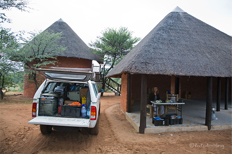 Ca. zwei Stunden vor Abflug waren wir am Flughafen und suchten besagten Drop-Off-Schalter, der uns ja schnell und unkompliziert einchecken sollte. Leider hatte die Air Berlin nur zwei Schalter offen und an dem ausgewiesenen Drop-Off stand eine sehr lange Schlange, in der leider nicht nur E-Ticket-Besitzer, sondern auch andere Leute standen, die alle freundlich abgefertigt wurden. Der andere Schalter war nämlich auch noch für den Late Night Check-in zuständig und die Schlange war noch länger. Aber was soll’s, wir hatten ja Urlaub und es ging alles in allem doch noch relativ flott. Der Flug verlief sehr angenehm und ruhig, das Essen war okay und es gab sogar wieder einen Wein zum Essen. Den Schnaps danach verschlief ich schon und auch von den Filmen bekam ich wie immer nichts mehr mit. Der Schlaf ist zwar nicht erholsam und man wacht immer wieder mit einem schmerzenden verkrampften Nacken auf, aber die Zeit verging schnell und schon bald wurde man zu einem Frühstück geweckt. Langsam dämmerte es und wir konnten den kommenden Tag erahnen. Je heller es wurde, desto kribbeliger wurden wir. Endlich konnte man genug erkennen und der Windhoeker Flughafen kam in Sicht. Die ungewohnte grüne Landschaft mit den zahlreichen Wasserlöchern saugten wir förmlich in uns auf und als wir endlich das Flughafengebäude verließen, hatten wir das Gefühl, daheim zu sein. Ein Shuttle brachte uns mit vier anderen Gästen zum Autovermieter Hubert Hester von Kalahari Car Hire, wo schon unser Toyota auf uns wartete. Es war ein 2007 Modell, das einen Crash hinter sich hatte und lange stand. Vorne war es repariert und hinten noch etwas verbeult. Das war uns jedoch mehr als recht, denn man weiß ja nie, was alles so passieren kann und lieber eine Beule mehr am Auto als einen nagelneuen Wagen. Wir räumten alles auf die Schnelle ein und fuhren erst einmal einkaufen. Im Olympia Einkaufszentrum bekamen wir alles, was wir benötigten und füllten den Kühlschrank mit Fleisch, Getränken und Leckereien auf. Dann machten wir uns auf den Weg zu Ali, denn dort standen ja noch unsere Kartons mit lauter wichtigen Sachen, die wir in Namibia gelassen hatten. Bei Ali war es herzlich und nett wie immer und sie gab uns noch eine dicke Decke mit. Für unsere Verhältnisse kamen wir zeitig aus Windhoek raus und fuhren los in Richtung Ghanzi. Wir kamen besser voran als geplant und erfreuten uns an der unbeschreiblich grünen und schönen Landschaft. Viele dicke Wolken begleiteten uns und es gab natürlich auch noch ein kurzes Gewitter mit einem heftigen Regen. An der botswanischen Grenze stapften wir durch tiefe Pfützen und alles glitzerte feucht im Sonnenschein. Die Grenzformalitäten waren kurz und unkompliziert wie immer und schon bald konnten wir weiter fahren. Am späten Nachmittag kamen wir in Ghanzi an und schlugen den Weg zur Tautona Lodge ein. Dort angekommen schauten wir uns erst einmal den Campingplatz an und waren begeistert. Er war schön angelegt mit genügend Abstand zum Nachbarn, hatte Strom und eine Lapa, in der man sicher gemütlich mit anderen Gästen zusammensitzen konnte. Chris meinte auf einmal nebenbei zu mir: „Ich glaube, ich höre Löwen raunzen.“ Etwas mitleidig schaute ich ihn an und sagte, dass er sich noch ein wenig gedulden müsste, bis wir Löwen zu hören bekämen. Da wir am ersten Tag keine Lust hatten selber zu kochen, beschlossen wir ins Restaurant zu gehen. Hinterher erfuhren wir bei einem leckeren Abendessen, dass der Besitzer der Lodge ein zahmes Löwenpaar hat und Chris sich wohl doch nicht verhört hatte. Tageskilometer: 540 km Übernachtung: |