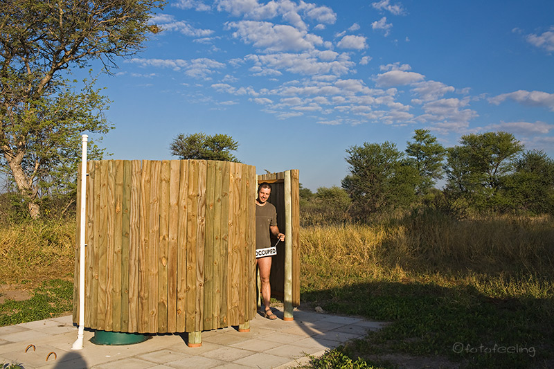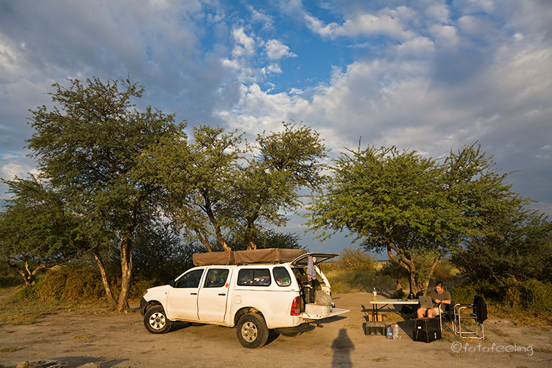In der Nacht fing es an zu regnen und wir standen am nächsten Morgen bei leichtem Nieselregen auf und frühstückten in der Lapa. Das Zelt hatten wir gerade zusammengebaut, als Chris auf einmal unruhig wurde und rief: „Wo ist mein Navi???“ Er fing an aufgeregt hin und her zu laufen und ließ mir keine Ruhe. So stellten wir das Zelt wieder auf und ich durchsuchte die Schlafsäcke und die Zeltinnentaschen. Nichts!!! Chris wurde leicht panisch, als mir der rettende Gedanke kam und ich ihn fragte: „Hast Du in die Fototasche geschaut?“ Er schlug sich nur mit der Hand vor den Kopf und holte ganz glücklich sein Navi aus der Laptoptasche. Jetzt schmeckte das Frühstück gleich noch viel besser und wir konnten mit Navigation starten. In Ghanzi tankten wir auf und füllten auch gleich unseren Reservekanister. Leider war es Sonntag und so bekamen wir in der ganzen Stadt kein Geld (der ATM am Spar sollte erst am Nachmittag gehen). Aber eigentlich brauchten wir auch nichts, denn an der Tankstelle kann man ja mit Karte bezahlen und in den Parks nehmen sie alle möglichen Währungen wie z. B. Euro, Dollar und Rand. So beschlossen wir, uns auf dem Rückweg aus der Zentralkalahari mit Pula einzudecken und fuhren los. Kurz vor dem Kuke-Veterinärzaun biegt die Straße von Ghanzi aus kommend nach rechts ab und man muss erst einmal ein Farmtor öffnen, dann befindet man sich auch schon auf dem direkten Weg zum New Tsau Gate. Die Strecke dorthin ist ausgefahren und gut und wir konnten sie ohne Allrad fahren, aber es hatte ja auch gerade erst geregnet und der Sand war feucht und fest. Am New Tsau Gate wurden wir sehr nett begrüßt und durchgewinkt, da die Ranger gerade nicht da waren. So waren wir nach ca. fünf Minuten auf dem Weg zur Pipers Pan. Die ausgefahrenen Spuren führten erst noch ca. 30 km am Zaun entlang und bogen dann nach rechts ab. Es war sehr grün, aber auch buschig und wir sahen eigentlich nichts an Tieren. Erst an der ersten Pfanne kam dann die Überraschung. Am Wasserloch stand eine große Oryxherde und im Hintergrund zahlreiche Gnus und Springböcke. Erfreut hielten wir an und genossen den Augenblick. So ging es dann weiter durch hohes Gras mit vielen Büschen und mit vielen Tieren an den Pfannen. An der Passage Pan blieben wir dann noch einmal begeistert stehen, denn dort sahen wir zwei Löffelhunde, Giraffen, Schakale, Gnus, Oryx und Kuhantilopen geballt auf einmal. Man wusste fast gar nicht, wo man zuerst hinschauen sollte. Natürlich hatten es uns besonders die Löffelhunde angetan, aber leider sind die Tiere in der Kalahari recht scheu und meiden die Autos und so waren die zwei relativ schnell verschwunden. Das schlechte Wetter begleitete uns schon seit Ghanzi und so hatten wir die ganze Fahrt über kaum Sonne und manchmal sogar leichten Nieselregen aus dicken Wolken. Um ca. 16 Uhr erreichten wir die Pipers Pan und packten erst einmal unser Auto um. Alles wurde etwas praktischer verstaut und momentan unwichtige Sachen verschwanden in unserer großen Alukiste. Kaum waren wir fertig, als auch schon die Sonne herauskam und warmes Nachmittagslicht die Campsite noch schöner erscheinen ließ. Es war gerade richtig gemütlich, als auf einmal in unmittelbarer Nähe ein Löwe zu brüllen anfing. Sofort waren wir hellwach und stellten fest, dass das Rufen aus der Nähe des Wasserlochs kommen musste. Natürlich hielt uns nichts mehr und wir fuhren in freudiger Erwartung los. Leider war keine Spur von einem Löwen zu sehen, dafür war das Gras auch viel zu hoch und natürlich war auch kein Laut mehr zu hören. Wir sahen jedoch viele Antilopen auf der Pfanne und genossen den warmen Abend und unseren ersten Sundownerdrink in freier Natur. Auch unser erster Grillgang war super gelungen und wir ließen uns das knusprig zarte Fleisch unserer T-Bones schmecken. Tageskilometer: 370 km Campsite: Piper´s Pan 1 |