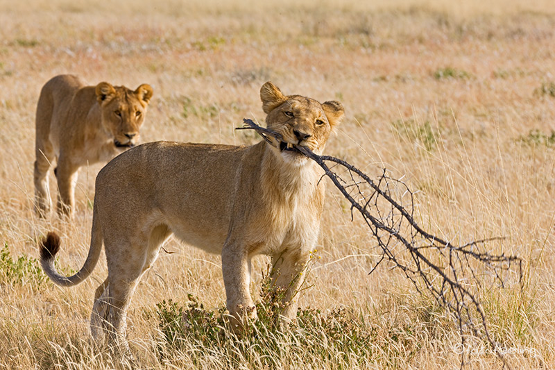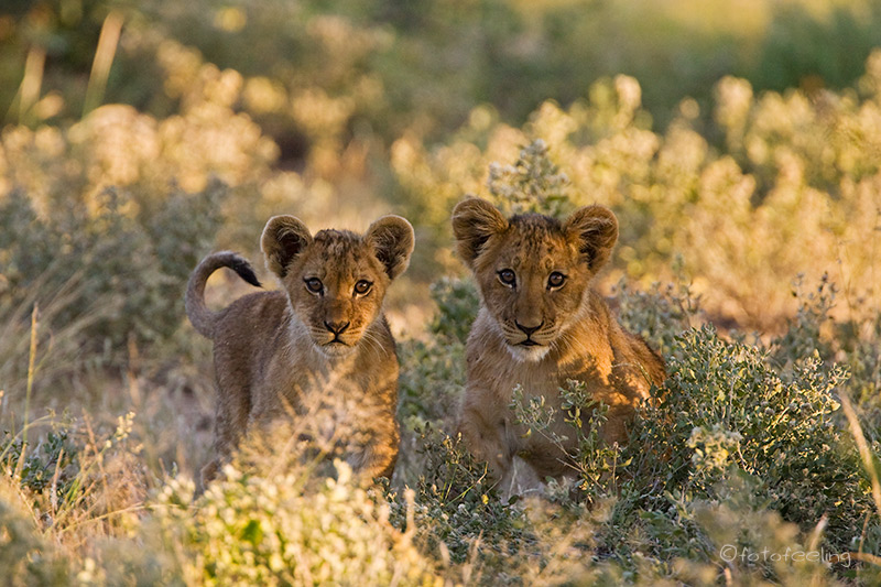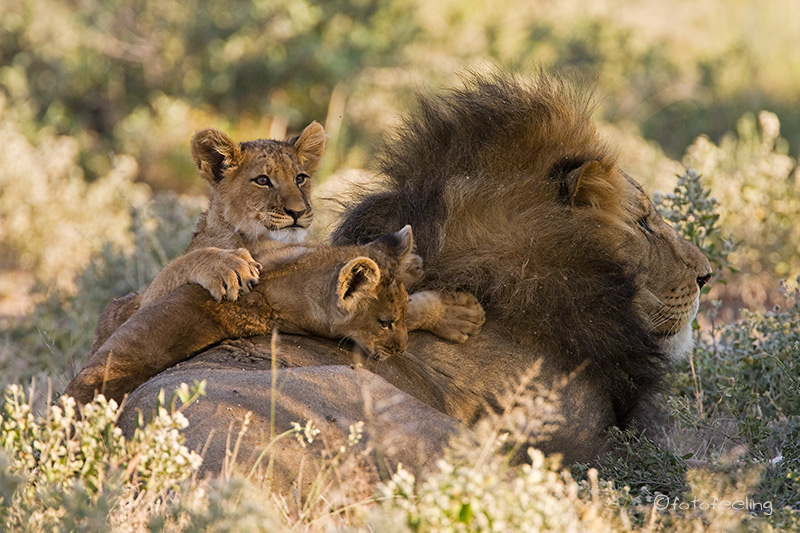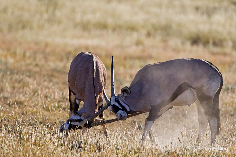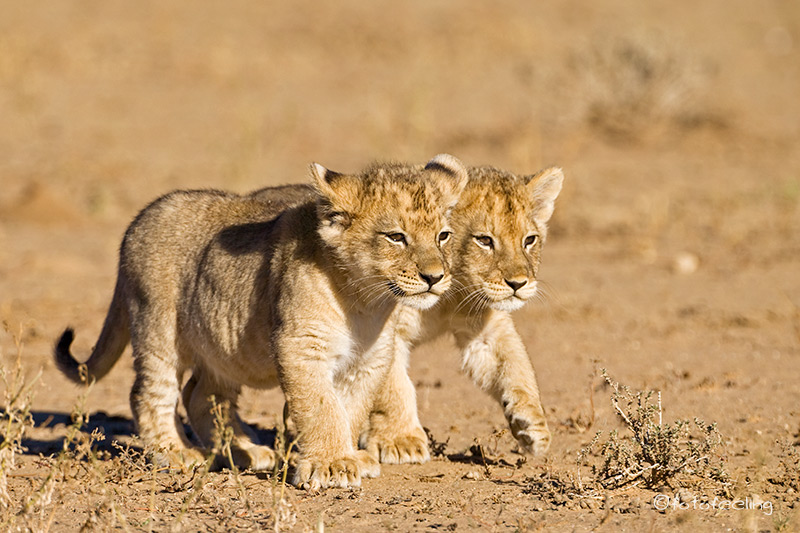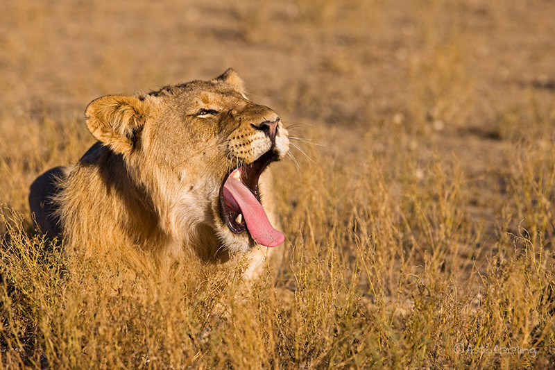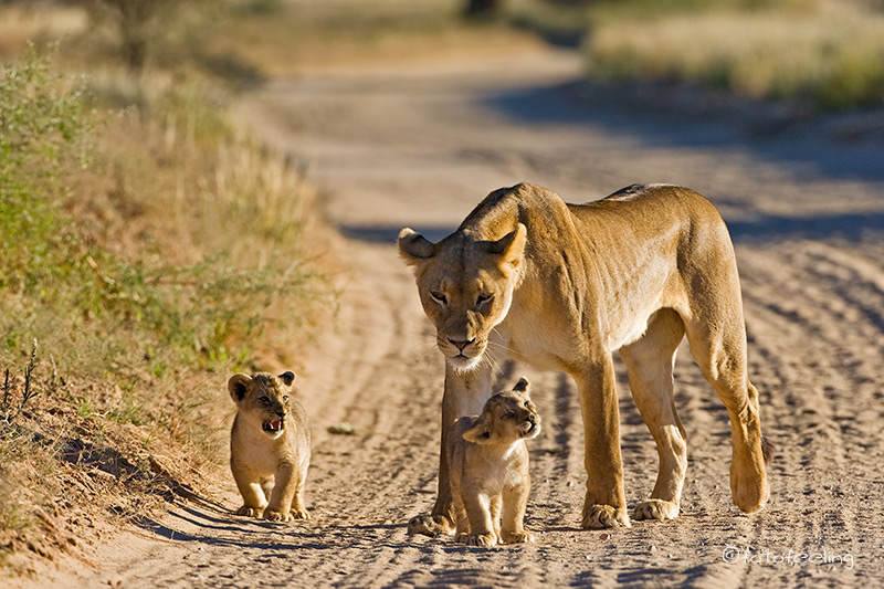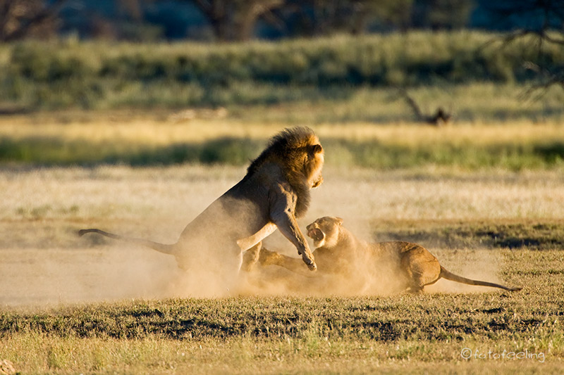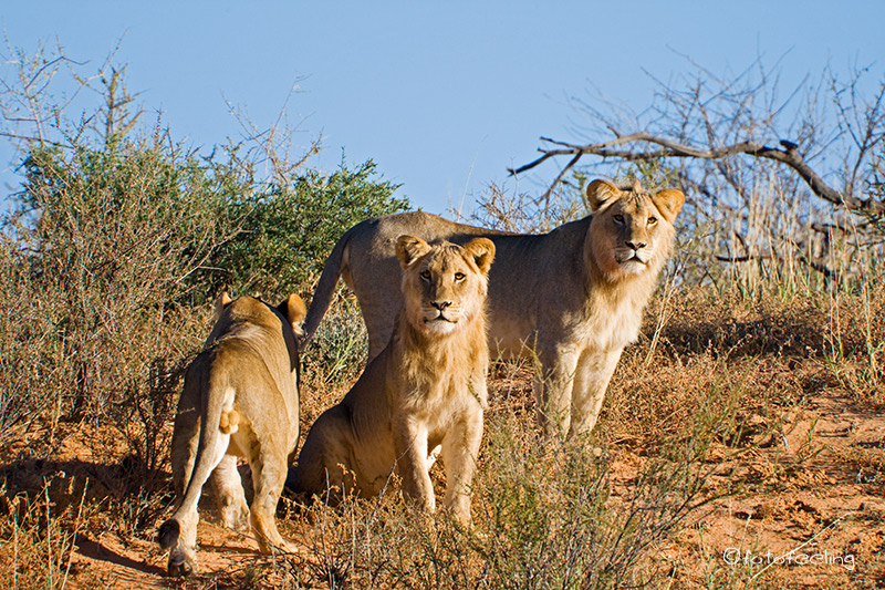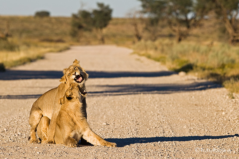 Mit der Morgendämmerung verließen wir unsere Campsite und fuhren langsam in Richtung Melkvlei, da wir ja dort gestern die Löwen beobachten konnten. Wir näherten uns der Stelle vom Vortag, aber es war kein Löwe zu sehen. Angespannt fuhren wir weiter und hielten Ausschau nach der Familie und wirklich, etwas weiter in Richtung Melkvlei sahen wir mehrere große beigebraune Tiere auf der Fahrbahn laufen. Beim Näherkommen erkannten wir unser Paar von gestern und die vier Junglöwen. Wir waren überglücklich. Sie verließen die Fahrbahn und liefen parallel dazu. Das Löwenpaar immer noch von Hormonen getrieben, aber merklich müde und abgekämpft. Die vier Jungs immer den Eltern hinterher. Wir fanden das sehr witzig, nur der Pascha verstand nicht so viel Spaß und brüllte kräftig, wenn die Jungen zu nahe kamen. Durch das Zuschauen hatten die frechen Burschen sich einiges von den Eltern abgeschaut und so saßen auf einmal mitten auf dem Weg zwei Jungs übereinander und der obere biss den darunterliegenden ins Ohr und stellte seine Pfote auf den Bruder. Ein tolles Spiel, das die Eltern da spielten, fanden die zwei und rauften miteinander. Nur warum sie Abstand halten sollten, verstanden sie nicht so recht und versuchten immer wieder, sich dem Paar zu nähern. Irgendwann wurde es den beiden zu viel und sie gingen etwas weiter weg eine Düne hinauf. Die Jungs blieben bei uns. Nun wurde unser Auto mehr als interessant, Papa war ja in der Nähe und wachte über sie, da konnten sie ruhig etwas näher an uns heran kommen. Ehe wir uns versahen, standen drei Löwen um unser Auto herum und schnüffelten an den Reifen und der Motorhaube, schauten immer wieder genau in unsere Fenster hinein und begutachteten uns und unser Auto. Man konnte fast die Gedankengänge der drei erraten, so wie: *kann man damit spielen?* oder *wie bekomme ich dieses runde komisch riechende Ding ab?* Es war köstlich und wir waren mehr als amüsiert. Etwas anders wurde uns, als auf einmal unser Auto anfing, sich wie von selbst zu bewegen. Zwei der Burschen hatten doch tatsächlich angefangen, in unseren Reifen und den Kühlergrill zu beißen. Wir schauten uns erst einmal etwas hilflos an und hofften, dass die Reifen standhielten. Je mehr das Auto wackelte, desto unruhiger wurde Chris und schließlich klopfte er auf das Auto und schimpfte: „Jetzt werde ich aber langsam sauer! Hört sofort auf!!!“ Als ob sie es verstanden hätten, ließen die zwei von dem Auto ab und legten sich neben uns in das Gras. Der dritte Junglöwe hatte sich schon vorher brav neben unser Auto gelegt und Chris meinte zu ihm: „Du bist aber ein ganz Braver!“ Skeptisch schaute ich zu dem Junglöwen, in dessen Augen man schon ein verräterisches Funkeln sehen konnte, aber die anderen beiden fingen wieder an zu raufen und so schenkten wir ihnen unsere Aufmerksamkeit. Ich fotografierte gerade, als ich mich wunderte, dass Chris sich so unruhig im Auto bewegte und meinte zu ihm, dass er still sitzen sollte, da ich ja fotografierte. Er guckte nur komisch und sagte, dass er sich gar nicht bewegt hätte. Ein kurzer Blick in den Rückspiegel bestätigte unseren Verdacht. Da hatte sich doch tatsächlich unser „braver“ Löwe angeschlichen und hing an unserem Reifen. Es war schon erstaunlich, wie kräftig er war, denn mühelos bewegte er unser Auto hin und her, er hatte dabei die Krallen in das weiche Reifengummi geschlagen und versuchte, in die Stoßstange zu beißen. Chris musste leicht anfahren, dann gab auch er sich geschlagen und ging zu den Brüdern auf die Wiese. Nun hatten wir wieder alle drei im Blickfeld und hofften, dass unsere Reifen dem „Angriff“ standgehalten hatten. Der vierte Löwe hatte sich gleich zu Anfang weiter weg an einen Baum gelegt und war somit keine Gefahr für unsere Reifen. Die Zeit verging leider viel zu schnell und schon bald mussten wir uns von den Jungs verabschieden, denn der weite Weg bis nach Mata Mata lag noch vor uns. Ich wäre zu gerne noch einen Tag länger geblieben, aber Chris war gnadenlos und meinte, dass noch so viele Highlights in diesem Urlaub auf uns warteten und wir nicht einfach alles streichen könnten, nur weil es gerade so schön war. Irgendwo hatte er ja Recht, aber wenn ich die Wahl zwischen Landschaft und Tieren habe, siegen bei mir immer die Tiere. Unterwegs erfuhren wir noch, dass kurz vor Rooiputs gerade die Löwin mit den Kleinen war, aber wir hatten so schöne Erlebnisse an dem Morgen, dass wir nicht wirklich traurig darüber waren, die drei verpasst zu haben. Auf dem Weg nach Mata Mata sahen wir immer wieder große Tierherden, aber da es langsam sehr heiß war, hatten sich fast alle Tiere in den Schatten der Bäume zurückgezogen und wir blieben meist auf dem Hauptweg. Einen kleinen Schlenker kurz vor dem Camp wollte Chris dann doch machen und als ob er es geahnt hätte, trafen wir am Wasserloch auf Rolf und Lisa. Es gab wieder viel zu erzählen. Irgendwann fuhren wir jedoch schon ins Camp vor, denn wir wollten mal wieder aus dem Auto heraus. Unterwegs sahen wir einige Autos am Straßenrand stehen und wunderten uns, was sie da sehen wollten. Da fiel uns ein Auto vom Cheetah Trust auf. Wir hielten dort an und der Fahrer (Gus) erzählte uns, dass im Schatten der Bäume zwei Geparde seien. Angestrengt schauten wir durch unsere Ferngläser und wirklich, ein Cheetah hob kurz den Kopf und wir konnten ihn recht gut sehen. Sie waren jedoch sehr weit weg und es war sehr heiß, also fuhren wir doch langsam weiter ins Camp. Dort suchten wir einen schönen Platz am Zaun für unsere beiden Autos und schon bald trafen Rolf und Lisa ein. Wir sicherten alle unsere Bilder auf die Laptops. Nebenbei beobachteten wir eine Gnuherde, die von einem Gnubullen immer wieder daran gehindert wurde, ans Wasserloch zu gelangen. Wir saßen dabei gemütlich im Schatten und ratschten. Am Nachmittag drehten wir noch eine Runde zu verschiedenen Wasserlöchern und konnten dabei einige Löffelhunde aus unmittelbarer Nähe beob