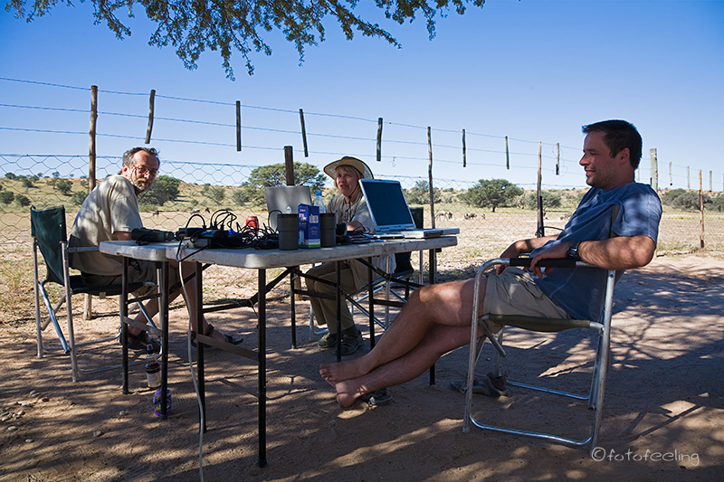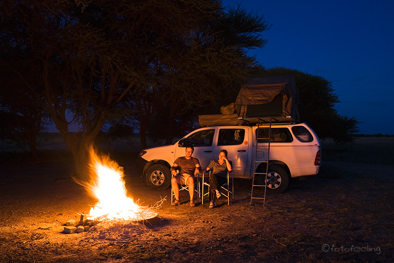 Wir hatten die Nacht überlebt!!! Selbst das Löwenbrüllen hatte keinen wärmenden Effekt und so kletterten wir am Morgen mit immer noch kalten Füßen aus dem Schlafsack und gingen benommen und zitternd zum Zähneputzen. Chris musste sogar die Scheibe vom Eis freikratzen und auch auf dem Zelt lagen glitzernde Eiskristalle. Der heiße Kaffee war eine Wohltat und schon bald stellten wir uns vor das Gate und warteten mit voll aufgedrehter Heizung auf das Öffnen. Rolf und Lisa ließen es etwas gemütlicher angehen, denn sie fuhren an diesem Tag zu einem anderen Camp. Wir fuhren dieses Mal in nördlicher Richtung und entdeckten nach einiger Zeit ein Löwenpaar mit einem erbeuteten Gnu in der Morgensonne. Wir beobachteten die zwei eine Zeit lang und wurden noch Zeuge eines handfesten Ehestreits. Später schleppte der Pascha sein Gnu immer weiter weg und wir fuhren wieder zurück in Richtung Nossob. Unterwegs festigte sich unsere Überlegung, schon an diesem Tag nach Twee Rivieren zu fahren und wir fragten in der Rezeption nach. Es waren noch freie Stellen auf der Campsite und so konnten wir wechseln. In Twee Rivieren war einfach mehr los und wir hofften, dort mehr Glück mit den Löwen zu haben. Unterwegs sahen wir noch eine Löwin an einer erbeuteten Kuhantilope und ein Junges lag unter einem Baum. Aber auch die zwei waren sehr weit entfernt und so fuhren wir weiter in Richtung Twee Rivieren. In Twee Rivieren meldeten wir uns an und machten erst einmal Pause mit Kaffee und leckeren Keksen. Gegen 15.30 Uhr fuhren wir dann eine kleine Runde zuerst in Richtung Mata Mata und dann über die Dünen ins Nossobtal. Bei Kij Kij beobachteten wir einen Schakal, der auf Taubenfang war. Trotz guter Technik und Ausdauer hatte er keinen Erfolg, aber es war spannend, ihm zuzuschauen. Da wir überhaupt kein Anzeichen von Löwen gesehen hatten, wetteten wir zwei. Ich meinte, dass wir an diesem Abend keine Löwen sehen würden und Chris wettete dagegen. Wichtig war, dass die Löwen nicht nur zu sehen, sondern auch gut zu fotografieren sein mussten. Der Gewinner durfte sich ein Essen in einem Lokal seiner Wahl wünschen. Langsam wurde die Zeit knapp und es war an der Zeit, ins Camp zurückzufahren. Chris fragte gerade nach, welches Lokal ich mir denn aussuchen würde, als auf einmal wie aus dem Nichts eine Löwin mitten auf unserem Weg stand und gemächlich in die vom Abendlicht beleuchtete Grasseite spazierte. Sie bot sich uns wunderschön dar und schaute uns an. Zur Krönung kam dann noch eine zweite Löwin und die beiden schlenderten wieder vor uns auf der Straße entlang. Leider war es schon sehr spät und wir mussten zurück. Tja, mein Essen war verloren, aber die zwei waren es wert. Es wurde wieder eine sehr kalte Nacht und komischerweise waren wir die einzigen auf dem ganzen Campingplatz, die ein Feuer hatten. Selbst die Südafrikaner kamen, um sich an unserem Feuer zu wärmen. Das haben wir irgendwie nicht so richtig verstehen können. Egal, uns war warm, denn neben dem kräftigen Feuer hatten wir am Nachmittag unsere dicken Jacken aus der Alukiste geholt und nun saßen wir zufrieden um unser Feuer herum. Chris zauberte an diesem Abend superleckere Rumpsteaks, die außen knusprig und innen saftig waren und wir ließen es uns so richtig gut schmecken. Zum Glück froren wir in dieser Nacht nicht so, aber ich hatte auch vorsorglich über die Decke noch unsere dicken Jacken gelegt. Übernachtung: Twee Rivieren Campsite / Südafrika |