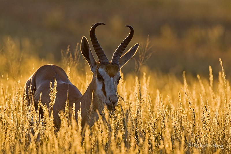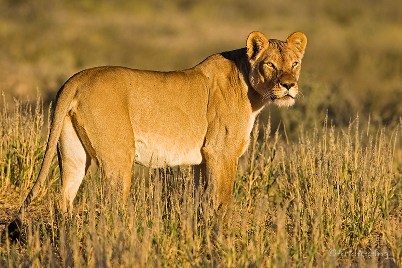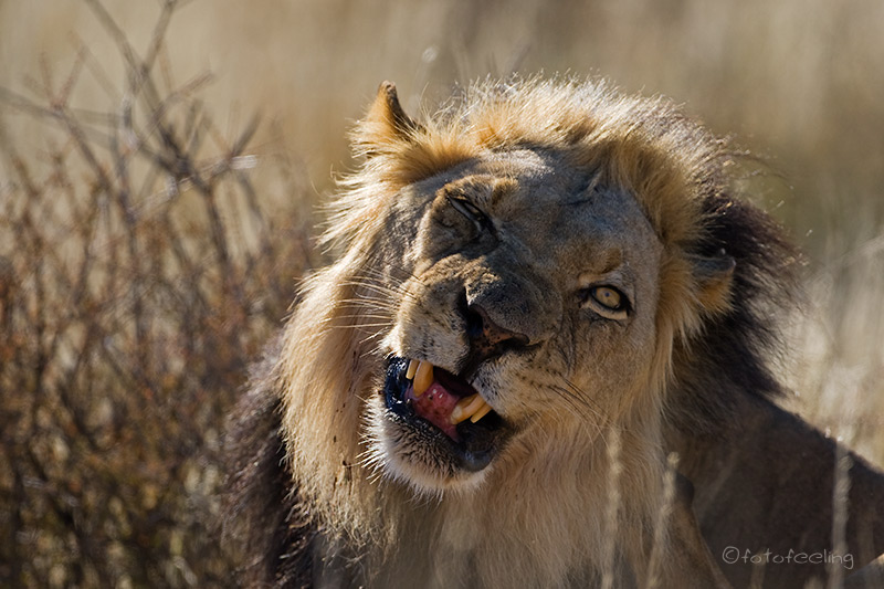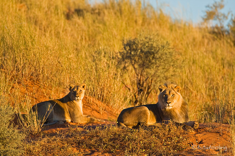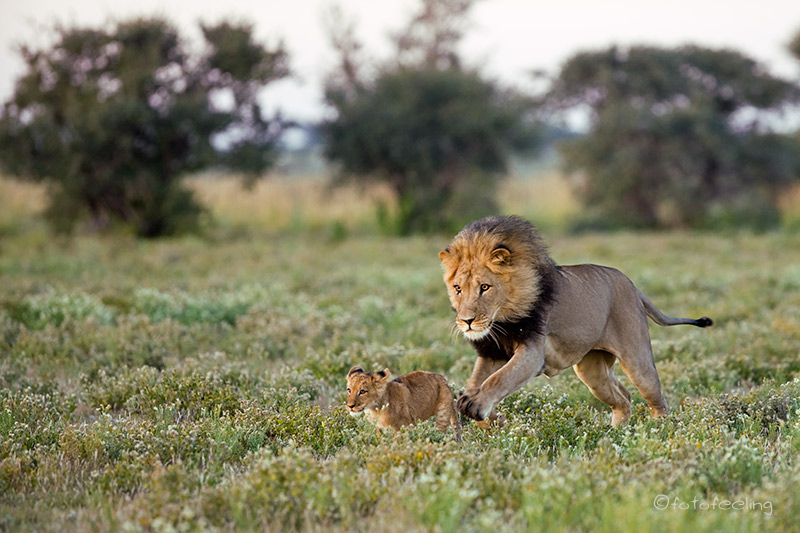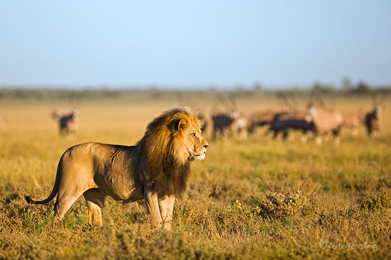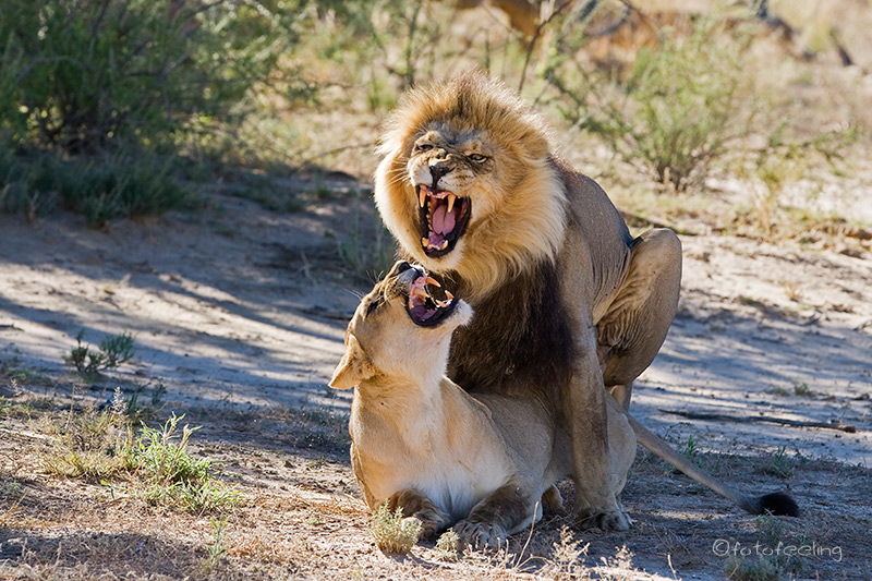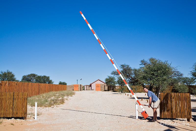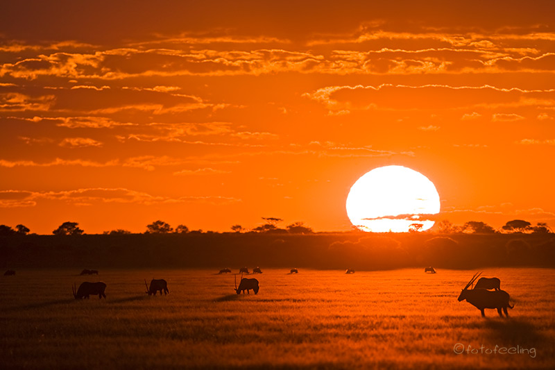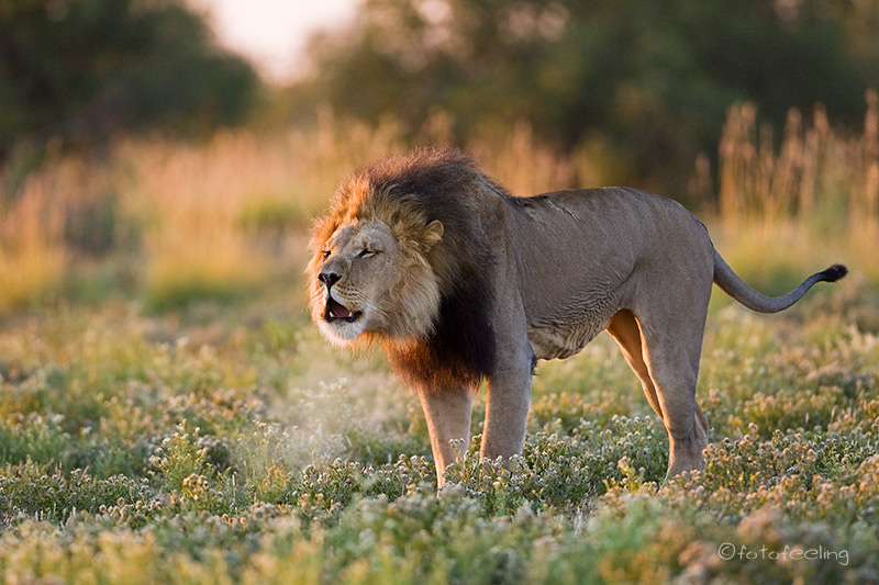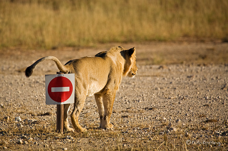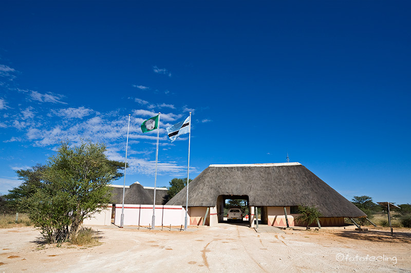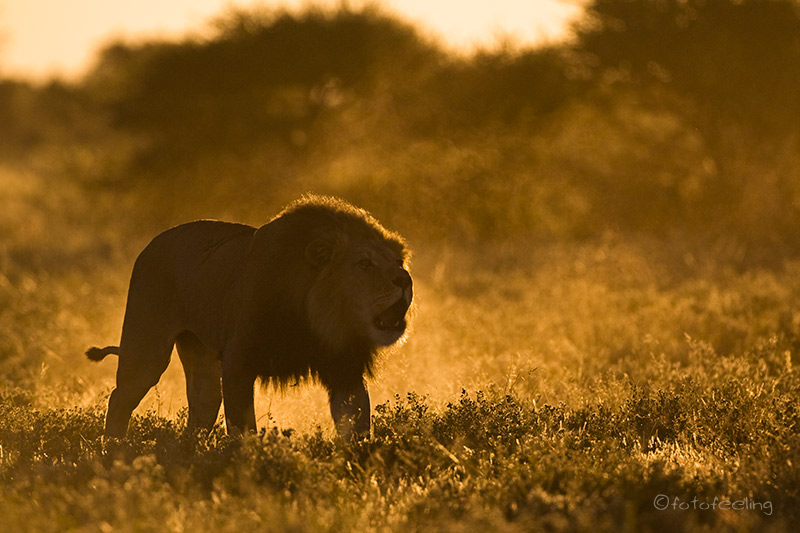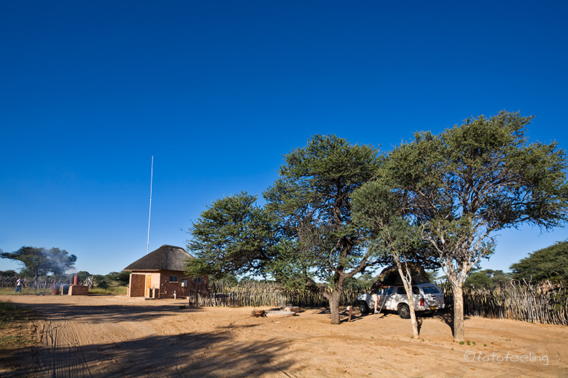 Auch wenn wir die Löwen am Abend nicht mehr gesehen hatten, so erfreuten wir uns nachts an ihren Rufen und wir wussten, dass sie die Pan nicht verlassen hatten. Am frühen Morgen machten wir uns noch einmal auf die Suche. Nichts! Etwas enttäuscht wollten wir gerade zurück zur Campsite fahren, als wir ein lautes Brüllen hörten und der Pascha im frühen Gegenlicht direkt auf uns zukam. Wir waren überglücklich, dass wir so nett verabschiedet wurden und durften den Kalaharilöwen noch eine ganze Zeit bei der Revierpflege bewundern. So markierte er Büsche und hinterließ seinen Duft, brüllte noch einmal und baute sich dann stattlich vor einer Herde Oryxantilopen auf. Irgendwann geht leider auch die schönste Zeit vorbei und wir mussten aufbrechen. Von den anderen Pans fiel der Abschied schon schwer, aber diesmal wurde mir so richtig schwer ums Herz und sehr still fuhren wir auf den tief ausgefahrenen Spuren in Richtung New Tsau Gate. Mittags waren wir in Ghanzi, kauften ein und bekamen endlich Pula in der Bank. Auch unser Auto wurde mit Diesel versorgt. Gegen 13 Uhr machten wir uns dann auf den Weg nach Kang. Dort erreichten wir gegen 16.30 Uhr die Kalahari Rest Lodge und waren wiederum begeistert von dem schönen Campingplatz mit Schatten und fester Feuerstelle. Auch für Strom war gesorgt und so konnte unser Kühlschrank mal wieder so richtig durchkühlen, aber auch die Sicherung unserer Bilder war endlich möglich. Es wurde ein gemütlicher langer Abend, an dem wir immer wieder an unsere Löwen denken mussten und uns über unser „tierisches“ Glück gefreut haben. Tageskilometer: 508 km Übernachtung: |