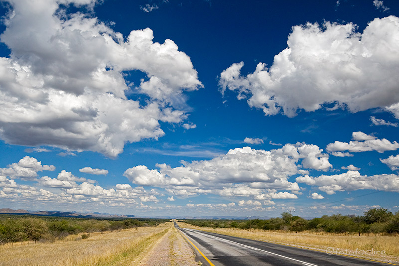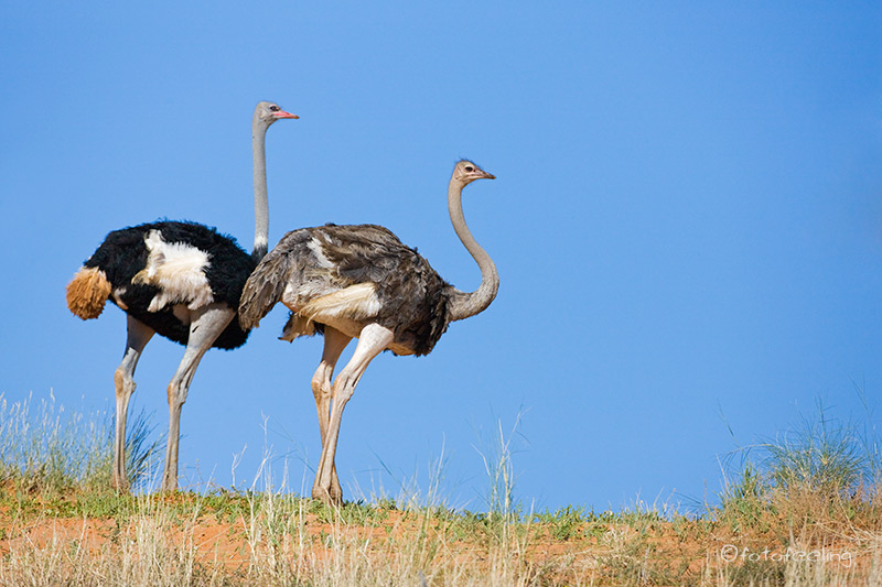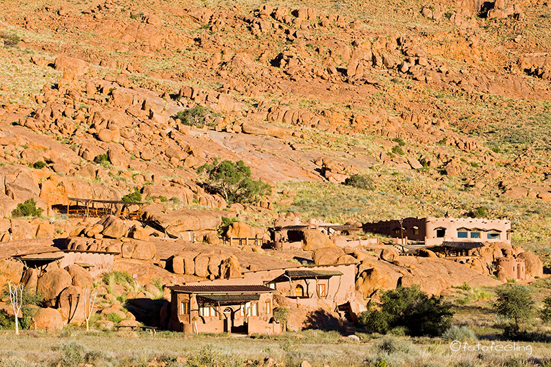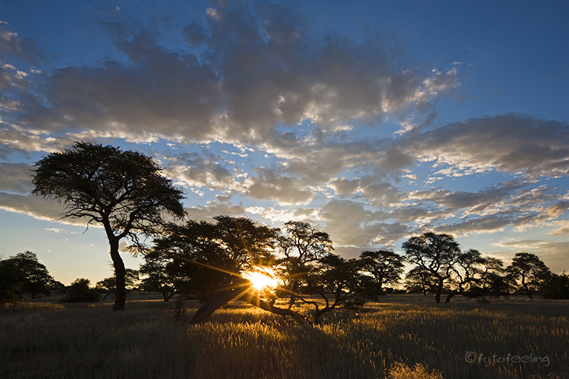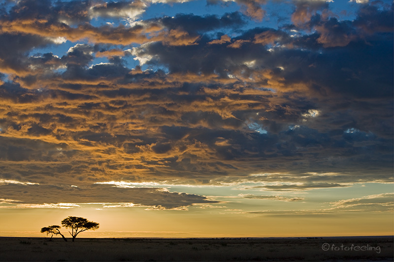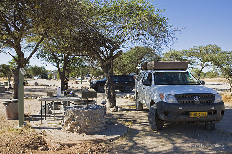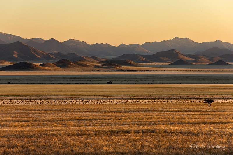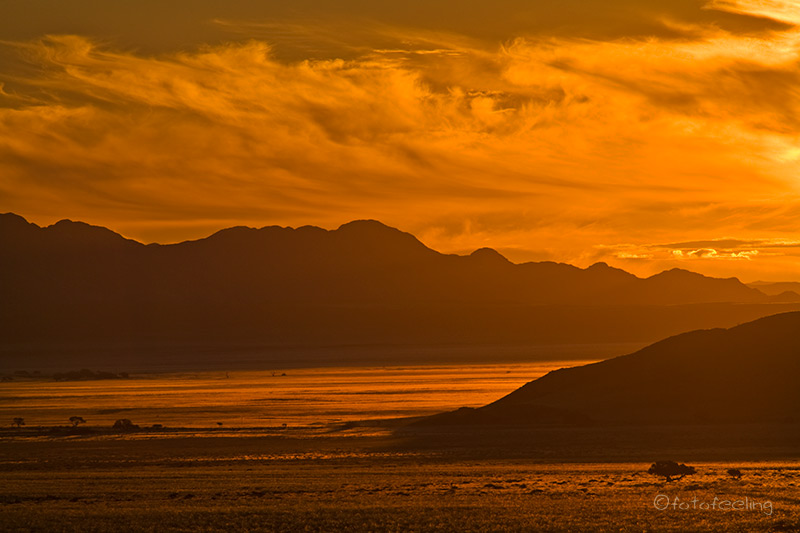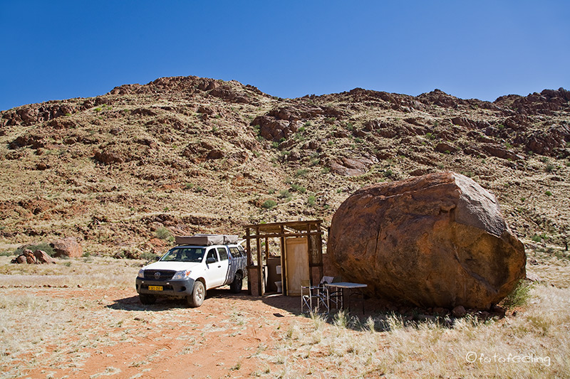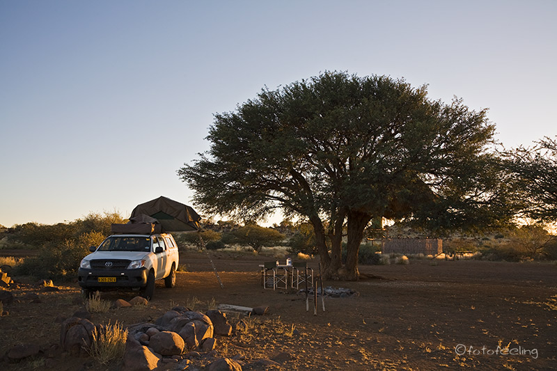 Am nächsten Morgen waren die Schmerzen zum Glück weg und ich konnte wieder ohne Probleme tief ein- und ausatmen. Wir frühstückten gemütlich und fuhren dann mit einigen Fotostopps vor zur Farm. Leider darf man sich auf den vielen Straßen des Farmgeländes nicht frei bewegen, aber wir hielten auf dem Weg bei schönen Motiven an. Beim Farmhaus angekommen quatschten wir noch lange mit Hermi und Marlene bei einer Tasse Kaffee. Dabei erzählte uns Hermi, dass er eigentlich mehr auf Luxustouristen aus ist und die Campsites auch sehr individuell und dementsprechend teuer werden. Die Rundfahrten werden auch nur für die Bewohner seines Hauses sein und nicht für den normalen Camper. Auf seiner Farm will er auch T-Shirts bedrucken und Karten von Kanaan herstellen, dazu baut er gerade um. Er wird sicher ein gutes Geschäft damit machen, denn die T-Shirts, die er uns zeigte, treffen sicherlich den exklusiven Geschmack seiner Luxustouristen. Irgendwann verabschiedeten wir uns und fuhren zu unserem nicht weit entfernten Ziel, der Ranch Koiimasis. Anke begrüßte uns wie immer sehr nett und da wir die ersten Besucher an diesem Tag waren, bekamen wir unsere Lieblingscampsite. Wir fühlten uns gleich wieder heimisch und verbrachten bis zum Nachmittag erholsame Stunden im Schatten unserer idyllischen Campsite. Endlich kam ich auch einmal zum Wäsche waschen und Fußmatten ausschütteln. Nach dem Kaffee fuhren wir zur Farm vor und schauten mal wieder bei den Straußen vorbei. Danach ging es zum Köcherbaumwald und zum Sonnenuntergang kletterten wir mit Fotoausrüstung, Stativen und Getränken bewaffnet die Felsen hinauf zur Vogeltränke. Leider waren auch an diesem Tag keine Fotowolken am Himmel, aber es war trotzdem schön, die Sonne hinter den Bergen verschwinden zu sehen. Kaum war die Sonne weg, wurde es auch schon wieder sehr kühl und wir fuhren zurück zu unserer Campsite. Dort grillten wir und ließen den Urlaubstag gemütlich am Feuer ausklingen. Tageskilometer: 45 km |
