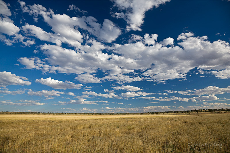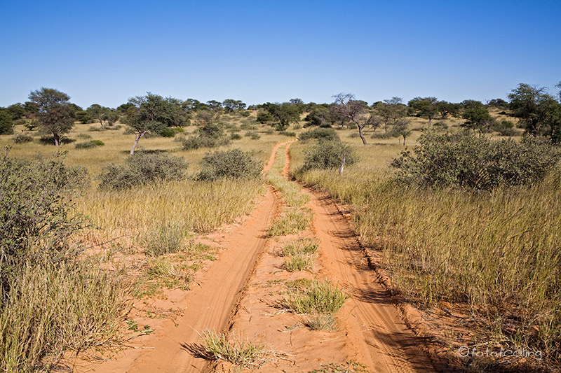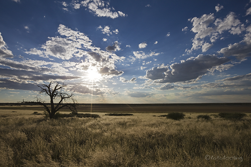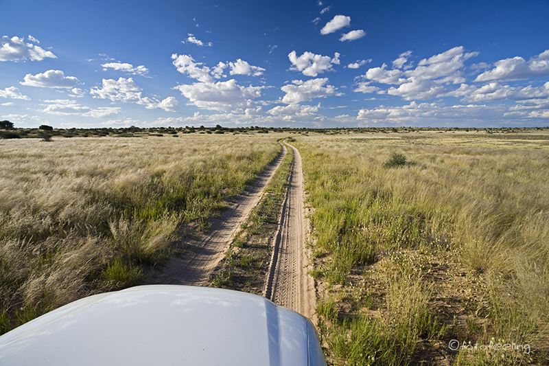 Um 5 Uhr früh klingelte der Wecker und schon bald waren wir mit dampfendem Kaffee in unseren Thermobechern wieder auf dem Trans-Kalahari-Highway unterwegs. In Kang betankten wir noch einmal unser Auto und auf ging es nach Mabuasehube, den botswanischen Teil des Kgalagadi Transfrontier Park. Wir starteten schon so früh, da wir nicht wussten, wie der Weg in den Park war und wir wollten natürlich noch die Kühle des Morgens und den festen Sand ausnutzen. Schon am Morgen hatte unser Auto ein sehr eigenwilliges lautes Quietsch-Geräusch beim Starten gemacht und Chris hielt noch einmal unterwegs an und schaute in den Motorraum. Er konnte nichts weiter feststellen, aber leider änderte sich auch nichts an dem Geräusch und er vermutete, dass der Anlasser die Ursache war. Kurz hinter dem Ort Hukuntsi endete die Teerstraße und wir mussten auf die Piste. Aber erst einmal fuhren wir am richtigen Weg vorbei, denn wir rechneten nicht damit, dass die zwei Tiefsandfahrspuren in ein Flussbett hineinführten. Aber unser GPS blieb hartnäckig und so fuhren wir in eine Fahrspur und folgten ihr über 50-60 km, die zum Teil ziemlich sandig und sehr ausgefahren waren. Trotzdem war der Weg kein Problem und wir fuhren ihn mit 2x4, da der Sand noch sehr kalt war und es auf der Strecke wohl erst geregnet hatte. Danach wurde die Fahrspur besser und wir lernten auch, dass man in dieser Gegend die Kurvenzeichen durchaus ernst nehmen sollte. Denn Chris fuhr ziemlich flott und so schlitterten wir regelrecht durch eine fast 90° Kurve und kamen auf der Gegenspur zum Stehen. Wir schauten uns ziemlich verblüfft an. Zum Glück war ja kein Verkehr auf dieser Strecke, aber das hätte auch schiefgehen können. Danach nahmen wir die Kurvenzeichen sehr ernst und standen trotzdem schon um 10 Uhr vor dem Eingangstor von Mabuasehube. Die Abfertigung verlief auch hier sehr schnell und problemlos und schon bald waren wir im Park unterwegs. Die Schäfchenwolken der Zentralkalahari hatten uns begleitet und bildeten einen sehr schönen Kontrast zum roten Kalaharisand und zur grünen Umgebung. Gegen die tierreiche Zentralkalahari war es hier geradezu tierarm, aber bei genauerem Hinsehen konnte man auf den Pfannen einzelne Springböcke und Oryx erkennen. Außerdem war es in diesem Teil der Kalahari sehr trocken. Wir schauten uns ein paar Pans an und fuhren dann zu unserer gebuchten Campsite an der Mpayathutlwa Pan. Dort machten wir erst einmal Pause und genossen die schöne Aussicht über die Pfanne. Später duschten wir mit unserer wirklich praktischen Solardusche und genossen unseren Nachmittagskaffee unter unserem Schattendach. Am Nachmittag machten wir noch eine Runde zur Lesholoago Pan und fühlten uns gleich wieder heimisch. Diese kleine Pfanne ist irgendwie etwas Besonderes für mich und ich bereute es ein wenig, hier keine Nacht gebucht zu haben. Viele Tiere sahen wir dort auch nicht und so fuhren wir langsam wieder zurück zu unserer Pan. Den Sonnenuntergang verbrachten wir auf unserer Campsite und genossen das warme Licht und diese unfassbare Ruhe. Der Abend kam schnell. Beim letzten Besuch auf dieser Campsite hatte ich ganz schön Angst und konnte mich noch zu gut an die Runden mit dem Strahler erinnern. Diesmal war jedoch alles anders, denn der fast schon volle Mond beleuchtete die Umgebung und wir konnten selbst in weiterer Entfernung noch gut genug die Umrisse erkennen. Tageskilometer: 305 km Übernachtung: Mpayathutlwa Campsite 2 / Botswana |
