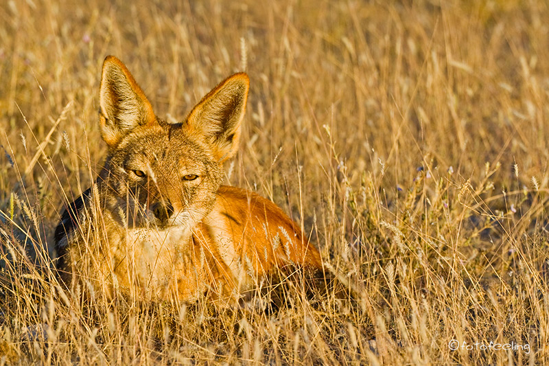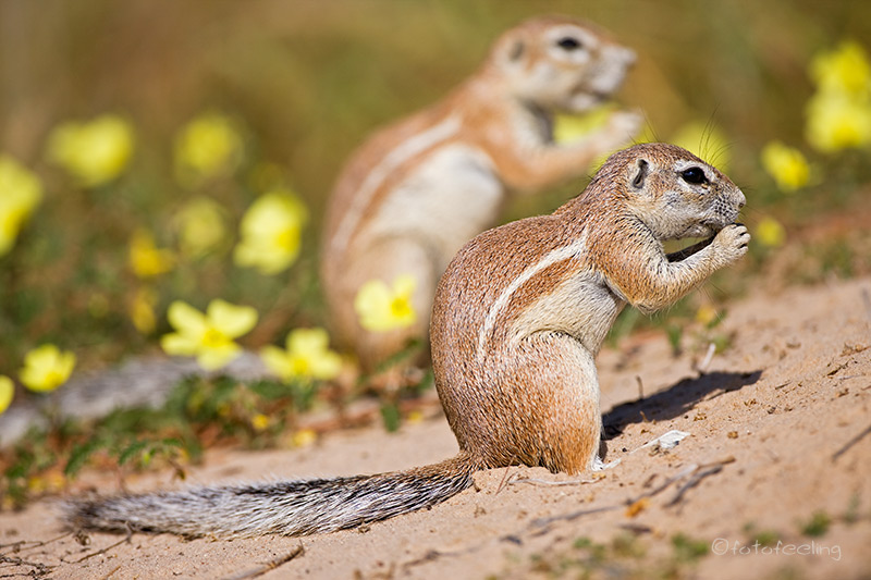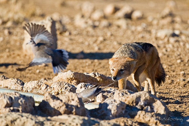 Wieder einmal hörten wir die Löwen sehr nah und dementsprechend deutlich. Sie mussten zwischen den zwei Campsites sein. Natürlich fuhren wir, kaum dass man etwas sehen konnte, in der Hoffnung los, endlich einmal die Löwen auch anzutreffen, die wir so gut gehört hatten, aber leider blieb es wieder einmal bei dem Wunsch. Wir versuchten wirklich alles und pendelten zwischen den Campsites hin und her. Unsere Nachbarn hielten uns sicher für völlig durchgedreht oder panisch vor Angst, als wir gleich mehrmals an ihrer Site vorbeirasten. Aber bis auf frische Löwenspuren, war von den lautstarken Katzen nichts zu sehen. Vor lauter Verzweiflung umrundeten wir dann noch unsere Pan, aber auch das brachte nichts. So entschlossen wir uns zu unserer neuen Campsite an der Mabuasehube Pan zu fahren und dort zu frühstücken. Vorher schauten wir uns noch die Khiding Pans an, die uns auch recht gut gefielen. Gegen 9 Uhr waren wir dann auf unserer Campsite. Zur Feier des Tages gab es Eier mit Speck, das war echt lecker. Während des Essens lernten wir dann auch gleich unsere neuen Nachbarn kennen. Eine Familie Erdhörnchen hatte sich auf unserer Campsite häuslich niedergelassen und genoss sichtlich die Vorteile der Nachbarschaft, denn wenn wir uns sehr ruhig verhielten, kamen sie unter unser Schattendach und suchten nach Brotresten und anderen essbaren Sachen. Natürlich mussten sie gleich für ein Shooting herhalten, denn diese kleinen netten Gesellen waren kaum scheu und sehr kooperativ. Mittags machte Chris dann den von mir gewünschten Pizzateig und wir ließen ihn während unserer Nachmittagsrunde erdhörnchensicher auf der Campsite stehen. Am Abend ließen wir uns unsere Pizza mit Thunfisch und Schinken gut schmecken und genossen etwas wehmütig unsere letzte Nacht in der Freiheit ohne Zäune und Einschränkungen – dachten wir zu dem Zeitpunkt jedenfalls. Ein Schakal leistete uns am Lagerfeuer Gesellschaft und blieb solange bei uns, bis wir ins Zelt gingen. Zum Glück hatte der „Fastvollmond“ ihn rechtzeitig beleuchtet, so dass ich keinen Herzinfarkt bekam, als er bei uns auftauchte. Übernachtung: Mabuasehube Campsite 2 / Botswana |