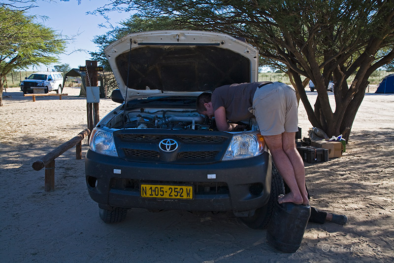 Am Morgen verabschiedeten wir uns von den beiden und fuhren auf Gamedrive, in der Hoffnung, am letzten Tag noch ein paar besondere Situationen festzuhalten. Weit kamen wir jedoch nicht, als auf einmal ein Mann vor unser Auto auf die Straße sprang. Chris dachte gleich an eine Polizeikontrolle, aber nach dem ersten Schreck erkannten wir Gus vom Cheetah Trust. Er fragte uns, ob wir ihm helfen könnten, da seine Batterie den Geist aufgegeben hatte und sein Auto keinen Ton mehr von sich gab. Da er nicht auf der „normalen“ Straße stand, mussten wir noch querfeldein fahren. Zum Glück hielten unsere Reifen den kleinen Dornen der Sträucher stand. Gus hatte schon seine Starterkabel herausgesucht und Chris machte sich gleich an die Arbeit, aber auch mit allen Tricks der Wiederbelebung tat sich gar nichts. Etwas hilflos und verwirrt schauten wir uns alle an, da kam Chris auf die Idee, mal die Kabel zu überprüfen – natürlich war das Kabel kaputt und der Stecker hatte keinen Kontakt. Chris kürzte es etwas, jetzt sollte es aber gehen. Wieder nichts. Das konnte doch nicht wahr sein. Chris prüfte wieder das Kabel, okay, die andere Seite war auch hin. Nun blieb uns nichts mehr weiter übrig, als unsere Rücksitzbank abzuräumen, was dank der ganzen Fotoausrüstung und anderer diverser Sachen, die wir schon seit einiger Zeit nicht mehr gesehen hatten, relativ viel Zeit in Anspruch nahm, aber dann endlich konnten wir die Bank hochklappen und unser Kabel herausholen. Nächster Versuch, wir hielten fast schon den Atem an und dann endlich sprang der Landi an. Erleichtert verabschiedeten wir uns nach ca. 45 Minuten und beschlossen noch ein paar Wasserlöcher abzufahren. Weit kamen wir jedoch nicht, denn kurz nachdem wir wieder auf dem offiziellen Weg waren, beobachteten wir übermütige Oryxbullen, die spielerisch miteinander kämpften. Danach sahen wir noch einige Autos am Wegrand stehen und entdeckten einen alten Löwen, der auf einer Düne lag und sich von der Morgensonne den Bauch wärmen ließ. Etwas später war er dann nahe der Straße im hohen Gras und wurde von etwa 20 Autos umzingelt. Die meisten Leute stellten nicht einmal den Motor ab und so musste der Arme auch noch die ganzen Abgase einatmen. Es war fürchterlich. Wir konnten nur zu gut verstehen, dass es ihm irgendwann reichte und er in den Büschen verschwand. Schnell löste sich der Kreis der Schaulustigen auf und wir beschlossen, zurück zum Camp zu fahren. Die Zeit in der Kalahari war leider viel zu schnell verflogen und fast widerwillig fuhren wir zur neuen Grenze in Mata Mata. Die Abfertigung verlief absolut problemlos und schon waren wir wieder in Namibia unterwegs. Zum Glück führte uns die Straße über zahlreiche rote Sanddünen, denn so konnten wir noch einmal die schöne Landschaft der Kalahari genießen. Schlimm war jedoch dass so viele überfahrene Tiere den Weg pflasterten. Zwei Schlangen, einen Löffelhund, einen Waran und einen Hasen hatte es leider erwischt. Wir fragten uns schon, was wohl als nächstes käme, aber zum Glück wurden es nicht noch mehr Tiere. Dafür kam uns nach einem Dünenkamm ein rasendes Fahrzeug entgegen und es knallte fürchterlich, als ein aufgewirbelter Stein auf unserer Scheibe landete. Mist!!! Natürlich hatte es einen Steinschlag gegeben und die Scheibe hatte einen Sprung. Ich ärgerte mich gleich noch viel mehr als Chris, aber das änderte nichts, die Scheibe war und blieb kaputt. Zum Glück war der Einschlag nicht in unserem Gesichtsfeld und beeinträchtigte uns nicht weiter. Chris meinte nur beruhigend: „Jetzt ärgert uns kein weiterer Steinschlag mehr! Die Scheibe müssen wir sowieso bezahlen.“ Da hatte er auch wieder Recht. Das Landschaftsbild änderte sich während der Fahrt und so kamen nach der Dünen-, Berg- und Talfahrt bald felsige Berge mit zahlreichen Köcherbäumen. Wir näherten uns unserem Tagesziel, der Farm Mesosaurus. Dort angekommen lernten wir unseren sehr netten Gastgeber kennen und fragten gleich nach dem Bushcamp. Er druckste etwas herum und meinte, dass wir dort gerne campen könnten, aber dass es dort momentan leider kein Wasser gäbe. Für uns war das nach der Kalahari kein Problem, obwohl wir es sehr schade fanden, denn im Bushcamp gab es Toiletten und Duschen. Wir fuhren später noch einmal zum Duschen zur Rezeption und verabredeten uns für den nächsten Tag zur Fahrt zu den Mesosaurus Fossilien. Das Bushcamp war einsam und sehr schön inmitten von Hügeln mit zahlreichen Köcherbäumen gelegen. Aber irgendwie war nach der Kalahari bei uns die Luft raus und wir taten uns unheimlich schwer das Gelände zu erkunden. Wir fuhren verschiedene Off-Road-Wege ab und bewunderten die Hügellandschaft mit den schönen Köcherbäumen. Es waren unendlich viele. Besonders gut gefiel uns ein dicker Köcherbaum mit einem Webervogelnest, aus dem die Siedelwebervögel hinaus- und wieder hineinflogen. Der Sonnenuntergang war leider auch nicht sehr farbenfroh und nur ein kleiner gelber Streifen lag über dem Horizont. Ein einsamer Köcherbaum machte sich trotzdem recht gut und der Sundownerdrink schmeckte natürlich. Wir verbrachten einen gemütlichen Abend am Lagerfeuer und trauerten noch ein wenig unseren Löwen nach. Doch der klare Sternenhimmel tröstete uns und schon bald waren wir neu motiviert und freuten uns schon auf die nächsten Tage. Tageskilometer: 250 km Übernachtung: |
