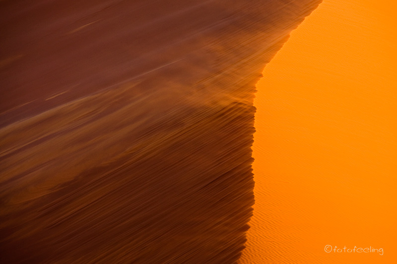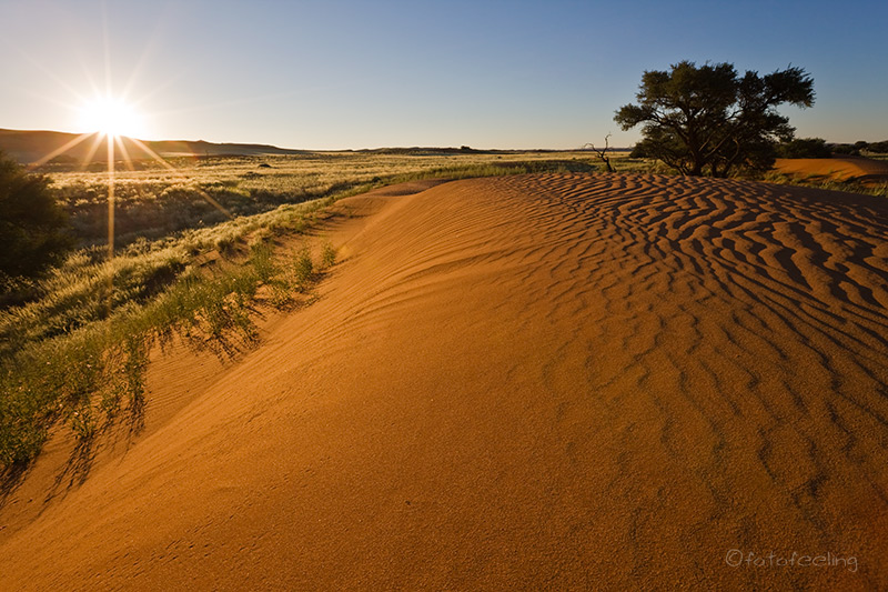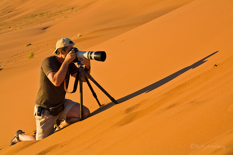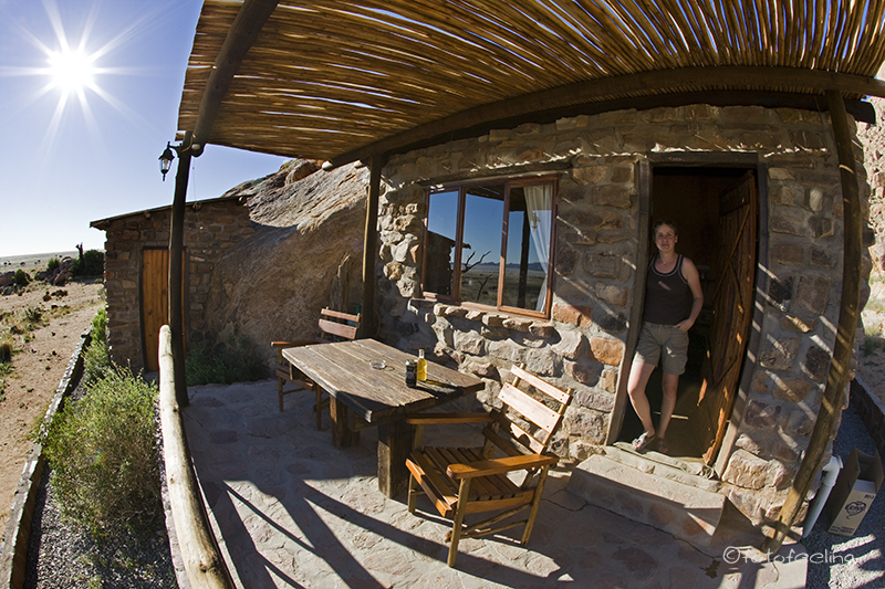 Natürlich fuhren wir zum Sonnenaufgang noch einmal zur Pferdetränke nach Garub, obwohl uns schon gesagt wurde, dass die Pferde momentan nur nachmittags an der Tränke waren. Wie vorhergesagt, ging die Sonne auf, ohne dass sich ein Pferd blicken ließ, aber ganz weit weg in der Ferne konnten wir ein paar Tiere erkennen. Wir warteten und warteten, irgendwann sah es so aus, als ob ein paar Pferde in unsere Richtung kämen, aber in dem hügeligen Gebiet konnten wir sie nicht so recht im Auge behalten. Ca. um 7.30Uhr wollte ich aufgeben, da meinte Chris: „Etwas warten wir noch!“ und tatsächlich kamen fast in diesem Moment die ersten drei Pferde auf die Tränke zu und es wurden immer mehr. Sie tranken gemütlich Wasser und kamen immer weiter auf uns zu, um zu grasen und sich im Sand zu wälzen. Man sah richtig, wie gut es ihnen in ihrer Freiheit ging. Irgendwann standen einige Pferde um unser Auto herum und beschnüffelten es, Chris hatte etwas Angst um unsere Gummidichtungen und Scheibenwischer und ging vorsichtig näher. Aber die Pferde ließen sich durch ihn gar nicht stören. So holte er sich seine Kamera mit einem Weitwinkelobjektiv und stand schon bald zwischen den Pferden. Eins kam sogar so nah an ihn heran, dass es mit den weichen Nüstern seine Hand berührte. Es war wirklich ein tolles Erlebnis. Witzig war auch, dass die Pferde unsere Autoscheibe ableckten und den hölzernen Beobachtungsstand anknabberten. Es kamen immer mehr Pferde und wir zählten etwa 50 Tiere. Leider verging die Zeit wie im Fluge und wir mussten aufbrechen, da wir noch in Klein Aus Vista frühstücken wollten. Das Frühstück war sehr reichhaltig und bot alles, was man sich so vorstellen kann, von Müsli über Wurst und Käse bis zu Rühreiern mit Speck und Bohnen. Hinzu kam ein sehr schöner Ausblick vom Restaurant über das Farmgelände. Diese Gästefarm können wir nur wärmstens empfehlen, genau wie den Campingplatz, den wir uns an diesem Morgen noch angeschaut hatten. Zurück in unserem Fred-Feuerstein-Häuschen packten wir etwas wehmütig unsere Sachen zusammen. Es hatte uns hier super gefallen und wir würden bestimmt wiederkommen. Über die schöne Straße 707 fuhren wir am Namibrand entlang bis zu unserem Tagesziel, der Farm Kanaan. Dort waren wir mittags und wollten unsere Luxuscampsite beziehen. Leider sei sie nicht fertig geworden, aber wir könnten zum gleichen Preis im Haus schlafen, meinte Marlene. Hmmmm, wir hatten so viel Fleisch dabei und wollten eigentlich mal wieder campen und allein sein. Also beschlossen wir, uns die Campsite anzuschauen. Marlene beschrieb uns den Weg zu Johann, der die Campsite baut, aber durch eine schlimme Armentzündung nicht rechtzeitig fertig geworden ist. Mit ein wenig Intuition und der guten Wegbeschreibung fanden wir schließlich Johanns Camper, aber leider war niemand da. Wir klopften und riefen, aber niemand öffnete uns. Chris meinte, dass er weiter vorne einen Weg gesehen hätte und es dort sicherlich zur Campsite ginge und er hatte Recht. An einem großen allein stehenden Felsen fanden wir eine Dusche und eine Toilette, alles war noch ganz neu und roch nach frischem Zement. Wir beschlossen zu bleiben und kurze Zeit später kam Johann angefahren. Ein sehr bescheidener netter Mann, der sich gleich entschuldigte und sagte, dass die Campsite noch nicht fertig sei und was er noch geplant hätte. Chris riet ihm, noch ein Sonnendach für die Campsite und das Auto zu bauen, denn schon jetzt im April brannte die Sonne mittags gnadenlos und man konnte es nur im Schatten aushalten. Da uns Hermi (der Farmbesitzer) eine Dünenfahrt angeboten hatte und wir nicht nur auf dem Farmgelände an der Campsite sitzen wollten, fuhren wir nachmittags zu ihm vor und starteten auch gleich. Da er selber Fotograf ist, zeigte er uns ein paar seiner Lieblingsplätze, aber wir hatten wieder Pech und nicht eine Fotowolke war am Himmel. Als wir dann zu den Dünen kamen, war leider das Licht schon fast weg, aber es war trotzdem unheimlich schön, über die roten Sanddünen in das weite Land seiner Farm zu schauen. Hermi raste mit uns über die Dünen und es machte wirklich Spaß, aber leider sah mein Rücken das anders und ich konnte am Abend nur noch unter Schmerzen atmen. So schmeckte auch das Essen nicht und wir gingen bald ins Bett. Tageskilometer: 158 km Dünenfahrt: 300 N$ p.P. |