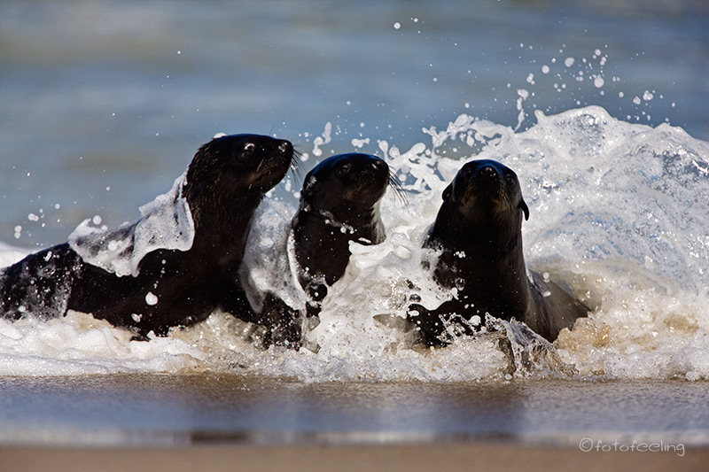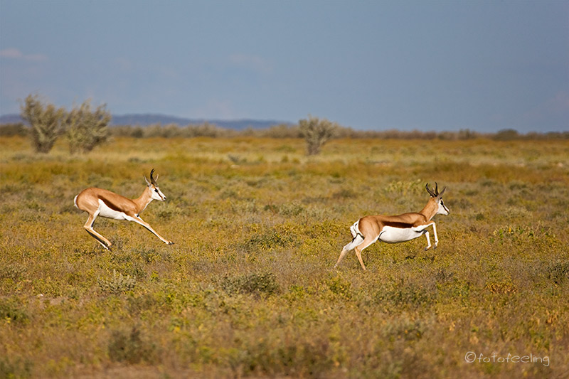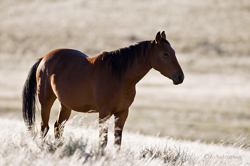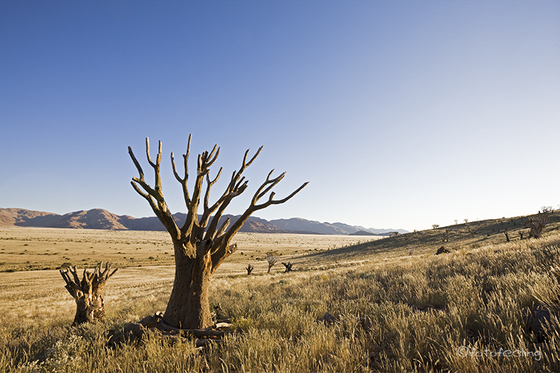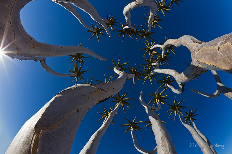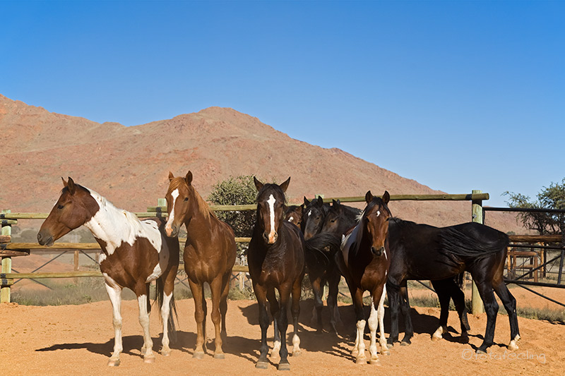 Schon vor Sonnenaufgang waren wir auf dem Weg zum Köcherbaumwald. Unterwegs sahen wir eine Pferdeherde, die frei auf dem Farmgelände lebt. Sie raste an uns vorbei und auf der anderen Straßenseite weiter an den Bergen entlang. Wir kamen uns vor als wären wir in einem kitschigen Western gelandet. Es war ein unheimlich schöner Anblick, die ungezügelte Lebensfreude der „Mustangs“ sehen zu dürfen. |