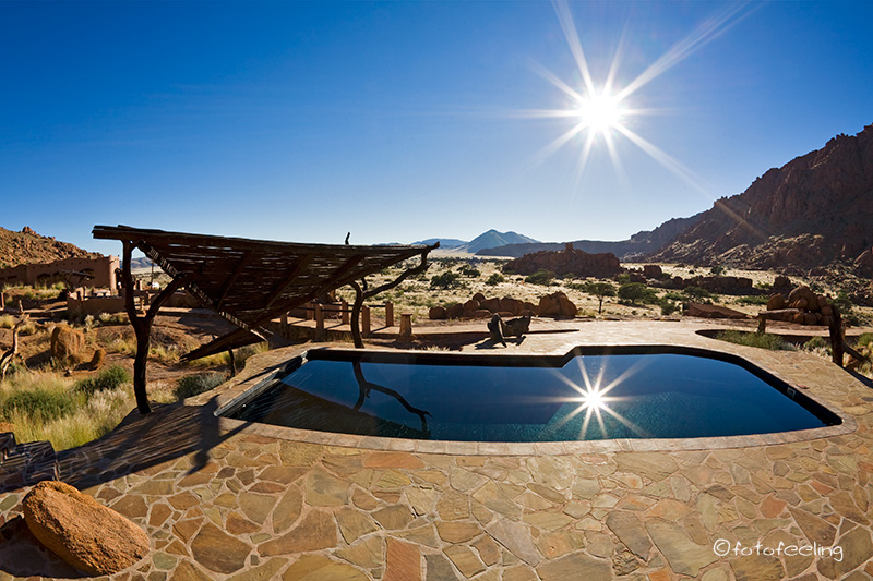 Es war zwar schön, wieder einmal in einem Bett zu schlafen, aber komischerweise haben wir bisher in unserem engen Zelt, das wir ja auch noch mit der Fotoausrüstung teilen müssen, einfach besser geschlafen. So wachten wir relativ früh auf und genossen den Luxus einer heißen Dusche am Morgen. Wie sollte es auch anders sein, wir waren mal wieder die Ersten beim Frühstück und dabei hatten wir uns wirklich Zeit gelassen. Das reichhaltige und sehr leckere Frühstück gab es in einem großen Saal, der stark an die Jahrhundertwende erinnerte. Nach dem Frühstück telefonierten wir kurz mit unseren Eltern und waren um 9.30 Uhr schon wieder auf dem Weg nach Cape Cross. Chris wollte unbedingt einen Abstecher zu den Robben machen, denn sonst wären wir seiner Meinung nach viel zu früh an der Spitzkoppe, unserem Tagesziel. Wir fuhren so schön entspannt auf der Salzstraße dahin, als es auf einmal einen lauten Knall gab. Mist! Ein großer Stein war uns von einem entgegenkommenden Auto mit voller Wucht auf die Scheibe geschossen worden und natürlich hatte sie einen Steinschlag abbekommen. Es ärgerte mich zwar sehr, aber es war ja schon der zweite Steinschlag in diesem Urlaub und die Scheibe hatten wir nicht versichert. Ändern konnten wir nichts mehr, aber dass es gerade auf der guten Straße passiert war, war schon unglaublich. In Cape Cross hatten wir Sonnenschein und der Gestank der Robben hielt sich in Grenzen. Leider waren sehr viele Menschen dort und die Robben hatten sich dank neugieriger Touristen ins Meer zurückgezogen. Sie waren sehr wachsam und auf Abstand bedacht. Die Population dagegen war wider Erwarten recht groß, denn es sollen angeblich sehr viele Robben abgewandert sein. Mittags machten wir uns dann auf den Weg zur Spitzkoppe. Dort kamen wir am frühen Nachmittag an und erkundeten gleich die Umgebung. Am besten gefiel es uns an der Rock Arch, einem großen Bogenfelsen und so entschieden wir uns, dort den Campingplatz Nr. 6 zu beziehen. An der Spitzkoppe ist schon einiges passiert und so haben wir bisher immer von einem Besuch dort abgesehen. Aber diesmal wollten wir unbedingt dorthin und es war einfach traumhaft. Die beängstigenden Gedanken waren bald dem Bann dieser wunderschönen Landschaft gewichen und zurück blieb nur die Faszination. Wir fühlten uns einfach gut. Zum Kaffee gab es frische gezuckerte Krapfen mit viel Marmelade aus Swakop, die wir noch am Morgen beim Einkaufen mitgenommen hatten. Die schmeckten vielleicht köstlich in der Ruhe und Abgeschiedenheit. Den Nachmittag verbrachten wir an der Arch. Es ist schon ein Wunder, was die Natur so vollbringt und auch irgendwie komisch, dass ein Loch in den Felsen solch eine magische Wirkung auf einen ausüben kann. Unter der Arch hatte eine Schwalbenfamilie ihre Wohnung gebaut und die fleißigen Eltern versorgten ihre Jungen mit einer bewundernswerten Ausdauer. Als das Licht hinter den Bergen verschwand, fuhren wir noch eine Runde um die Felsen der Spitzkoppe und setzten uns zum Sonnenuntergang mit einem Bier für Chris und einem Savanna für mich auf ein paar Felsen. Von dort aus beobachteten wir, wie die Sonne sich dem Horizont näherte und dann langsam verschwand. Kaum war sie weg, wurde es wieder kühl und wir kehrten auf unsere Campsite zurück. Dort verbrachten wir einen wunderschönen Abend, wärmten uns am Lagerfeuer und betrachteten den traumhaften Sternenhimmel. Irgendwann meinte Chris dann mit einem in die Ferne gerichteten Blick: „Genieße noch einmal den Augenblick, denn das wird für diesen Urlaub der letzte Abend in der freien Natur Afrikas sein.“ Ich hätte am liebsten den Augenblick eingefroren. Aber leider geht so etwas ja nicht. Tageskilometer: 312 km inkl. Cape Cross Übernachtung: Campsite 6 / Spitzkoppe |