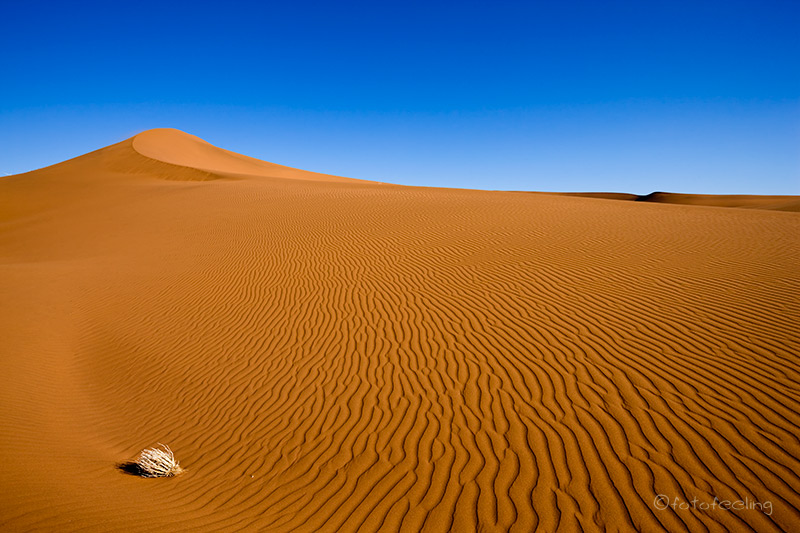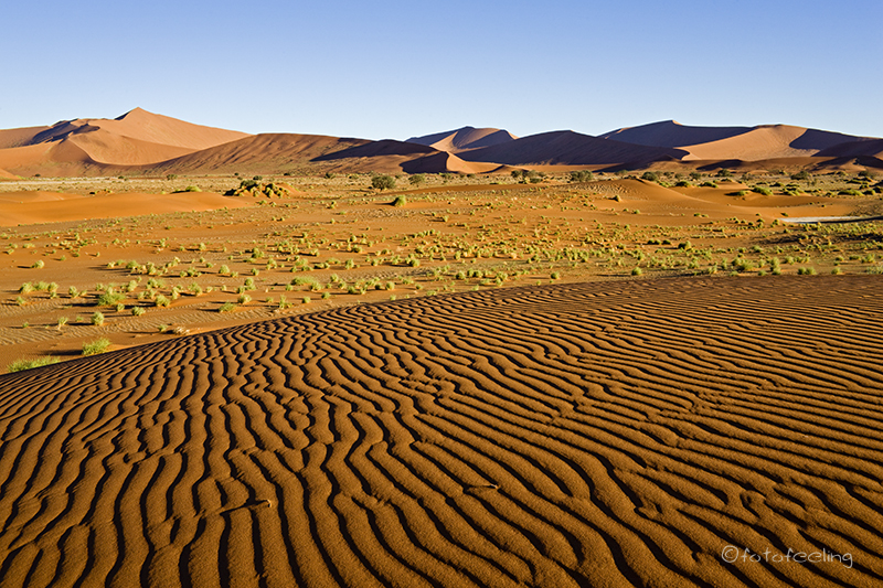 Nach einer kurzen Nacht standen wir schon wieder am Tor und warteten. Die Müdigkeit saß uns in den Gliedern, aber mit einem wärmenden Kaffee in der Hand erträgt man ja fast alles. Wir fuhren wieder bis zum Deadvlei Parkplatz und kletterten diesmal beide auf die hohe Düne links vom Deadvlei. Bald darauf kam auch schon die Sonne und hüllte die Dünenlandschaft in die typischen warmen Farben. Chris entdeckte einen großen Grashüpfer der mit uns auf der Düne saß und sich wärmte. Er hatte ein geduldiges Model gefunden, währenddessen ich schon mal zu den toten Bäumen hinunterging. Auch diesmal waren wir leider nicht alleine. Es war zwar nicht so schlimm wie am Vortag, aber trotzdem stürmten noch viel zu viele Menschen in das Vlei. Dummerweise hatte sich an dem Morgen auch noch ein Springbock dorthin verirrt und kam wegen der vielen Menschen nicht mehr hinaus. Die Dünen im hinteren Teil waren einfach zu steil und nach vorne hätte er an den Leuten vorbeigemusst. So lief er aufgeregt hin und her und tat uns richtig leid. Wir frühstückten wieder auf dem Parkplatz im Schatten der Bäume und versorgten „unsere“ Vögel mit Wasser. Trotz der Sonne wurden wir einfach nicht warm. Ich zog sogar noch meine Jacke über und setzte mich später dick angezogen in die Sonne, da man es im Schatten kaum aushielt. Mittags trafen wir Martin und Gerlinde wieder, die wir auf Koiimasis kennengelernt hatten und unterhielten uns kurz über unsere weiteren Reiseverläufe. Bis zum Nachmittag hielten wir uns auf dem Deadvlei Parkplatz auf und lasen leicht frierend in unseren Büchern. Zwischendurch genossen wir einfach den Blick über die Unmengen an rotem Sand, die jetzt im Frühjahr mit zahlreichen gelben Blüten des Morgensterns bedeckt waren. Außerdem betätigten wir uns für einige Ratlose als rettende Wegweiser in der Wüste und konnten zwei Schakale beobachten. Sie durchstreiften den Parkplatz auf der Suche nach etwas Fressbarem und kamen uns ziemlich nah. Am Nachmittag erkundeten wir ein wenig die Dünen der Umgebung. Kaum war man etwas abseits der Touristenpfade, sahen wir kaum noch Fußspuren und niemand außer uns stapfte dort herum. Die feinen Linien und Wellen der Sandstrukturen begeisterten uns immer wieder aufs Neue und wir genossen die intensiven Farben und wunderschönen Formen der Wüste. Später fuhren wir zur Düne 45 vor und verbrachten dort den Sonnenuntergang. Erschreckend fanden wir, dass die Düne total zertrampelt und runtergetreten war. Die ganze schöne Form war kaputt und es bedarf sicher einiger Sandstürme, diese Zerstörung wieder zu richten. Zum Glück war es an diesem Tag nicht nur kalt, sondern auch sehr windig und der Wind verwehte viele der Fußspuren. Den Abend verbrachten wir auf unserer Campsite und da es sehr kalt war, kletterten wir bald nach dem Essen in unser Zelt. Tageskilometer: 130 km (Sesriem - Sossusvlei - Sesriem) Übernachtung: Campsite 16 / Sesriem |