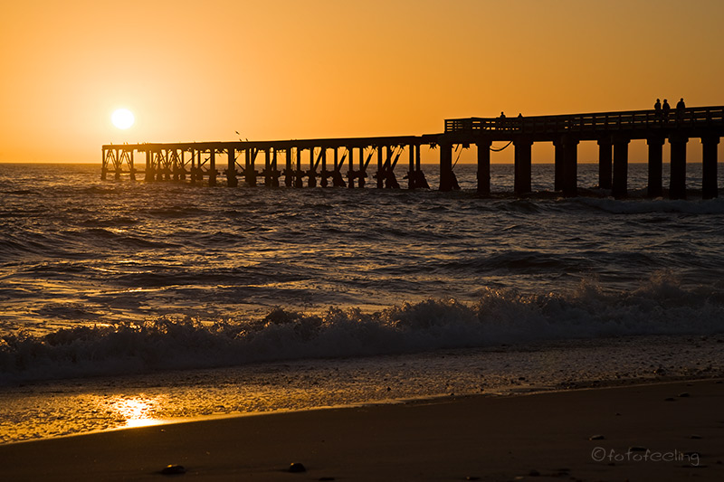 An diesem Morgen schliefen wir zwei Stunden länger - was für ein Luxus. Dann gab es ein kleines Frühstück, denn wir wollten uns in Solitär einen frischen Kuchen holen. Nach einem schnellen Tankstopp verließen wir die Sesriem Campsite und machten uns auf den Weg nach Swakopmund. Das Wetter war sehr eigenartig, denn der Küstennebel hatte sich bis zum Sossusvlei vorgeschoben und dichte Nebelschwaden hingen über den Dünen. Auf der Straße schien jedoch die Sonne, es war nur ein wenig dunstig. Der Nebel über den Dünen sah klasse aus, leider war es viel zu weit weg und für eine Fahrt in die Dünen einfach zu spät. In Solitär versorgten wir uns mit noch warmem Apfelkuchen und Kaffee. Wieder waren die Straßen mit unzähligen toten und lebendigen Schrecken übersät. Man konnte den Insekten fast nicht ausweichen, auch wenn wir unser Bestes gaben und streckenweise Slalom fuhren. Irgendwann wurde Chris von der Fotowut übermannt und warf sich auf einem geteerten Stück Straße auf den Bauch und fotografierte die Schrecken und ihren Kannibalismus. Dabei musste er aufpassen, sich nicht auf irgendwelche Schrecken zu legen, so viele waren auf der Straße. Unser Weg führte uns über den schönen Gaub-Pass und durch den Kuiseb Canyon weiter durch die Weite der Namibwüste. Leider darf man die Straßen ja nur mit einem Permit verlassen, aber wir hatten eh keine Zeit, da wir so früh wie möglich in Swakop sein wollten. Wir hatten uns überlegt, diesmal in eine feste Unterkunft zu gehen und wollten es gerne in ![]() Leider war sie schon ausgebucht, aber Meike war so nett, dass sie uns ein Tourguide Zimmer in der Pension „à la Mer“ verschaffte und mit Andy ( ![]() Aber auch in der Pension „à la Mer“ wurden wir sehr herzlich aufgenommen und unser Zimmer war wirklich nett und preiswert. Außerdem konnten wir von dort aus das Meer sehen und hören, was uns auch gut gefallen hat. Vom Hotel mussten wir nur ein paar Schritte gehen und waren schon an der Jetty. Der lange historische Steg wurde gerade renoviert und war schon zur Hälfte begehbar. Das nutzten wir doch gleich aus und spazierten bis aufs Meer hinaus. Nur der Rückweg wurde etwas problematisch, denn es krachten einige sehr hohe Wellen auf das Land und der letzte Teil vom Steg sah schon ziemlich nass aus. Okay, wir warteten einfach ab und nach einer besonders hohen Welle gingen wir schnellen Schrittes ans trockene Land. Doch wir hatten die Natur unterschätzt, denn nach der hohen Welle kam eine extra hohe Welle. Sie brach sich am Ufer und schwappte uns mit voller Wucht in den Rücken. Überall tropfte es und unsere Rückseite war pitschnass. Lachend schüttelten wir uns aus. So etwas konnte wohl auch nur uns passieren. Zum Glück war es nicht kalt und die Sonne trocknete uns schnell wieder. Wir gingen noch kurz in die Stadt und besuchten Andy, der uns gleich die Flugtickets ausstellte. Sehr praktisch war auch, dass er uns vom Hotel abholte und wir unser Auto sicher im Hof stehen lassen konnten. Geflogen sind wir mit dem Piloten Bus, der wirklich sehr lieb war und versuchte, alles zu ermöglichen, was wir gerne wollten. So flogen wir eine extra Runde über die Düne 45 und das Deadvlei. Chris hatte vor dem Flug noch spaßig zu Bus gesagt, dass er über dem Schiffswrack der Eduard Bohlen doch ruhig abbremsen könnte, da man einfach viel zu schnell daran vorbei ist. Bus meinte nur schmunzelnd, dass Flugzeuge keine Bremse haben. Doch als wir dann auf das Schiffswrack zuflogen grinste Bus auf einmal und rief durch den Kopfhörer: „Ich kann ja doch bremsen. Ich fahre einfach das Fahrwerk aus.“ Gesagt, getan und es hat wirklich geholfen. Wir flogen relativ langsam über das Wrack. Es hat unheimlich Spaß gemacht und viel zu schnell verging die Zeit. Zwei sehr nette „Mitflieger“ hatten wir auch, Gerlinde und Helmut, die wir später noch mehrmals in Cape Cross und der Etosha trafen. Rechtzeitig zum Sonnenuntergang spazierten wir zur Jetty vor. Viele Menschen hatten sich dort schon eingefunden, um dem abendlichen Schauspiel beizuwohnen. Diesmal gingen wir nicht auf den Steg, sondern nach unten an den Strand. Von dort aus versank die Sonne neben der Jetty im Meer. Kurz vor Sonnenuntergang trafen wir wieder auf Martin und Gerlinde und verabredeten uns für den Abend in dem Restaurant „Zur Kupferpfanne“. Das Restaurant ist gleichzeitig auch ein privates Museum mit antiken Möbeln, alten Fotos und Gegenständen und dementsprechend viel gab es zu entdecken. Das Essen schmeckte aber auch hervorragend und es war mal wieder richtig angenehm, in einem Restaurant zu sitzen und sich bedienen zu lassen. So verflog der Abend und schon bald waren wir sehr müde und zufrieden in unserem Zimmer. Tageskilometer: 350 km Rundflug mit |