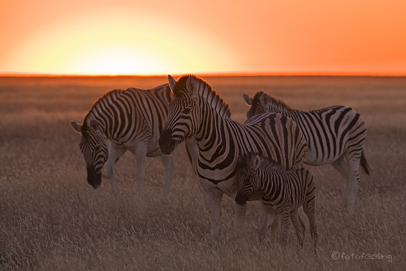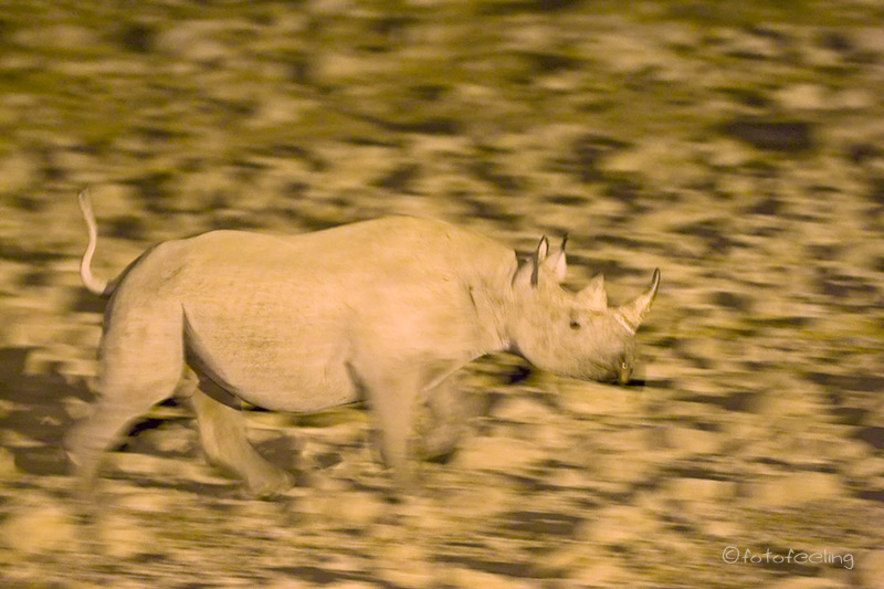Als uns in der Nacht lautstarkes Löwengebrüll wecke, wurde uns so richtig bewusst, was wir während unserer Zeit in Namibia vermisst hatten. Wir hörten an der Lautstärke der Rufe, dass die Löwen immer näher kamen und dann am Camp vorbeizogen. Da wir wieder einmal die Ersten am Gate waren, konnten wir uns noch mit einem Ranger unterhalten, der uns erzählte, dass vier Löwen nachts am Wasserloch waren und dann weiter gezogen sind. Wir überlegten lange, ob wir in Richtung Löwengebrüll fahren sollten oder ob wir an „unserem“ Lieblingsbaum den Sonnenaufgang anschauen wollten. Da die Löwen jedoch in Bewegung waren und sicher nicht genau an der Straße auf uns warteten, entschieden wir uns für den Baum. Überpünktlich öffnete das Tor. Wir fuhren in Richtung Okondeka und gerade als wir am Baum waren, blitzte auch schon die Sonne hinter dem Horizont hervor. Leider war wieder einmal kein Wölkchen am Himmel, aber dafür zogen weiter weg in der Ebene Zebras vorbei, die im frühen Morgenlicht leuchteten. Zurück in Okaukuejo frühstückten wir erst einmal ausgiebig mit Spiegeleiern und knusprigem Speck. Später gingen wir ans Wasserloch, lasen in unseren Büchern und beobachteten viele Zebras beim Trinken. Das Ganze war so friedlich und beruhigend, dass ich an Chris gelehnt kurz eingeschlafen bin. Am Nachmittag holten wir uns wieder ein Eis und verbrachten einige Zeit am Pool. Die Nachmittagsrunde war leider wieder nicht sehr erfolgreich. Der Höhepunkt waren Zebras im Sonnenuntergang. Dabei hatte es uns ein kleines Zebrafohlen besonders angetan und wir konnten uns kaum losreißen. Komischerweise waren wir das einzige Auto weit und breit, aber da tiermäßig nicht so viel los war, wunderten wir uns nicht wirklich darüber. Irgendwann meinte Chris: „Jetzt müssen wir aber Gas geben, sonst kommen wir zu spät ins Camp.“ Er brauste los und übersah dabei ein dickes Schlagloch. Das Auto machte einen Satz, wir wurden beide aus den Sitzen gehoben, dabei schlug mein Kopf gegen das Dach und mein Savanna duschte mich und die Fensterscheibe. Vor Schreck schaute ich ihn nur nass triefend und furchtbar empört an. Am Gate erklärte sich, warum wir an diesem Abend kein anderes Fahrzeug gesehen hatten, denn die Zeit war um zehn Minuten vorverlegt worden. So standen wir vor einem verschlossenen Tor und blickten uns ratlos an. Zum Glück erinnerte ich mich, dass das andere Tor meistens länger geöffnet ist und so fuhren wir hoffnungsvoll zum anderen Eingang. Zu unserer großen Erleichterung war noch eine Seite geöffnet und wir konnten zurück ins Camp fahren. Zum Glück war auch kein Ranger in der Nähe und wir „schlichen“ auf unsere Campsite Am Wasserloch war an diesem Abend richtig was los. Es waren ständig vier Nashörner da und auch eine Wildkatze jagte im hellen Schein der Beleuchtung. Später kamen noch zwei Elefanten und es war ein kurzweiliger „Fernsehabend“. Übernachtung: Okaukuejo Campsite - Etosha National Park |