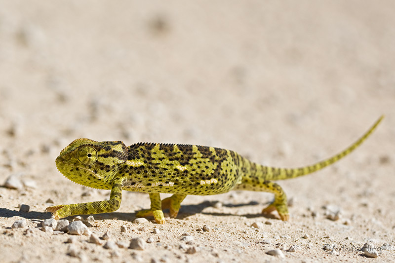 Wieder hörten wir in der Nacht und am Morgen Löwen, aber diesmal waren sie weiter weg in Richtung Okondeka - vermuteten wir. Also fuhren wir wieder in Richtung „unserer“ Schirmakazie in der Hoffnung, unterwegs auf die Löwen zu treffen. Aber wie so oft fanden wir sie nicht. Dafür hatten wir einen wahnsinnig schönen Sonnenaufgang, denn über Nacht hatte sich eine dichte Wolkenfront gebildet und sie leuchtete in allen möglichen Rot- bzw. Orangetönen über der Etoshapfanne. Später sahen wir in Aus am Wasserloch eine Elefantenfamilie beim Trinken und beobachteten sie eine ganze Weile. Besonders gefiel uns ein kleiner Eli, der noch ungeschickt mit seinem Rüssel hin und herschleuderte und voller Lebensfreude im Wasser planschte. Der Höhepunkt unserer Fahrt nach Halali war auf alle Fälle ein Chamäleon, das in aller Seelenruhe die Straße passierte. In Halali war das Computersystem ausgefallen und so konnten wir eigenständig eine Campsite auswählen. Wir stellten uns in die Nähe vom Pool, denn dort wollten wir den Nachmittag verbringen und hatten so unsere Sachen gut im Blick. Natürlich gab es wieder ein Eis und da es mittags sehr warm war, erfrischten wir uns im kalten Wasser des Pools. Am Nachmittag wollten wir zum Etosha Lookout, denn wir hatten gehört, dass die Pfanne voller Wasser war und so fuhren wir gespannt dorthin. Uns erwartete ein scheinbar endloses Meer, in dem man nur mit gutem Auge einen Horizont erkennen konnte. Auch die Straße war nur ein kleines Stück befahrbar und endete ziemlich schlammig mit tiefen Fahrspuren im Wasser. Es war unglaublich. Wir hatten aber auch noch das Glück, dass sich dicke Quellwolken gebildet hatten und es fast windstill war. So spiegelten sich die Wolken wunderschön im Wasser und man hörte die Flamingos schnattern. Leider waren sie zu weit draußen in der Pfanne, so dass man sie zwar hören, aber nicht sehen konnte. Wir kamen uns vor wie in Bolivien am Salar de Uyuni und waren völlig begeistert. Von einem Namibianer, der mit uns dieses Naturschauspiel bewunderte, erfuhren wir, dass das letzte Mal vor etwa 40 Jahren so viel Wasser in der Pfanne stand. Die Pfanne wird durch zwei Flüsse gespeist und die müssen schon mächtig viel Hochwasser haben, dass das Wasser bis dorthin kommt. Pünktlich zum Sonnenuntergang mussten wir wieder im Camp sein. In Halali wird alles noch viel genauer genommen als in den anderen Camps und so wunderte es uns nicht, dass eine Torseite schon zu war, obwohl wir ein paar Minuten zu früh dran waren. Wir schauten noch zum Wasserloch und erfuhren dort, dass wir gerade eine Elefantenfamilie verpasst hatten. Den Rest des Abends verbrachten wir auf unserer Campsite und waren zu faul, um noch einmal ans Wasserloch zu gehen. Übernachtung: Halali Campsite - Etosha National Park |