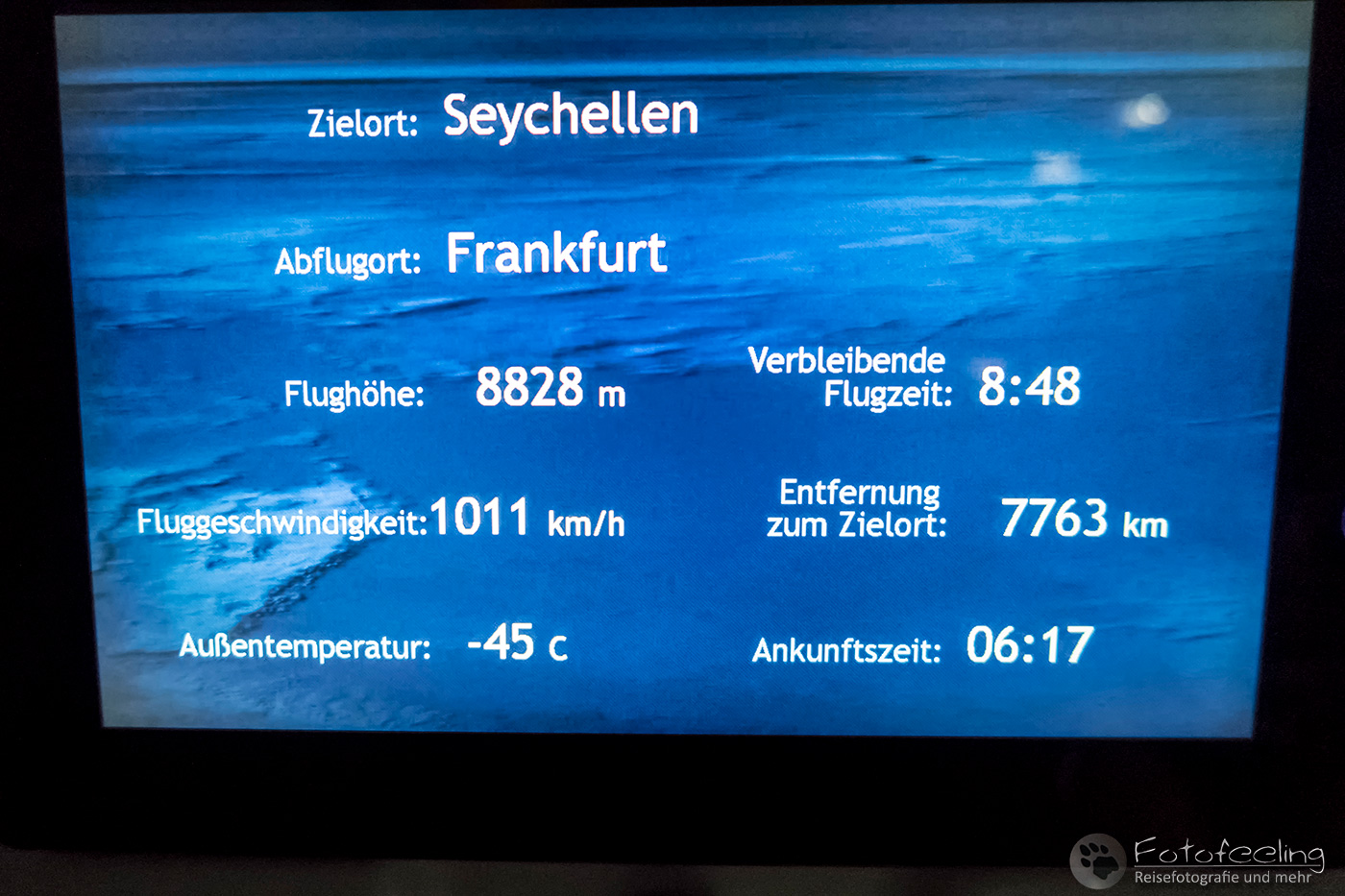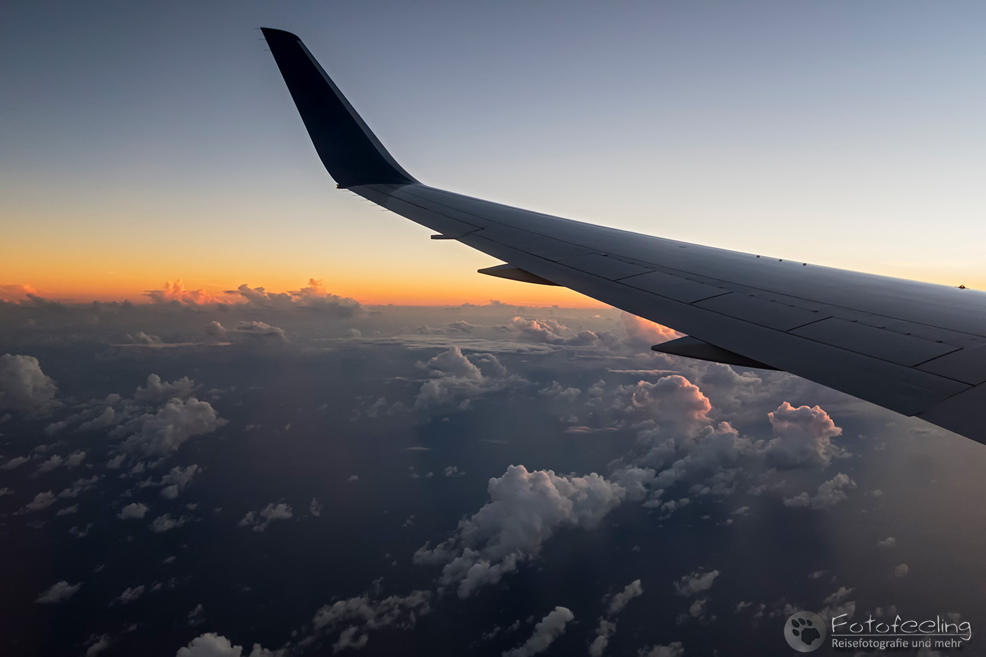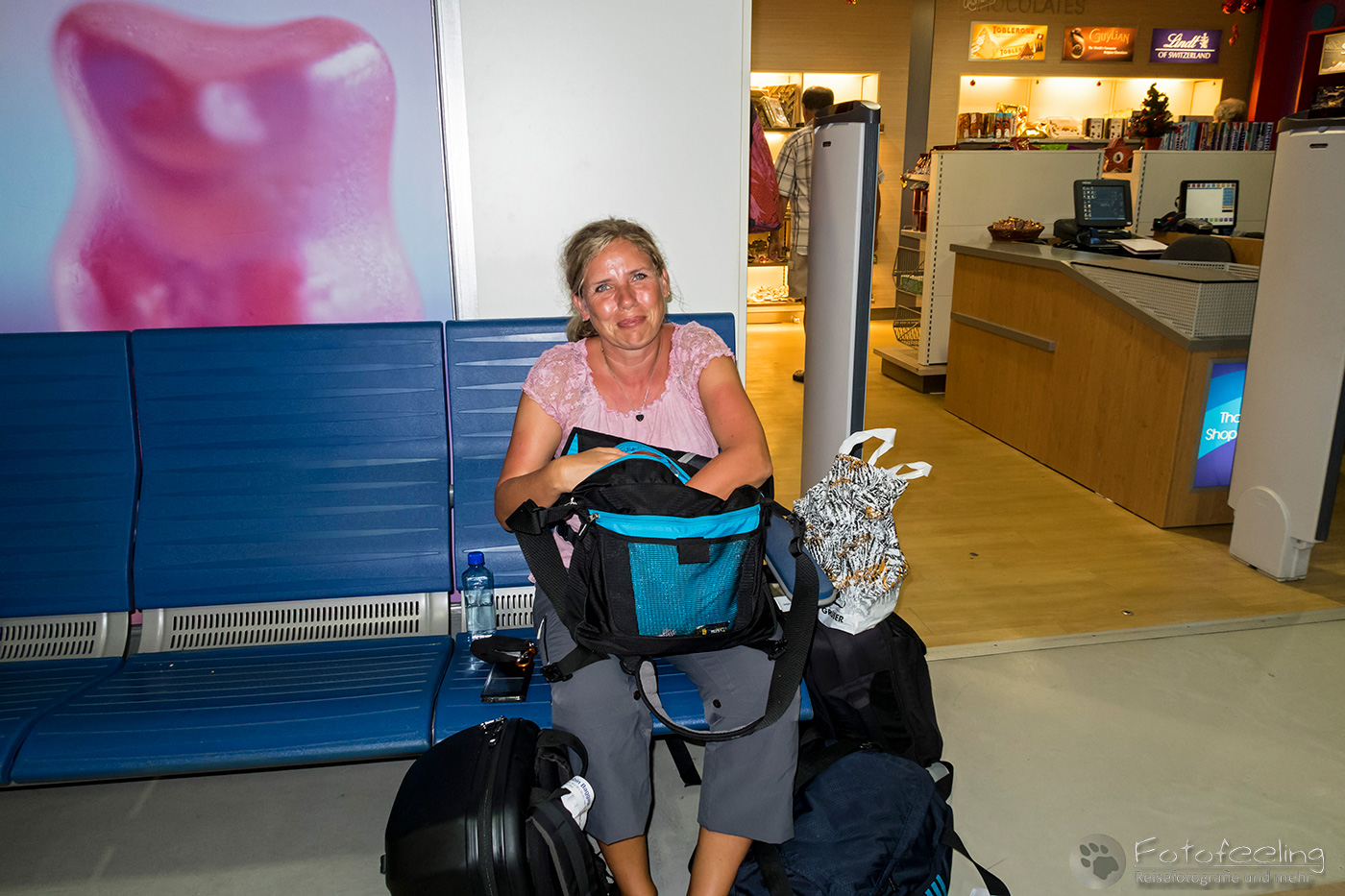 Am Terminal 2 gingen wir zum Lufthansaschalter und gaben unsere Taschen auf, die diesmal exakt 20 kg wogen. Nach einem Kaffee begaben wir uns zum Flieger. Selbstverständlich wurde wieder unsere Ausrüstung genauestens untersucht und auch der Kopter skeptisch in Augenschein genommen. Als der eine Beamte meinte, ob ein Kopter denn im Flugzeug erlaubt sei, rutschte mir kurz das Herz in die Hose, aber der andere nette Beamte lachte nur und bestätigte mein Nicken. Alles war okay und wir durften passieren. Der Flug nach Frankfurt war kurzweilig und wir saßen sogar zusammen. In Frankfurt wanderten wir zu unserem Abflugterminal. Dort saßen wir und warteten, dass die Condor sich startbereit machen würde. Eine emsige Mitarbeiterin kam vorbei und brachte uns die Sicherheitsanhänger für das Handgepäck. Dabei hob sie unseren Fotorucksack in die Höhe. Wieder hielt ich die Luft an, denn natürlich wog er mehr als die erlaubten 6 kg. Keine Ahnung was die Gute gefrühstückt hatte, aber sie verzog nicht einmal das Gesicht und stellte den Rucksack wieder ab, um uns den ersehnten Papierstreifen auszuhändigen. Wow, das ging ja mal einfach! Kein Erklären, kein Wiegen und keine Diskussion, das hätten wir nicht erwartet. Bald darauf war Boarding. Im Vorfeld wollte Chris sich den Freischaltcode für das Premium Economy Fernsehpaket kaufen, da er meistens im Flieger nicht schlafen kann, aber das gesamte System bei Condor war überlastet. Als er von Daheim aus nach gefühlten Tagen endlich mal jemanden in der Leitung hatte, hieß es, dass Condor Probleme mit dem neuen Online-System habe und somit keine Buchungen möglich sind. Man versicherte ihm jedoch, dass er das Fernsehpaket zum gleichen Preis von 6 Euro im Flieger kaufen könne und erzählte, dass Condor es in dieser Notlage kostenlos verteilt hätte. Tja, davon merkten wir leider nichts. Trotz Diskussion und vorheriger Machtlosigkeit des Systems, musste er den vollen Preis zahlen, was ich sehr traurig fand, zumal der Flugpreis auch in der Economy nicht gerade preiswert war und es schlicht und ergreifend nicht möglich war, vorher das Paket zu buchen. Dieser Service und die Tatsache, dass es eine Woche vorher sogar kostenlos war, ärgerte mich schon sehr und das nicht wegen des Geldes, sondern weil hier der Service einfach nur schlecht war. Das Essen konnte mich auch nicht versöhnen, denn wieder einmal gab es nur klebrige Pasta mit bzw. ohne Soße und das mitten in der Nacht. Wenigstens der Film "Honig im Kopf" gefiel uns, aber ob er die 8 € Aufpreis wert war, wagte ich zu bezweifeln, denn danach schlief ich und nur Chris schaute noch einen zweiten und dritten Film an.
