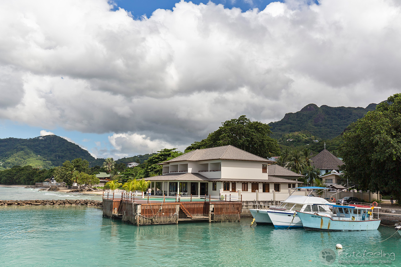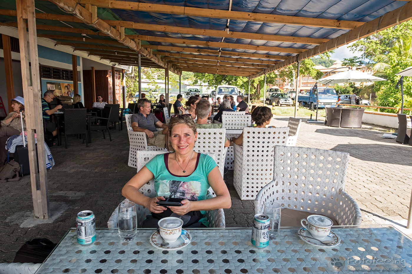 Um 6.12 Uhr landeten wir dann auf dem internationalen Flughafen der Insel Mahé. Es war warm und das schon am frühen Morgen - herrlich. Von der Firma Creol Travel Service wurden wir eingesammelt und auf Busse aufgeteilt, die uns zur Fähre brachten. Leider ließen sie sich so viel Zeit, dass die erste Fähre um 7.30 Uhr weg war und das nächste Boot erst um 11.30 Uhr auslaufen würde. So gaben wir unsere Taschen am Hafen ab und schlenderten etwas durch die Gegend. Da die Sonne nur so vom Himmel lachte, suchten wir etwas Schatten in einem kleinen Park. Doch da fielen leider unzählige Mücken über mich her, so dass wir weiter gingen. Leider gab es hier nicht viel zu erkunden, denn der Hafen lag etwas abseits der Stadt. Dank Chris Forschergeist entdeckte er ein kleines Restaurant, dass etwas versteckt hinter einer Baustelle lag. Hier hatten sich schon mehr Wartende eingefunden. Wir bekamen noch einen Platz und bestellten uns Cappuccino, der auf der Speisekarte stand. Während wir warteten und aufs Meer blickten, drehten sich Windräder träge, doch das bisserl Wind reichte nicht wirklich zum Abkühlen aus. Zum Glück saßen wir im Schatten. Da an unserem Tisch noch Plätze frei waren, setzte sich eine Familie aus Berlin zu uns und wir kamen ins Gespräch. Sie sind Taucher und machen mit ihrer Tochter zwei Wochen Urlaub auf La Dique. Es war sehr nett und die Zeit verflog. Wir verabredeten uns für den Abend unseres Ankunft Tages in der La Dique Island Lodge zum Sundowner.
