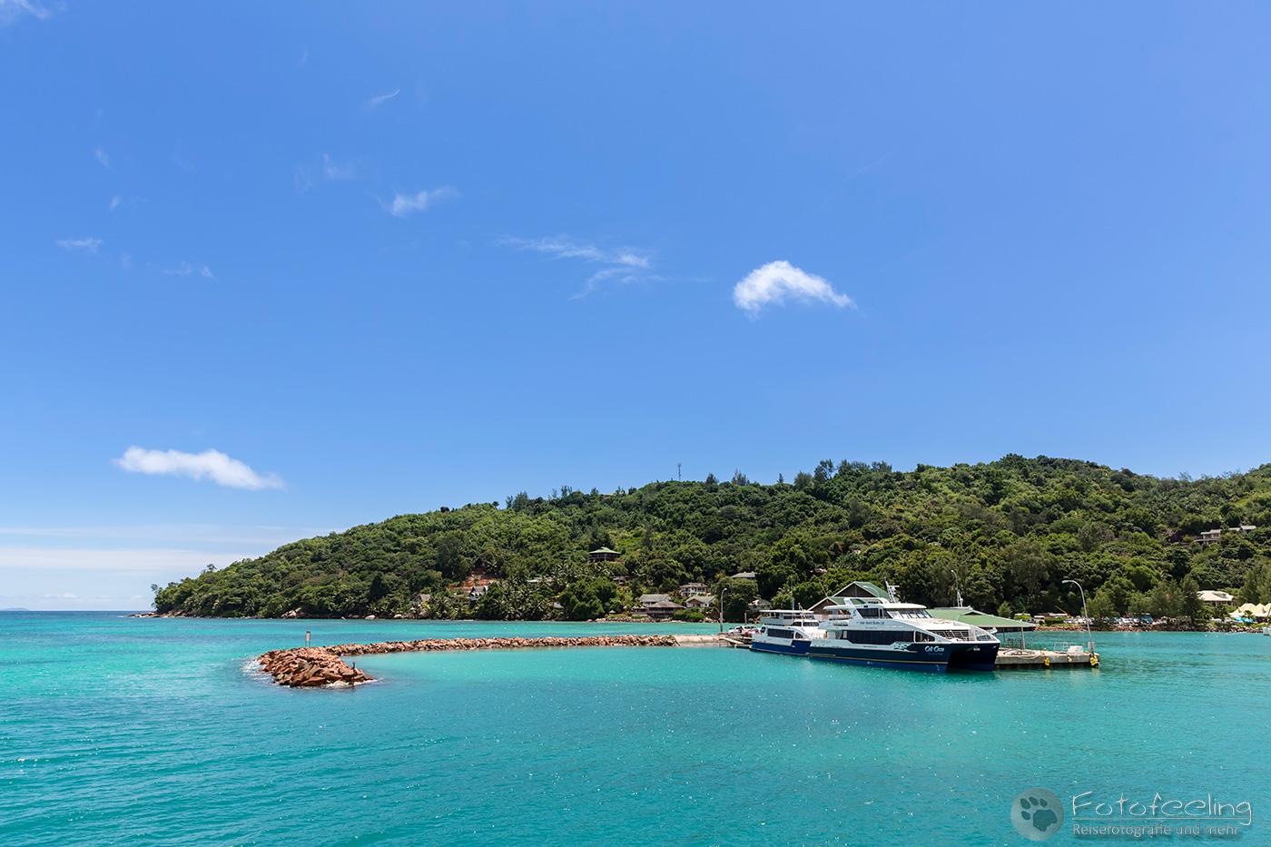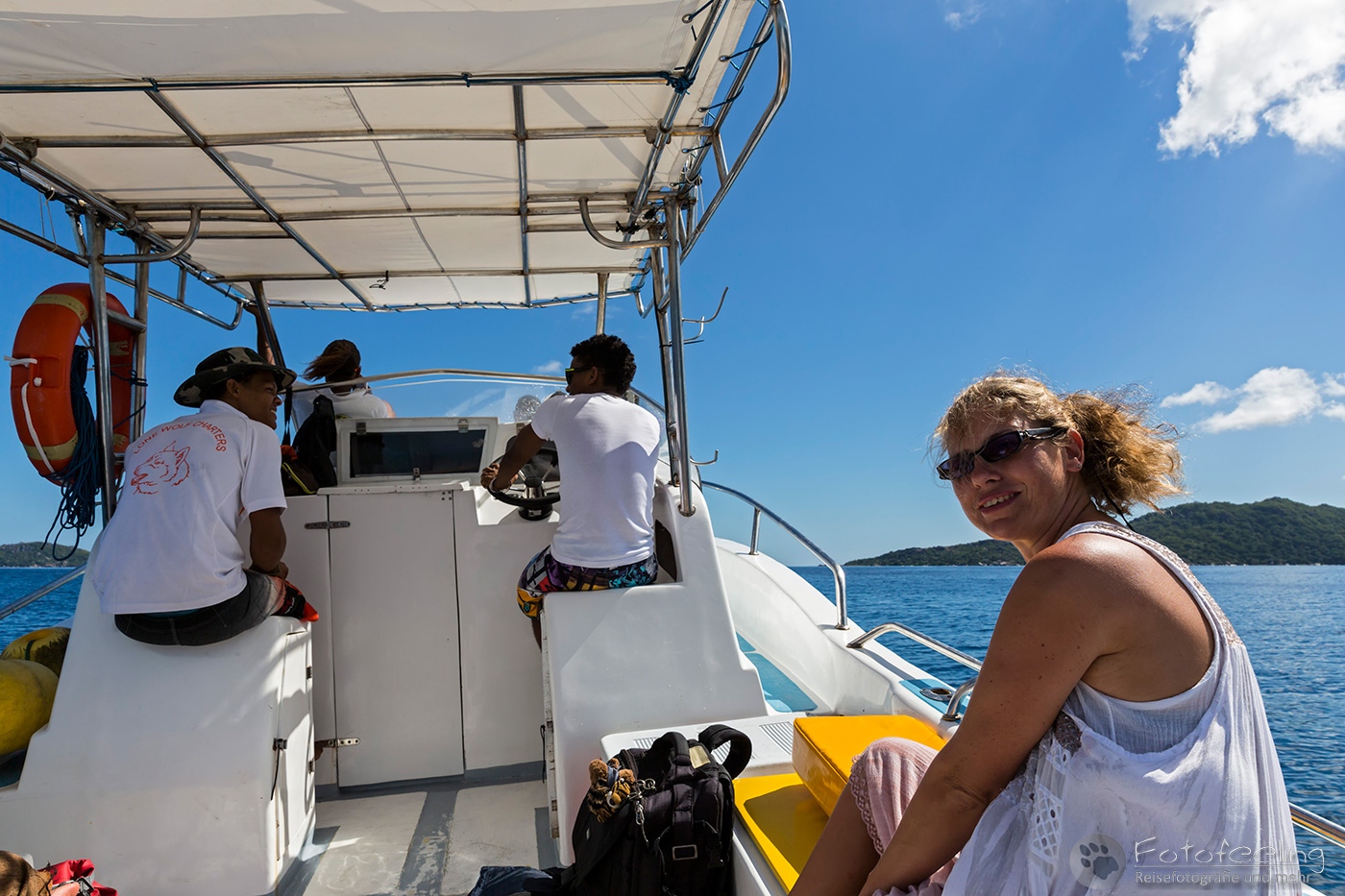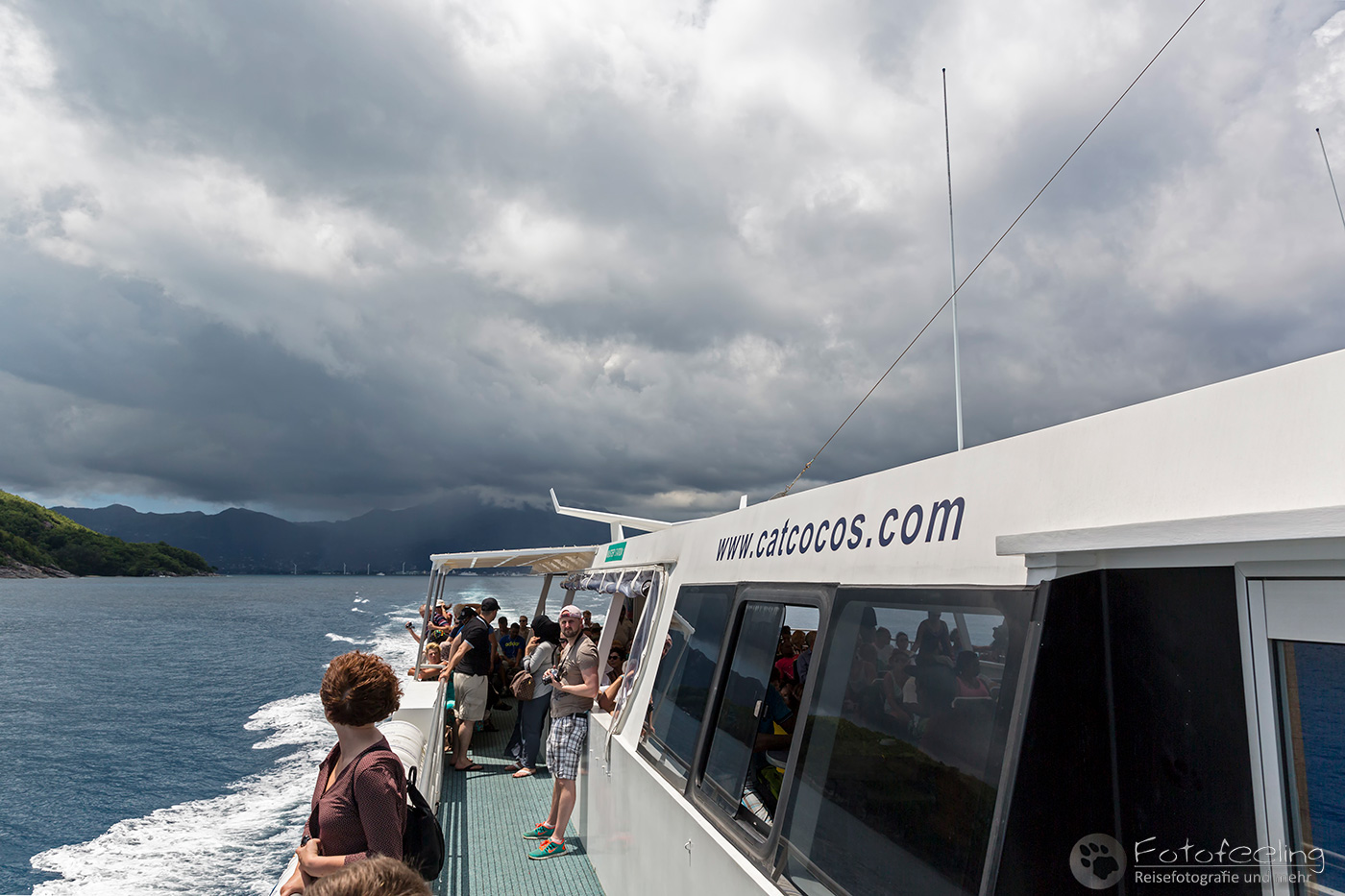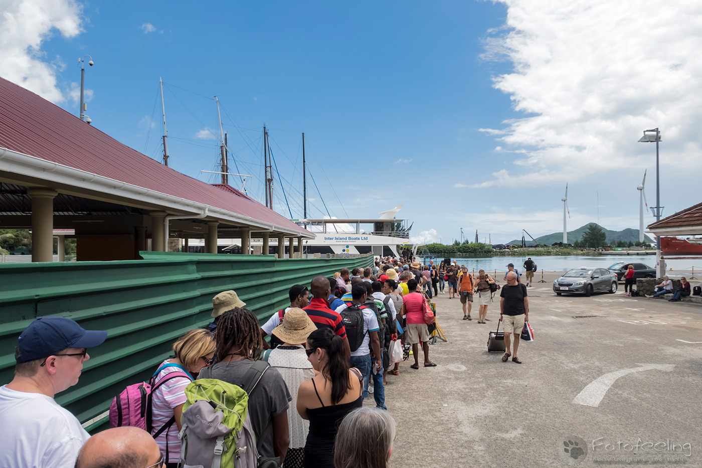 Als es Zeit wurde unsere Fähre aufzusuchen, reihten wir uns in eine lange Schlange vor dem Boot ein. Unsere Taschen standen schon an und wurden gerade verstaut. Wir mussten noch etwas warten und wurden dann ins Innere des Bootes verwiesen. Dort war es schon sehr voll und der Musical Film "Mama Mia" lief lautstark auf den Monitoren. Dazu blies die Klimaanlage aus vollen Rohren, so dass ich sofort eine Gänsehaut bekam. Wir waren uns nicht ganz sicher, ob sie uns hier taub machen wollten oder tiefgefrieren. Beides war jedoch arg unangenehm. Chris wollte natürlich raus an die frische warme Luft, aber das war uns in der "billigen" Klasse untersagt. Die Berliner hatten bessere Tickets und wurden aufs obere Deck gelassen. Wir warteten, bis das Boot abgelegt hatte und als niemand mehr kontrollierte, gingen wir nach oben. Hier war es gleich viel angenehmer. Während ich mit der Müdigkeit kämpfte und immer wieder einnickte, lief Chris wie ein aufgedrehter Duracellhase herum und machte Fotos. Endlich konnte er nach dem langen Flug etwas tun und sich noch dazu bewegen. Nach 45 Minuten legten wir auf Praslin an - unserer ersten Insel.