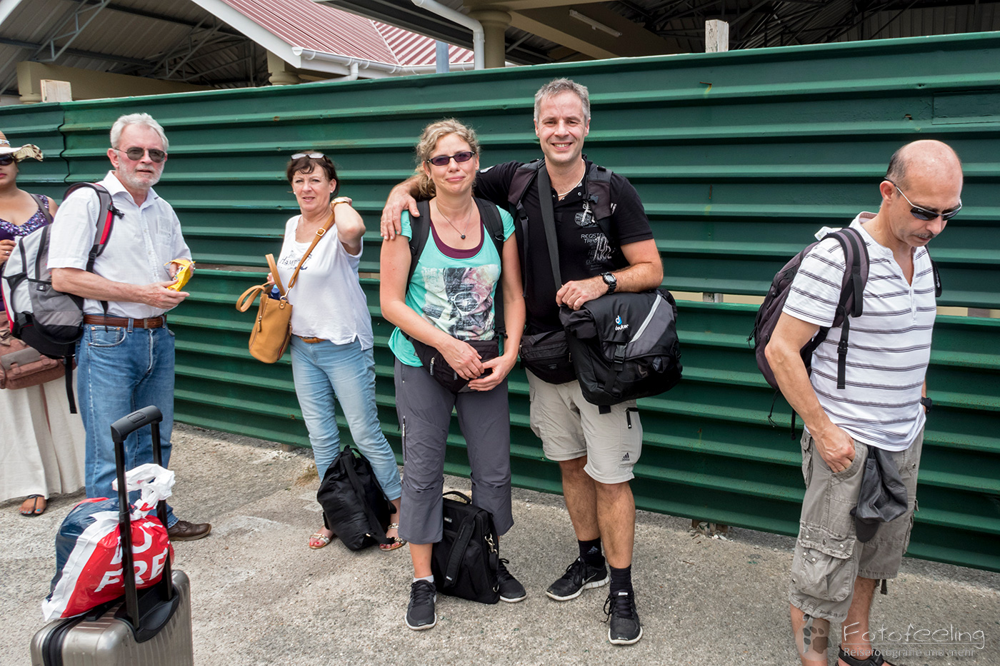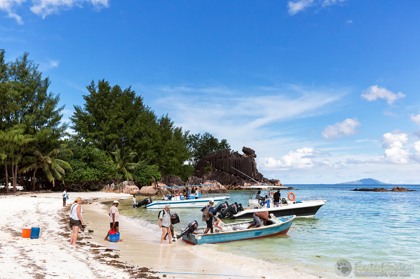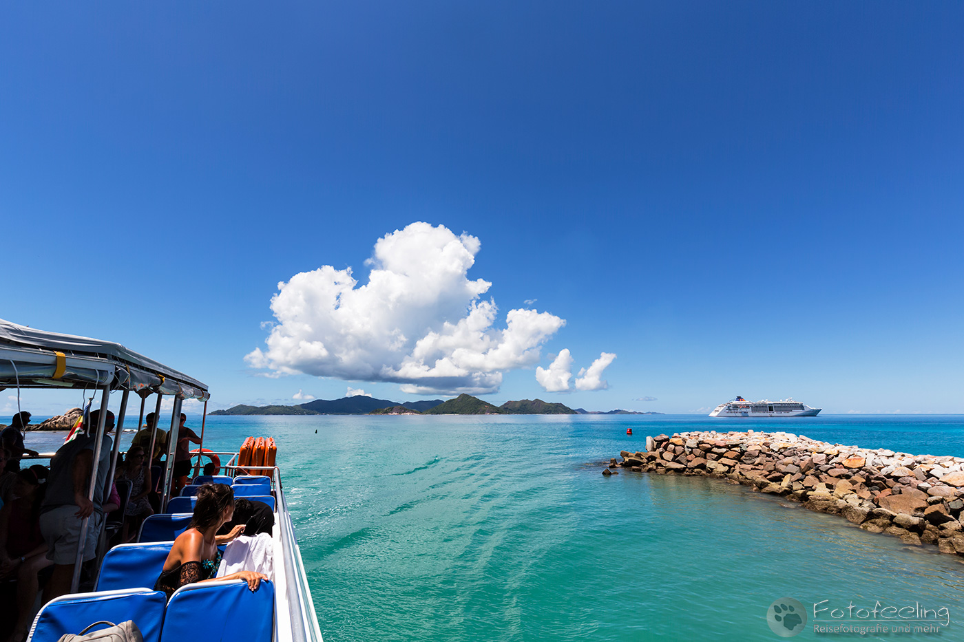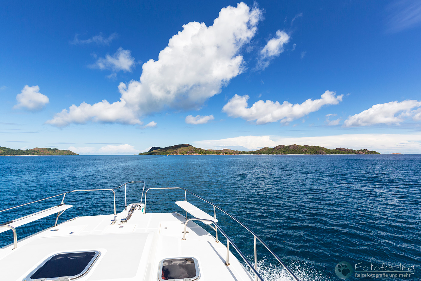 Als es Zeit wurde unsere Fähre aufzusuchen, reihten wir uns in eine lange Schlange vor dem Boot ein. Unsere Taschen standen schon an und wurden gerade verstaut. Wir mussten noch etwas warten und wurden dann ins Innere des Bootes verwiesen. Dort war es schon sehr voll und der Musical Film "Mama Mia" lief lautstark auf den Monitoren. Dazu blies die Klimaanlage aus vollen Rohren, so dass ich sofort eine Gänsehaut bekam. Wir waren uns nicht ganz sicher, ob sie uns hier taub machen wollten oder tiefgefrieren. Beides war jedoch arg unangenehm. Chris wollte natürlich raus an die frische warme Luft, aber das war uns in der "billigen" Klasse untersagt. Die Berliner hatten bessere Tickets und wurden aufs obere Deck gelassen. Wir warteten, bis das Boot abgelegt hatte und als niemand mehr kontrollierte, gingen wir nach oben. Hier war es gleich viel angenehmer. Während ich mit der Müdigkeit kämpfte und immer wieder einnickte, lief Chris wie ein aufgedrehter Duracellhase herum und machte Fotos. Endlich konnte er nach dem langen Flug etwas tun und sich noch dazu bewegen. Nach 45 Minuten legten wir auf Praslin an - unserer ersten Insel.