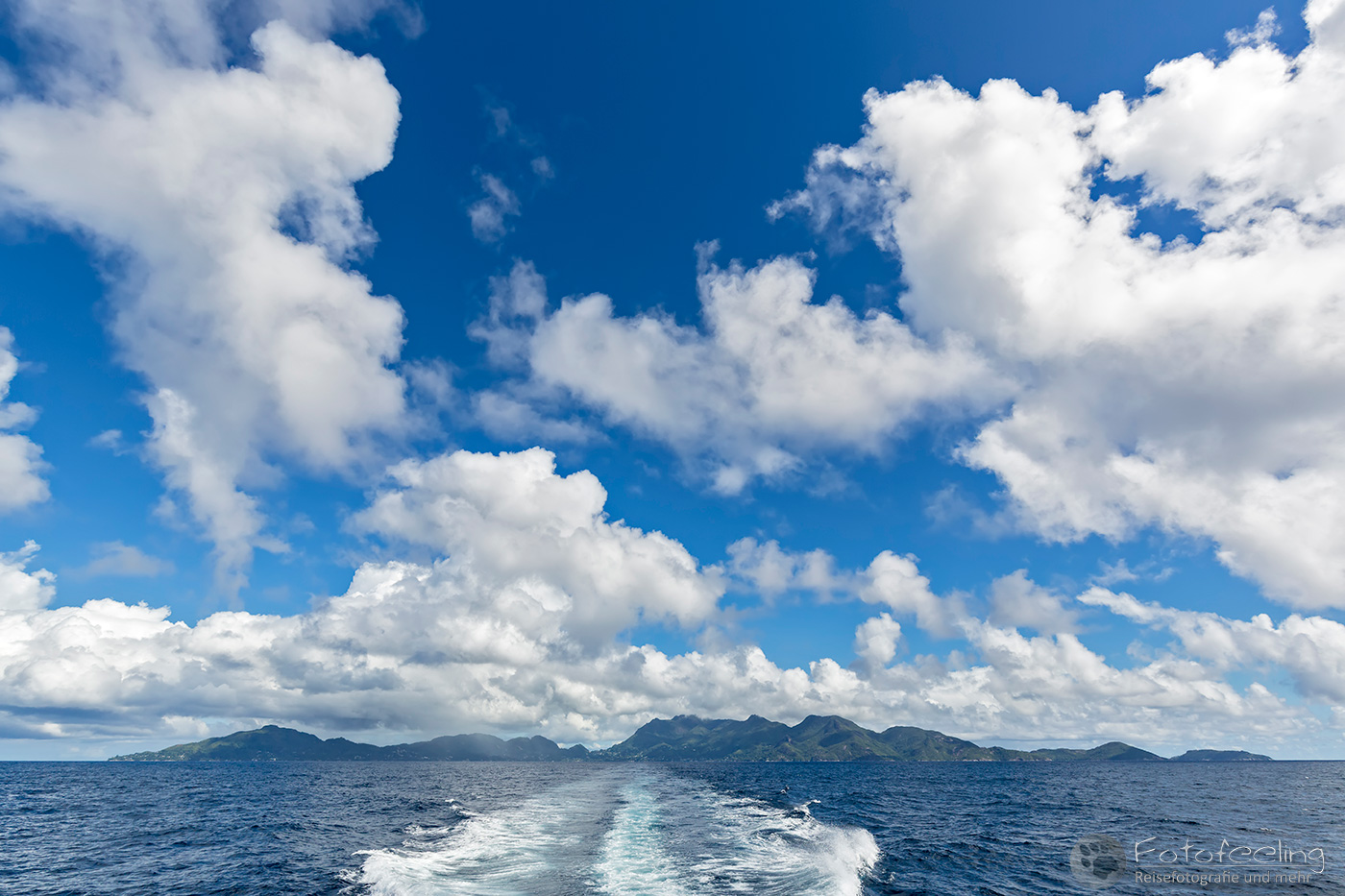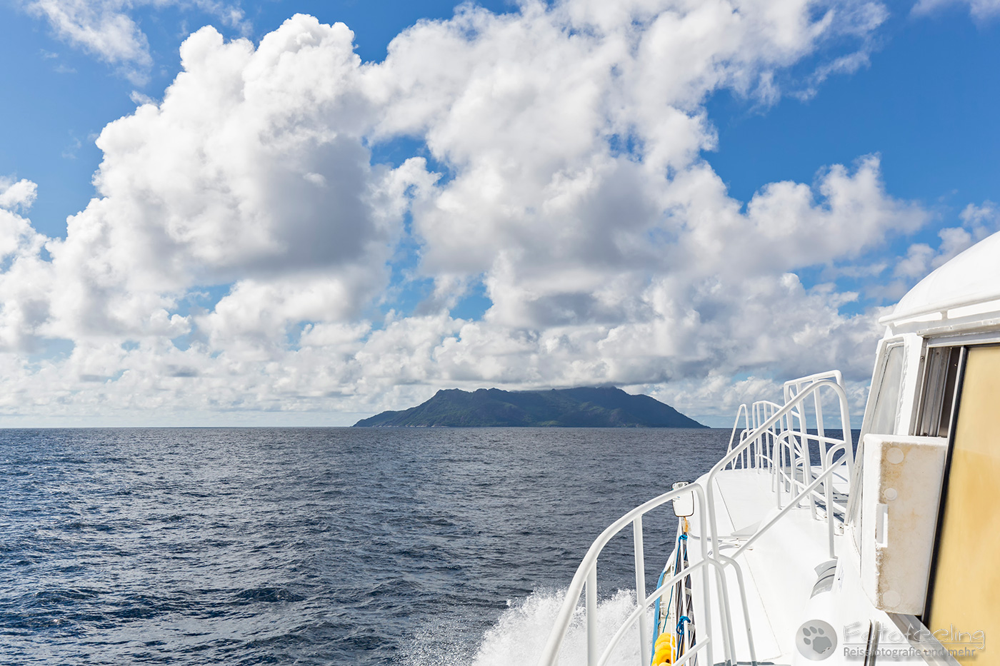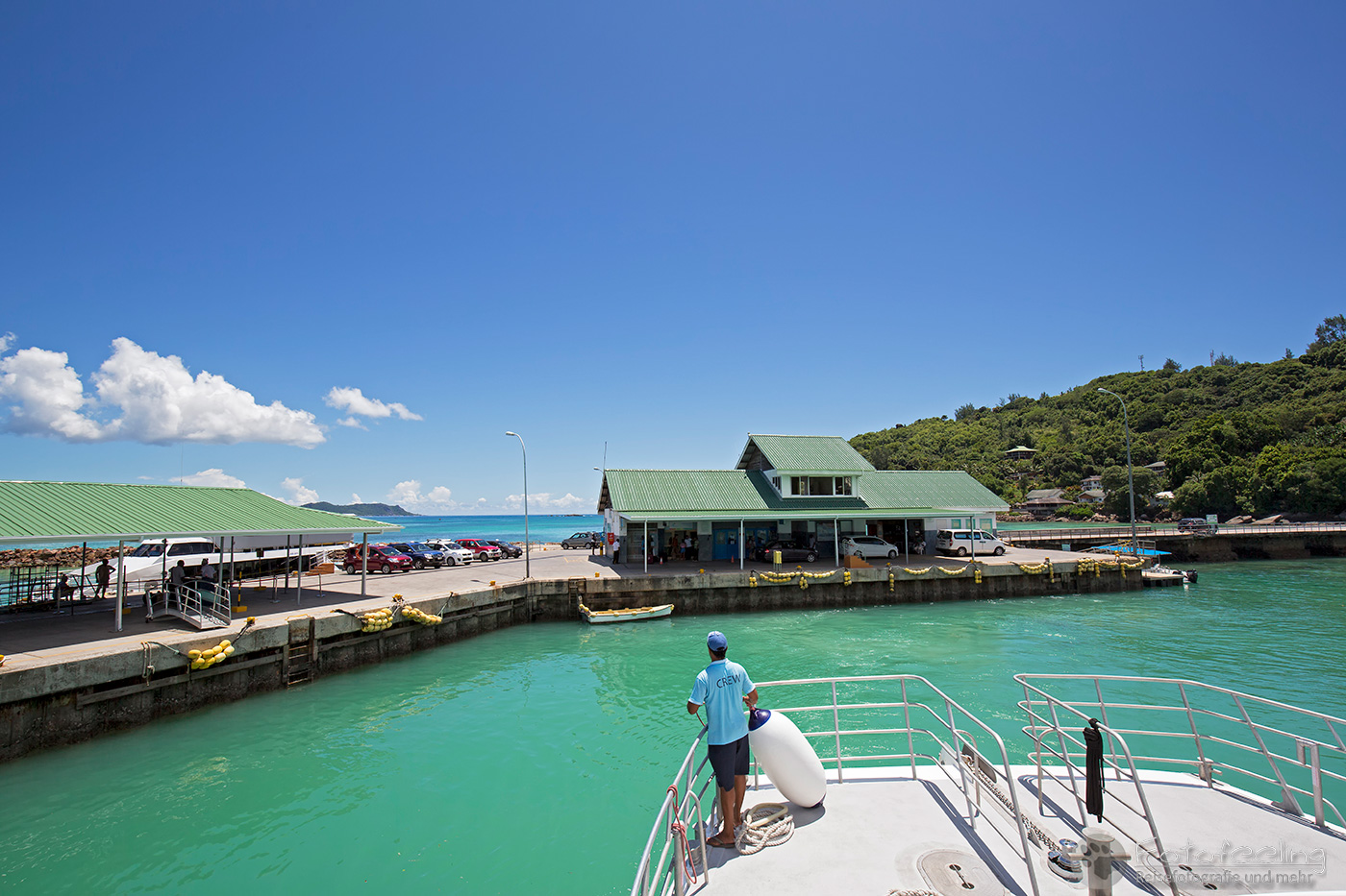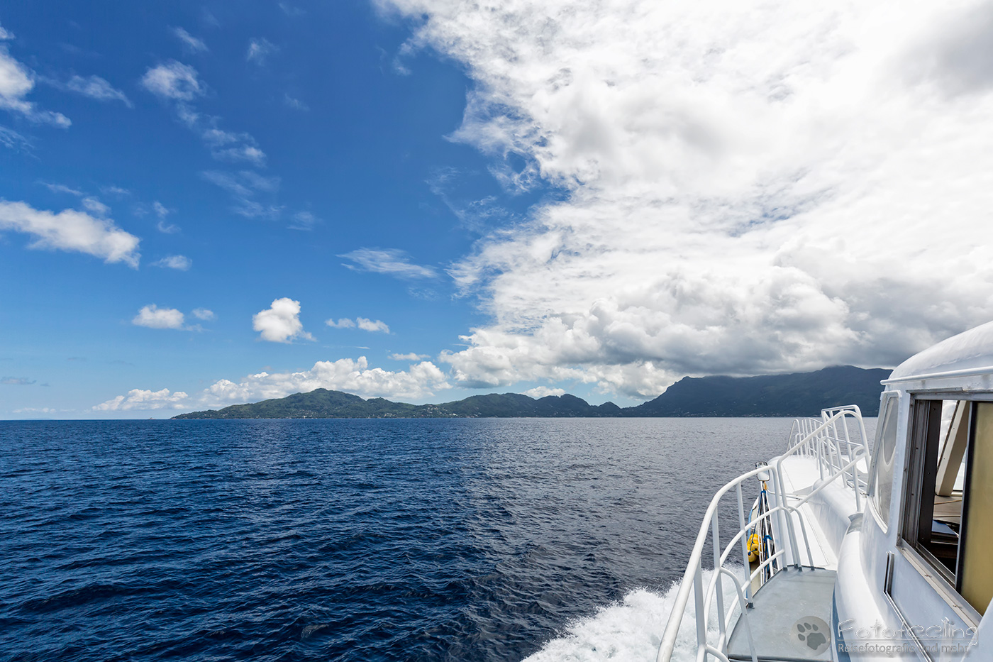 Nach dem Frühstück war alles verstaut und wir badeten noch etwas im Meer bis wir um 10.45 Uhr von Emmanuel zur Fähre gebracht wurden. Mariannick reiste mit uns, da sie einen Termin in Mahé hatte. Natürlich saßen wir wieder draußen und schauten zu, wie unsere Trauminsel langsam immer kleiner und Mahé - unsere letzte Etappe - immer größer wurde.