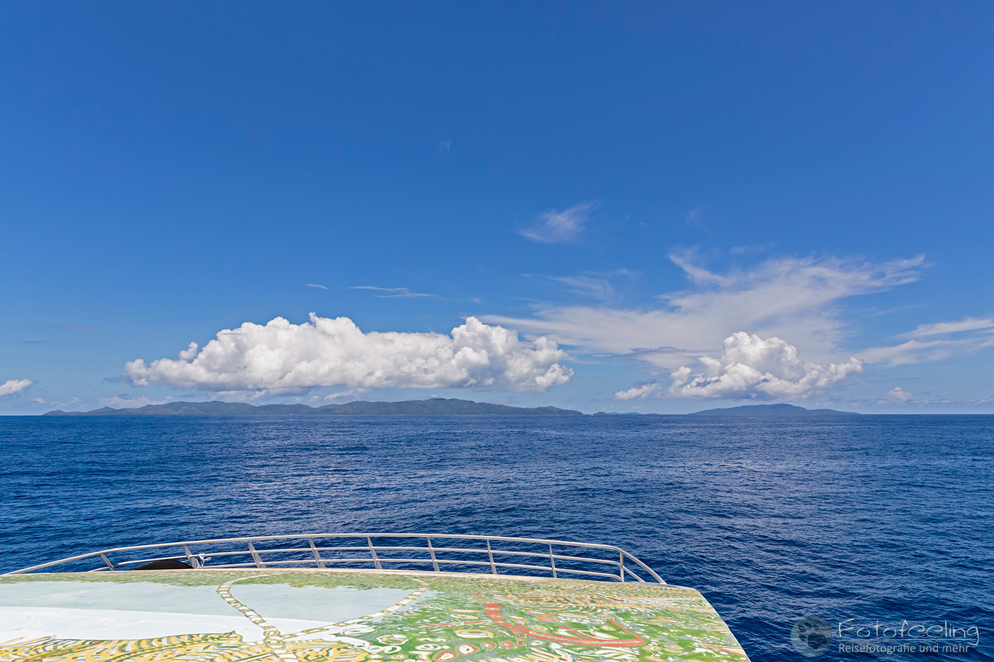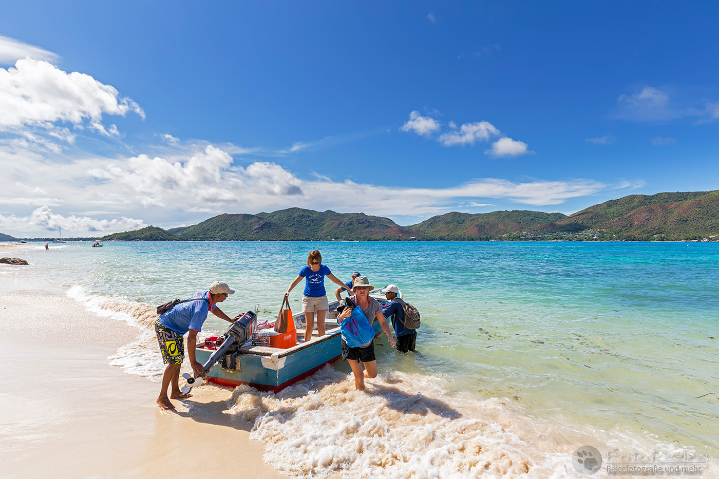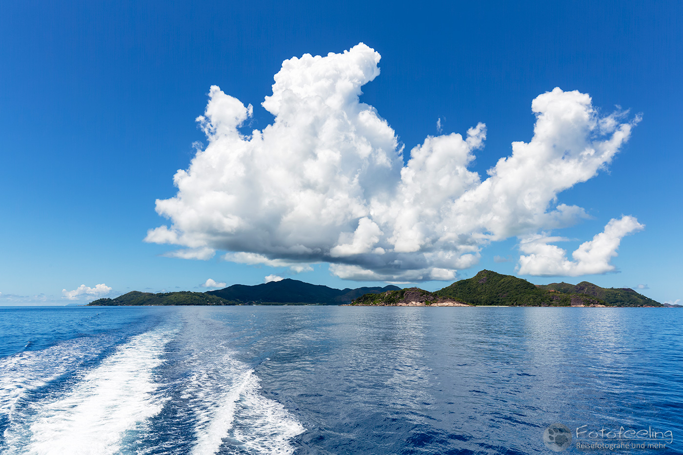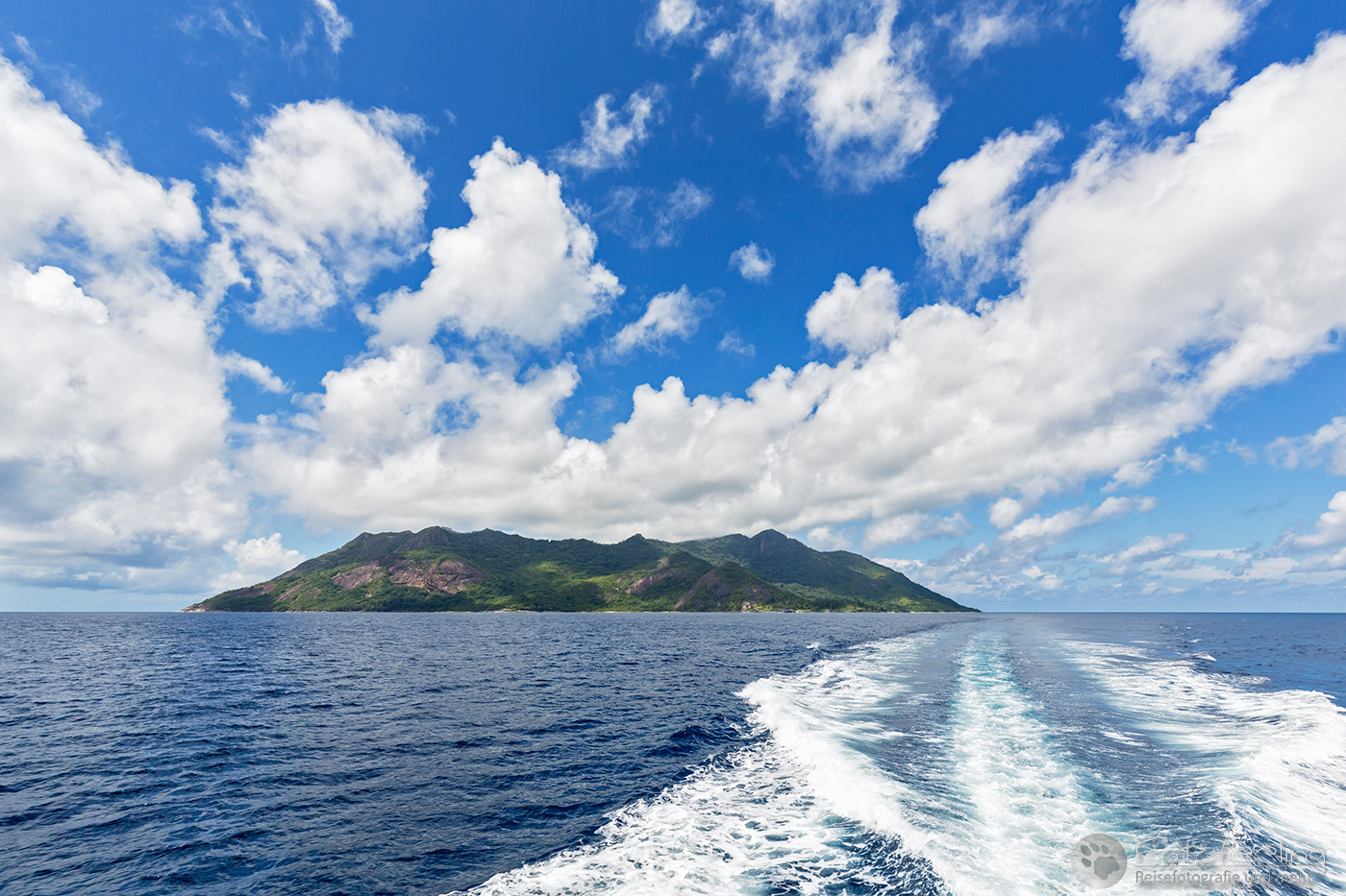 Nach dem Frühstück war alles verstaut und wir badeten noch etwas im Meer bis wir um 10.45 Uhr von Emmanuel zur Fähre gebracht wurden. Mariannick reiste mit uns, da sie einen Termin in Mahé hatte. Natürlich saßen wir wieder draußen und schauten zu, wie unsere Trauminsel langsam immer kleiner und Mahé - unsere letzte Etappe - immer größer wurde.