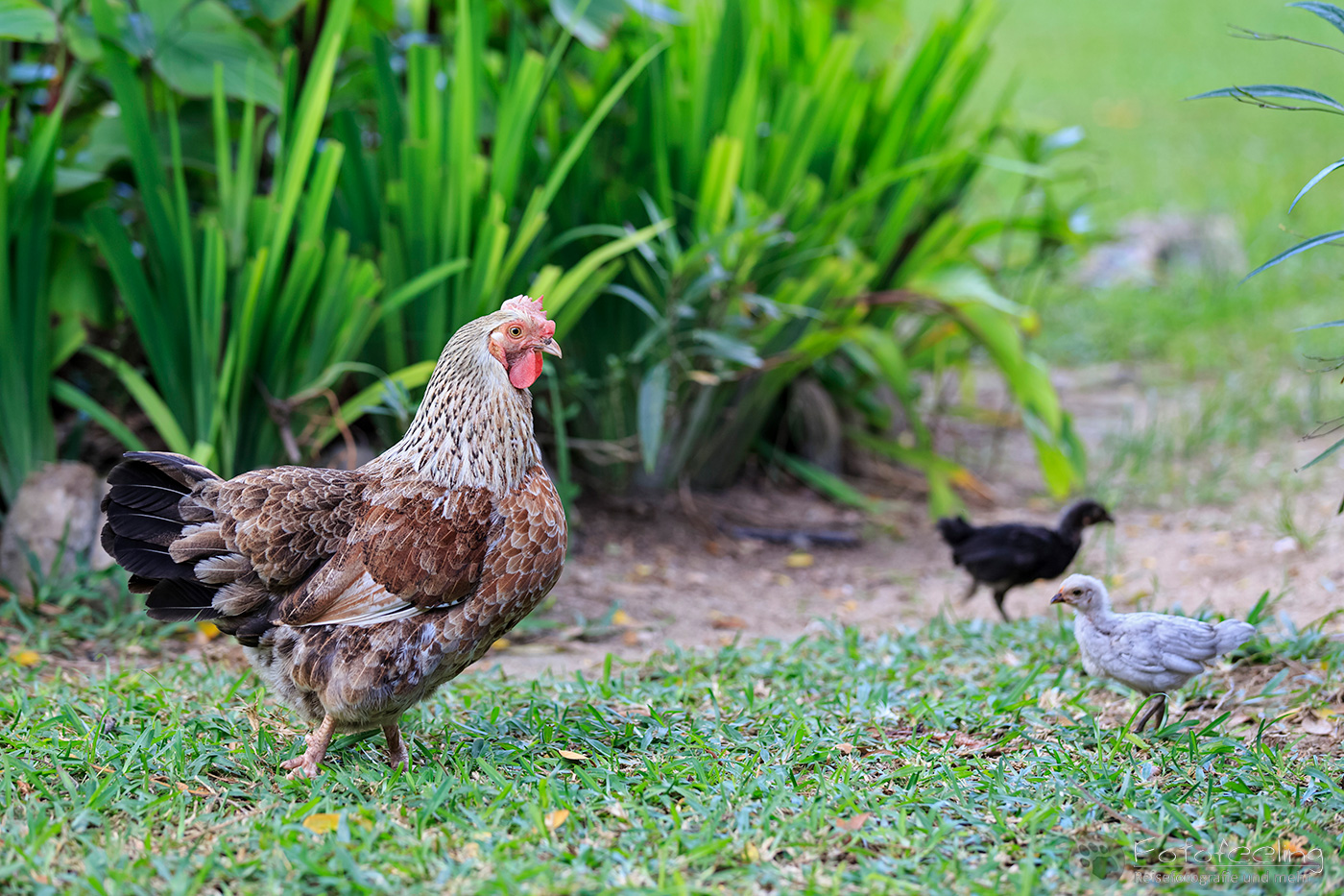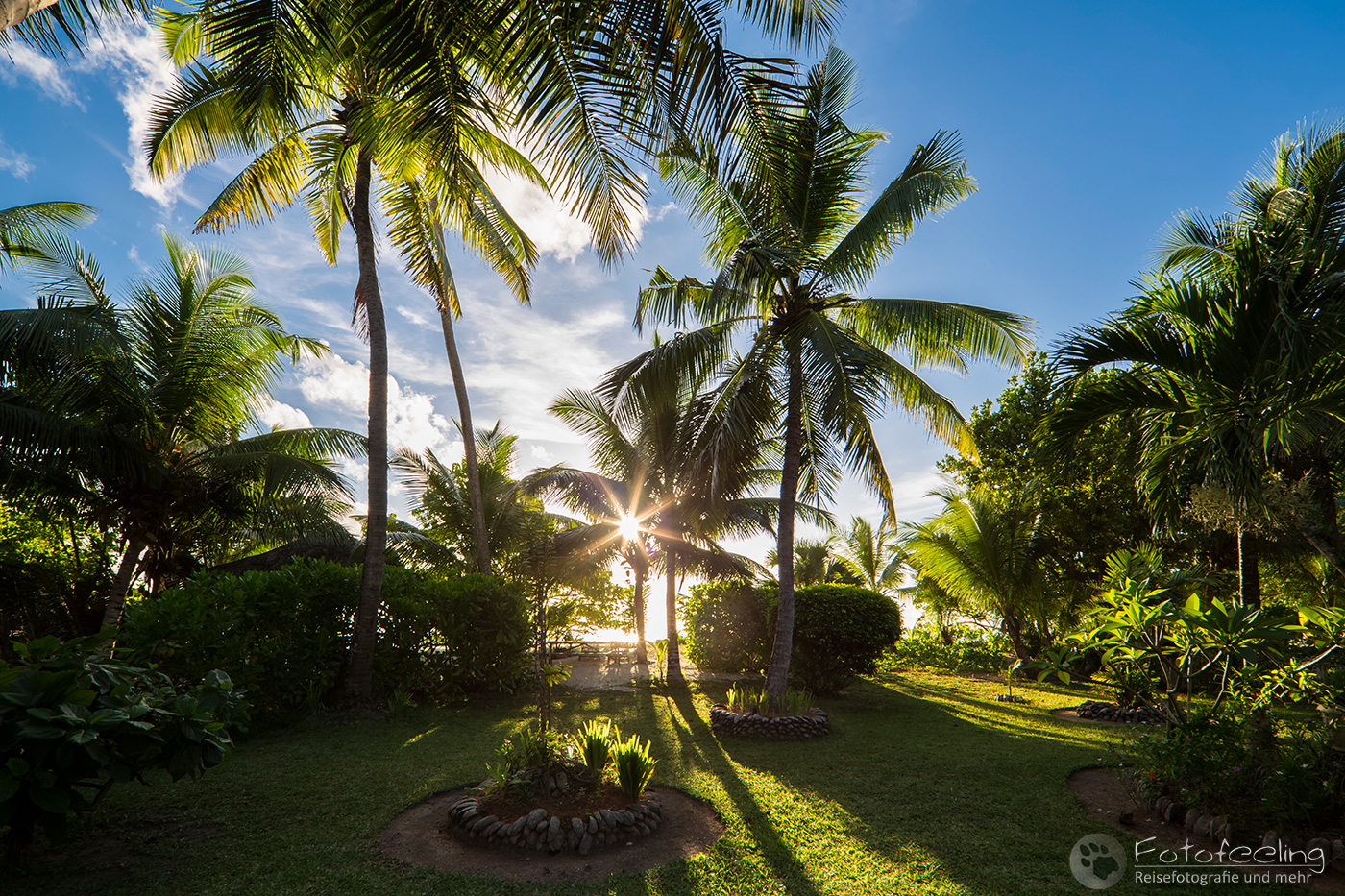 Wir waren erst einmal überwältigt. Unser Bungalow war riesig, luftig und einfach nur zum Wohlfühlen schön. Vor der großen Wohnküche lag unsere Hochterrasse mit Blick auf den üppigen grünen Garten, mit zahlreichen Kokospalmen und wunderschönen Blumen bestückt war. In ihm entdeckten wir Hühner mit Küken, Enten im Gartenteich und allerhand freche Vögel, die den Hühnern das Futter streitig machten. Natalie erzählte uns auch von ihrer Schildkröte Erna, die wir später einmal besuchen wollten. Während ich auspackte, erkundete Chris schon mal den Strand, der gleich am Ende des Gartens begann. Er kam entzückt wieder, denn eine schöne schiefe Fotopalme bot beste Möglichkeiten, hier ein paar typische Bilder im Sonnenuntergang hinzubekommen. Natalie kam später noch einmal vorbei und half uns, ein Auto für die nächsten Tage zu mieten, denn natürlich wollten wir die Insel intensiver erkunden und auch abends mal zum Essen fahren.