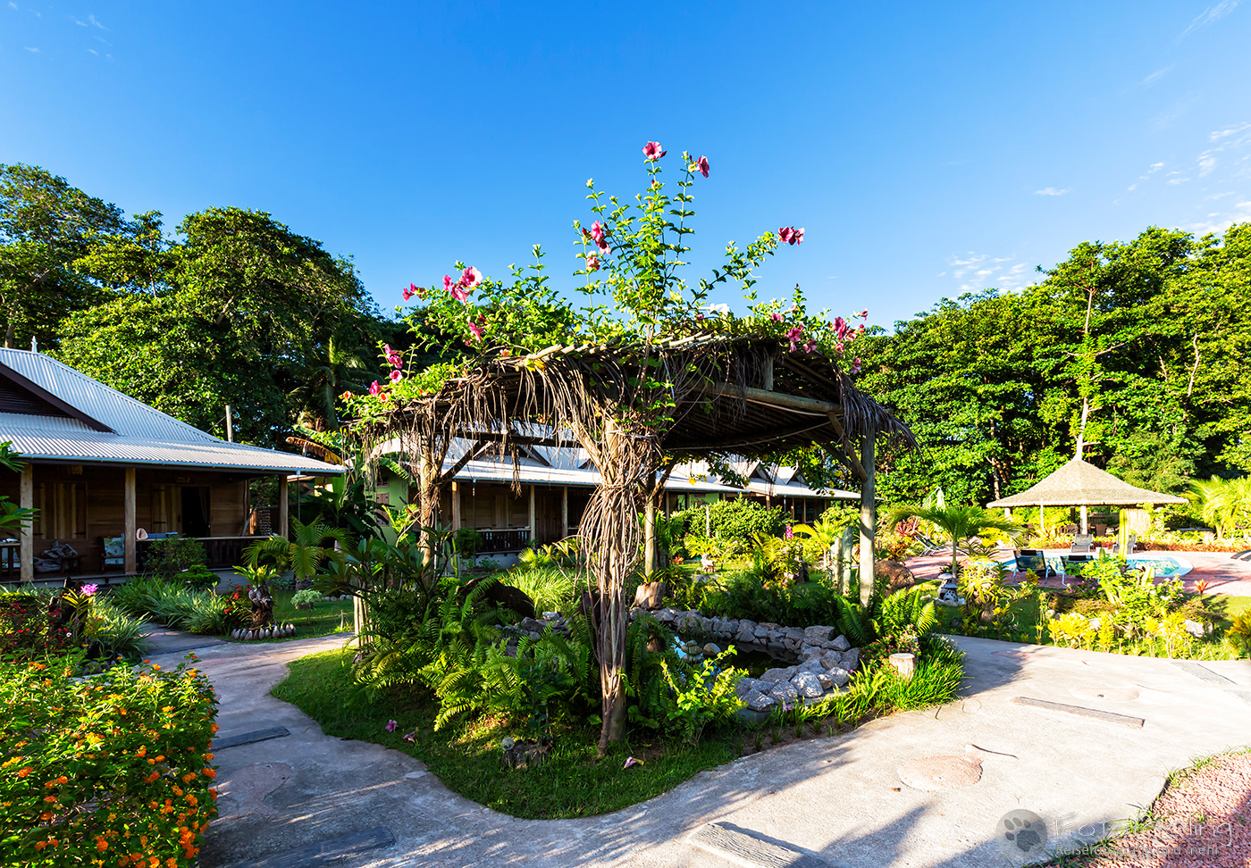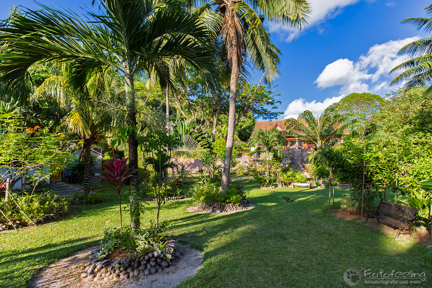 Die Fahrt ging einmal quer über die Insel vorbei am bekannten Naturschutzgebiet Vallée de Mai, wo die bekannte Coco de Mer (Palme) wächst. Wir fuhren durch dichten Dschungel und vorbei an schönen weißen Sandstränden und spuckten immer wieder Touristen aus, bis nur noch wir und ein weiteres Paar übrig waren. An einem riesigen Golfplatz, bog unser Bus nach links ab und eine holprige Piste brachte uns immer weiter weg von der Hauptstraße bis zum Ende der Straße. Diesmal waren wir an der Reihe und kletterten aus dem Bus. Hier wartete Natalie schon auf uns und begrüßte uns herzlich. Sie war uns sofort sympathisch, zumal um ihre Füße herum ein paar sehr liebe Hunde wuselten und im Garten allerhand Tiere herum liefen. Natalie zeigte uns unser Zimmer, dafür mussten wir eine Auffahrt hinauf und dort waren genau zwei Bungalows. Unsere Nachbarn, ein Paar aus Dresden, hatten es schlauer als wir gemacht, denn sie waren mit dem Flieger nach Praslin gebracht worden und konnten sich schon einige Stunden vor uns akklimatisieren.