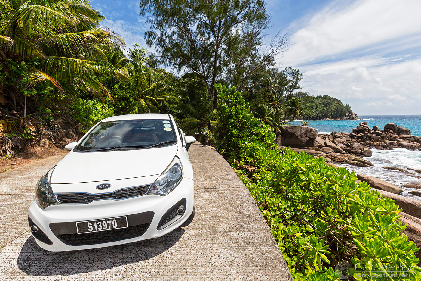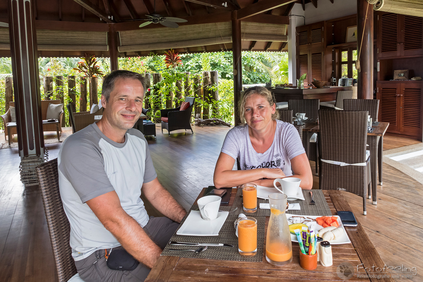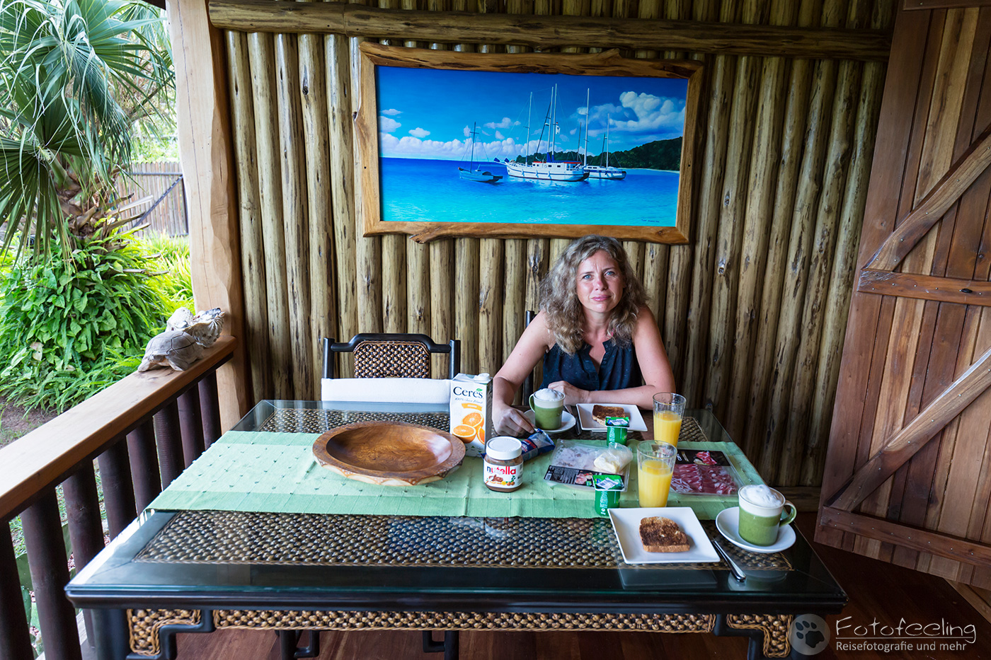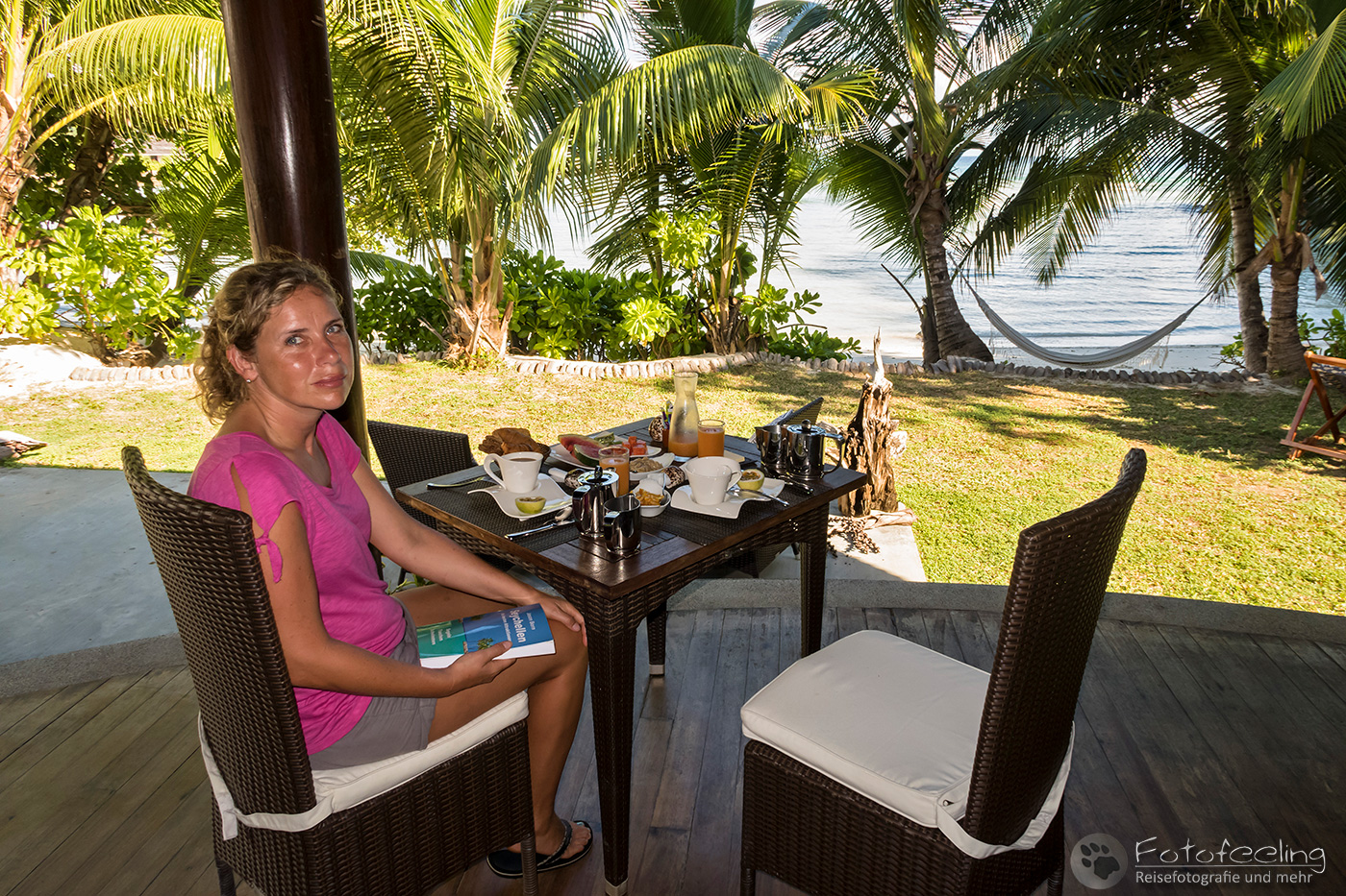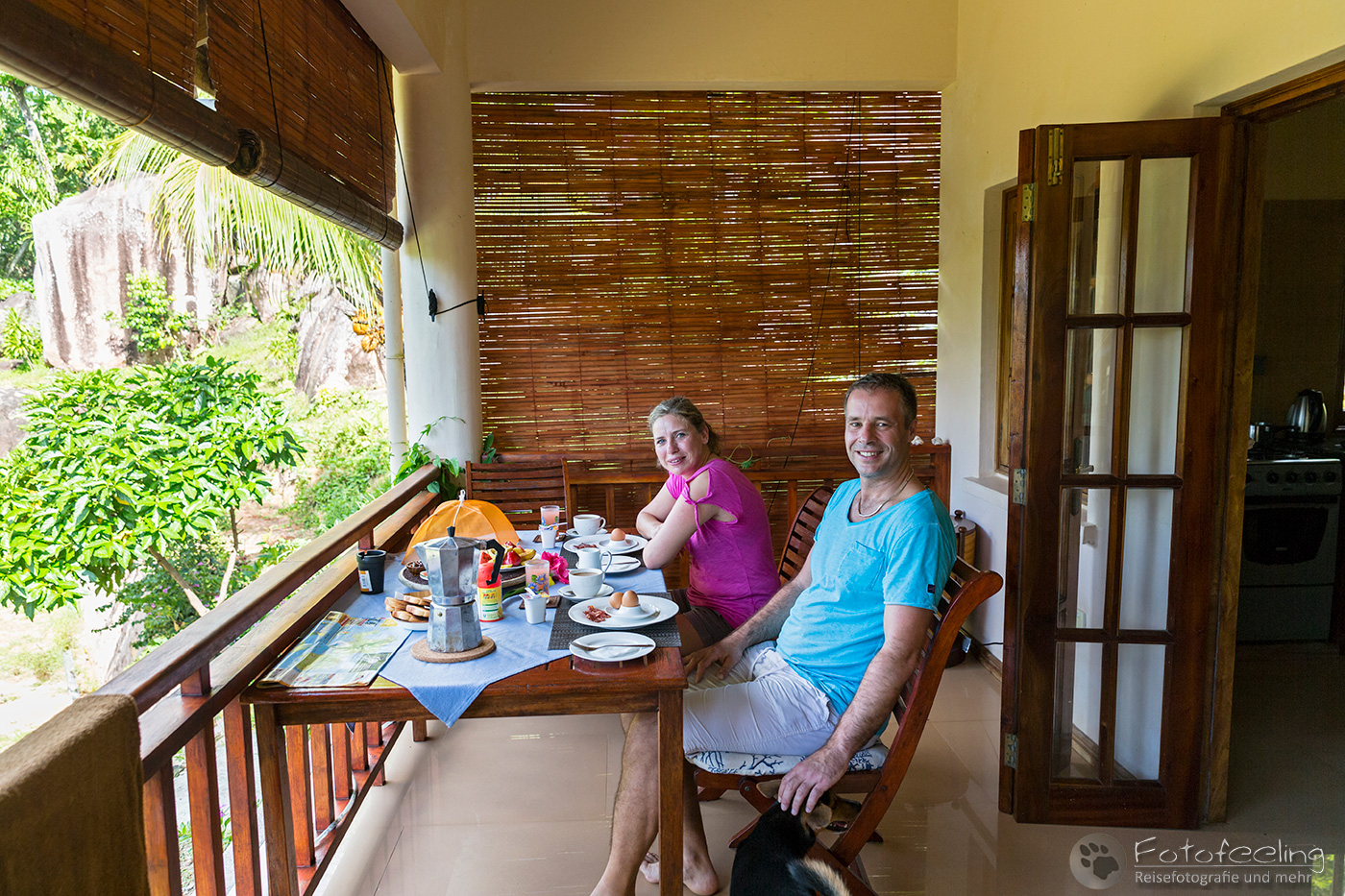 Schon früh waren wir auf und ließen uns an diesem Morgen das Frühstück servieren. Wir bekamen leckeres Obst, das wir zum Teil noch gar nicht kannten wie den Seychellen- und den Goldapfel, aber auch Mini-Bananen, Sternfrucht und Passionsfrucht. Toast, Marmelade, Joghurt, ein Ei sowie Speck und Gemüse. Dazu kochten wir uns unseren eigenen mitgebrachten Kaffee und dank unseres Zauberstabes gab es aufgeschäumte Milch, so dass aus dem Kaffee ein Cappuccino wurde und eine sehr glückliche Andrea auf der Terrasse saß. Hier auf den Seychellen ist es leider gar nicht einfach, einen normalen Pulverkaffee zu bekommen, denn hier gibt es eher Instant und wer selbigen nicht mag, sollte sich unbedingt Kaffee aus Deutschland mitbringen. Natalie leistete uns Gesellschaft und wir quatschten über Gott und die Welt. Um 9 Uhr kam dann unser Auto und kurz darauf starteten wir, denn wir waren schon sehr gespannt auf die bekannten Traumstrände wie den Strand mit dem klangvollen Namen Anse Lazio.