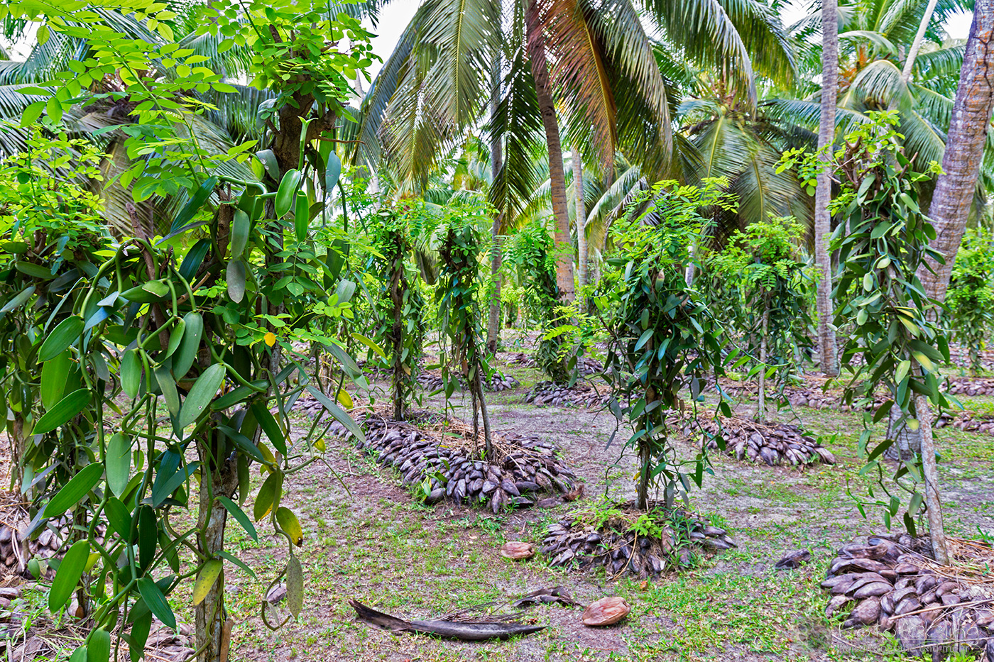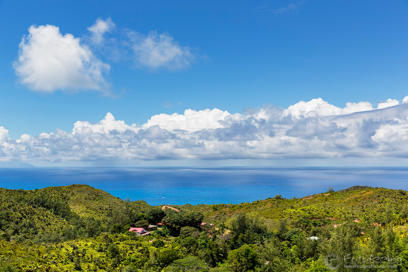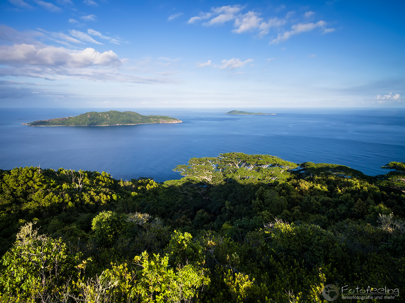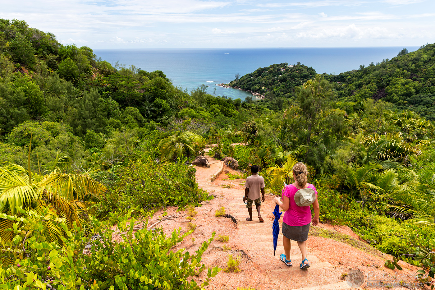 10 -15 kg haben. Da meist bis zu drei Samen in einer Frucht sitzen, kann diese bis zu 45 kg schwer sein. Die Samen der Coco de Mer sind die größten bekannten Pflanzensamen. Eine Palme bildet nur einen Samen pro Jahr und dieser bleibt bis zu 7 Jahren an der Palme bis er reif ist. Wir waren sehr beeindruckt von den riesigen Fächerpalmen und der Last, die sie tragen. Wir sahen aber auch andere Bäume wie den Zimtbaum, dessen innere Rinde aromatisch nach Zimtöl roch. Auch die Blätter rochen nach Zimt, wenn man sie zerdrückte. Sie werden auch als Ersatz für indische Lorbeerblätter verwendet. Immer wieder hielten wir an und betrachteten verschiedene Pflanzen wie Vanille, den Viergewürzbaum (Piment, Nelken, Ingwer und weißer Pfeffer), Termiten oder einfach nur begeistert den riesigen Regenwald. Unser Weg führte uns auf einen Hügel, so dass der Wald schon bald unter uns lag und wir eine fantastische Aussicht auf die Buchten von Praslin, die vorgelagerten Inseln und den üppigen Regenwald hatten.