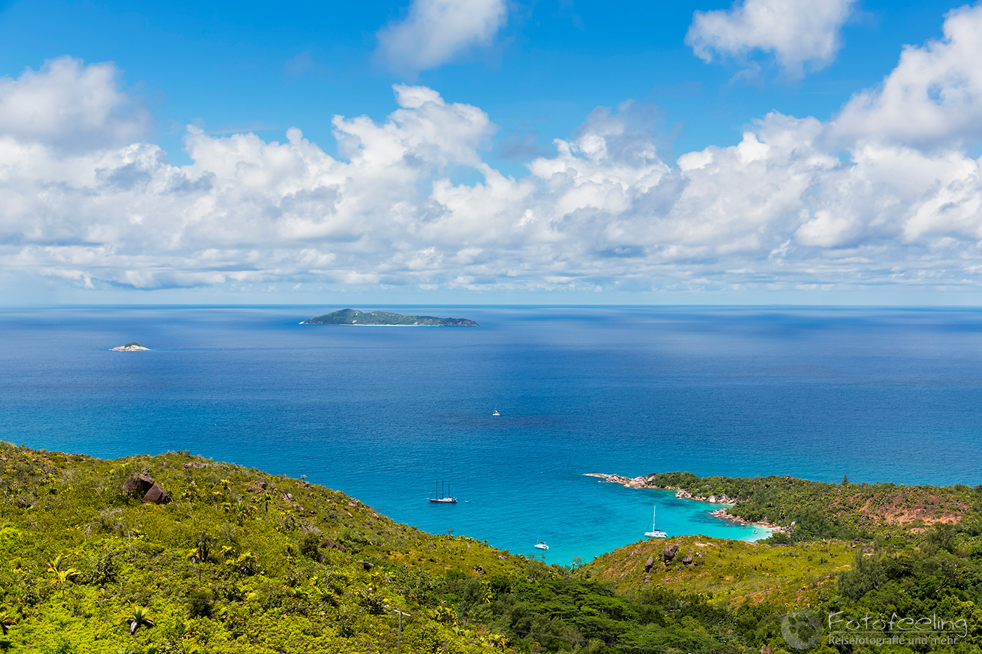 Der Strand war schneeweiß und kilometerlang. Er lud regelrecht zu langen Strandspaziergängen ein. Das Wasser war kristallklar und leuchtete türkisblau, darauf schaukelten Boote. Wir liefen eine kurze Strecke am Strand entlang und tauchten mit den Füßen ins warme Wasser. Doch dass musste vorerst genügen, denn wir wollten uns ja den Traumstrand Anse Lazio und vorher noch den höchsten befahren Punkt der Insel den Berg „Zimbabwe“ – Grand Fond anschauen und so sprangen wir nach ca. 15 Minuten wieder ins Auto und fuhren weiter.