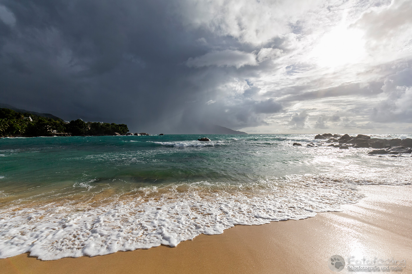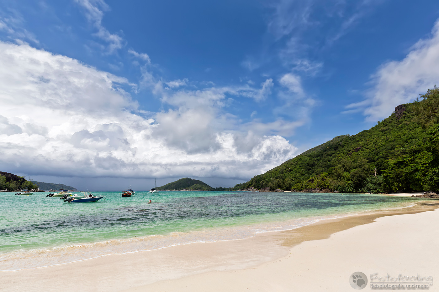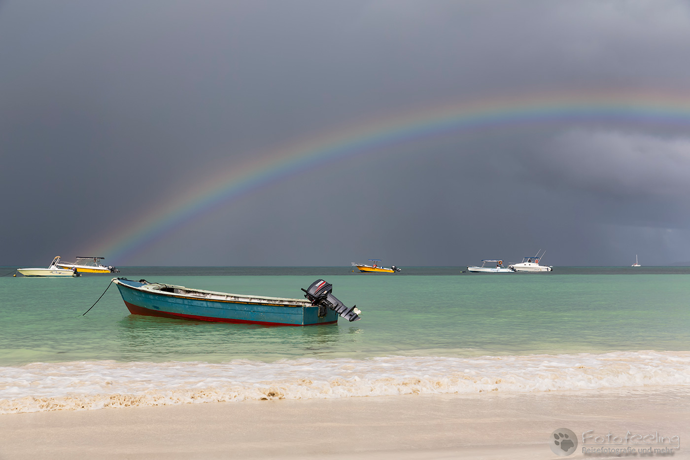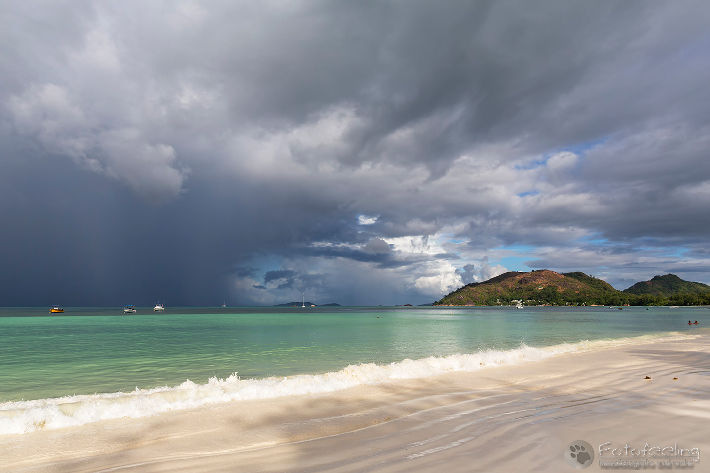 Da war schon ganz schön was los, dachten wir uns, als wir die parkenden Autos betrachteten. Wir gingen die letzten paar Meter bis zum Strand. Der Strand war so weiß, dass man automatisch die Augen zusammenkniff. Wir schauten uns beide Enden der Bucht an und blieben erst einmal in der Nähe des Hainetzes, dass nach zwei Haiangriffen von 2011 errichtet wurde. Wunderschöne Granitfelsen, für die die Seychellen so bekannt sind, ragten aus dem Wasser bzw. lagen am Strand verstreut. Palmen säumten das Ufer und boten etwas Schatten. Leichte Wellen brachen sich am Strand oder den Felsen. Ein wirklich idyllischer Ort. Auf dem Meer schaukelten etliche Katamarane im türkiesen Wasser, hinter denen sich langsam eine Wolkenwand gebildet hatten. Das sah richtig spektakulär aus. Natürlich stürzten wir uns ins Wasser, das zwar keine Abkühlung brachte, aber trotzdem angenehm erfrischend war. Die Zeit verging wie im Fluge. Als die Wolken langsam immer dichter wurden, brachen wir auf und hielten noch einmal am Anse Volbert. Jetzt stand über dem Meer eine Regenwand und davor spannte sich ein Regenbogen. Der Strand wirkte noch weißer im Sonnenlicht. Das sah wirklich toll aus.