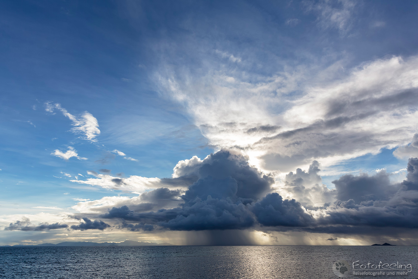 Wir fuhren an den Stränden entlang zu unserem Bungalow zurück. Dramatische Wolken hatten sich auf dem, Meer gebildet. Sie sahen so klasse aus, dass wir immer wieder halten mussten, um ein paar Bilder zu machen. Zurück an unserem Bungalow gingen wir zum Strand. Mittlerweile war der Hunger so groß, dass wir uns Kräcker und Käse mit an den Strand nahmen. Aber auch hier zog es immer weiter zu. Es sah bedrohlich und fantastisch zugleich aus. Trotz der Stimmung war es immer noch heiß, um nicht zu sagen so drückend, dass einen vom Nichtstun schon der Schweiß herunter lief. Wir schafften es gerade noch bis in unser Zimmer, dann brach ein richtiger tropischer Regenguss los. Fasziniert schauten wir von der Terrasse aus zu. Die Tropfen waren riesig. Sie prasselten in einer Lautstärke auf das Dach, dass wir fast schreien mussten, um uns zu verständigen.