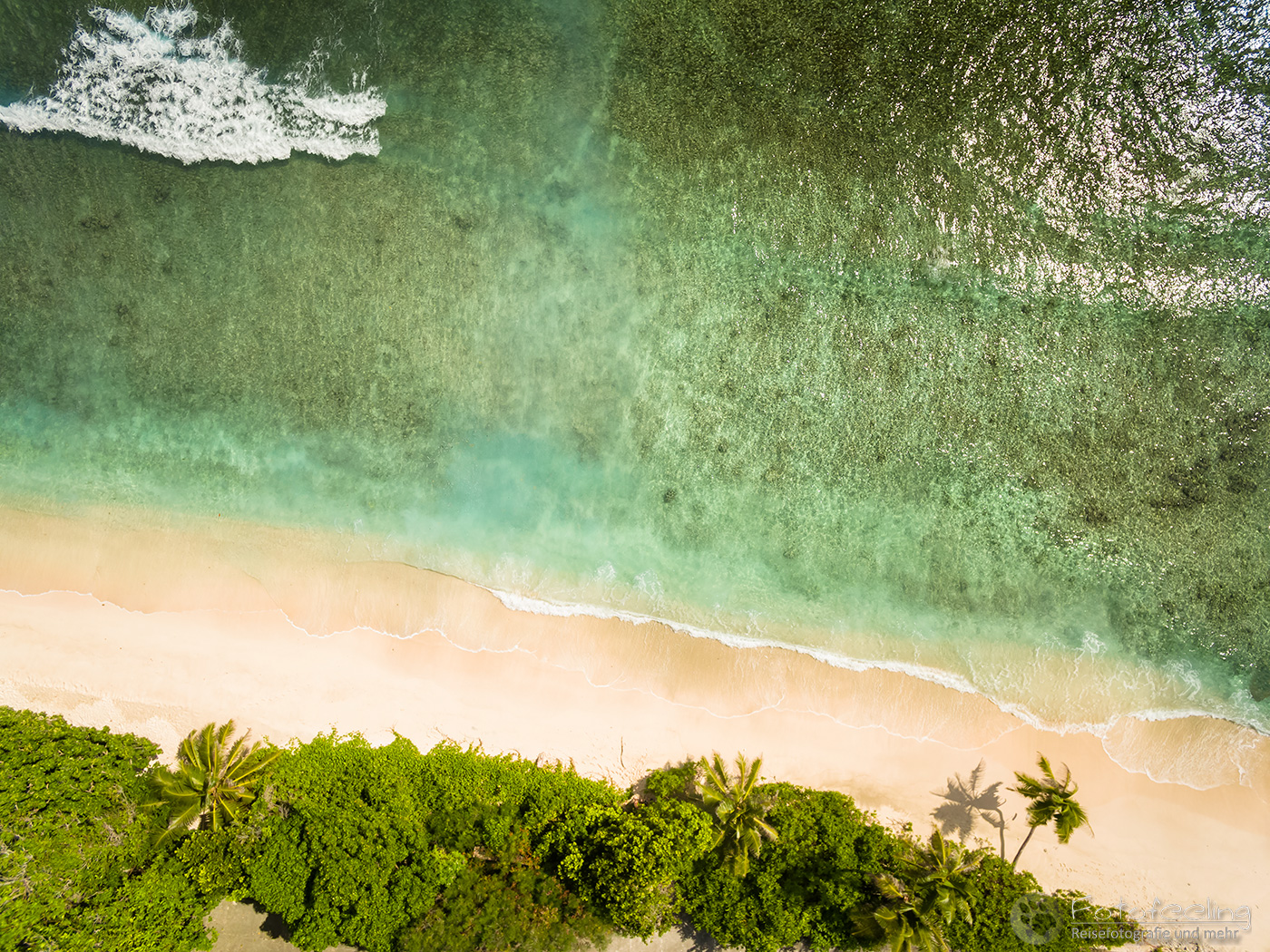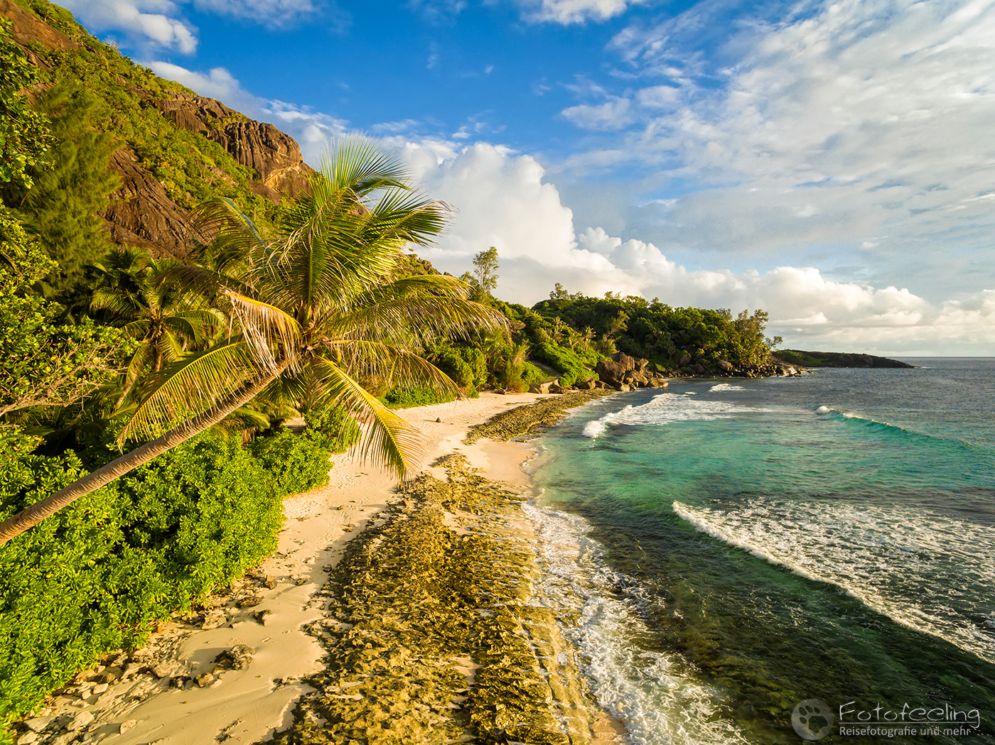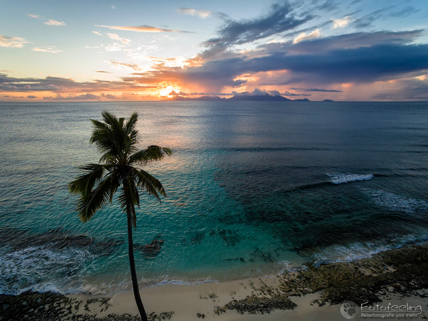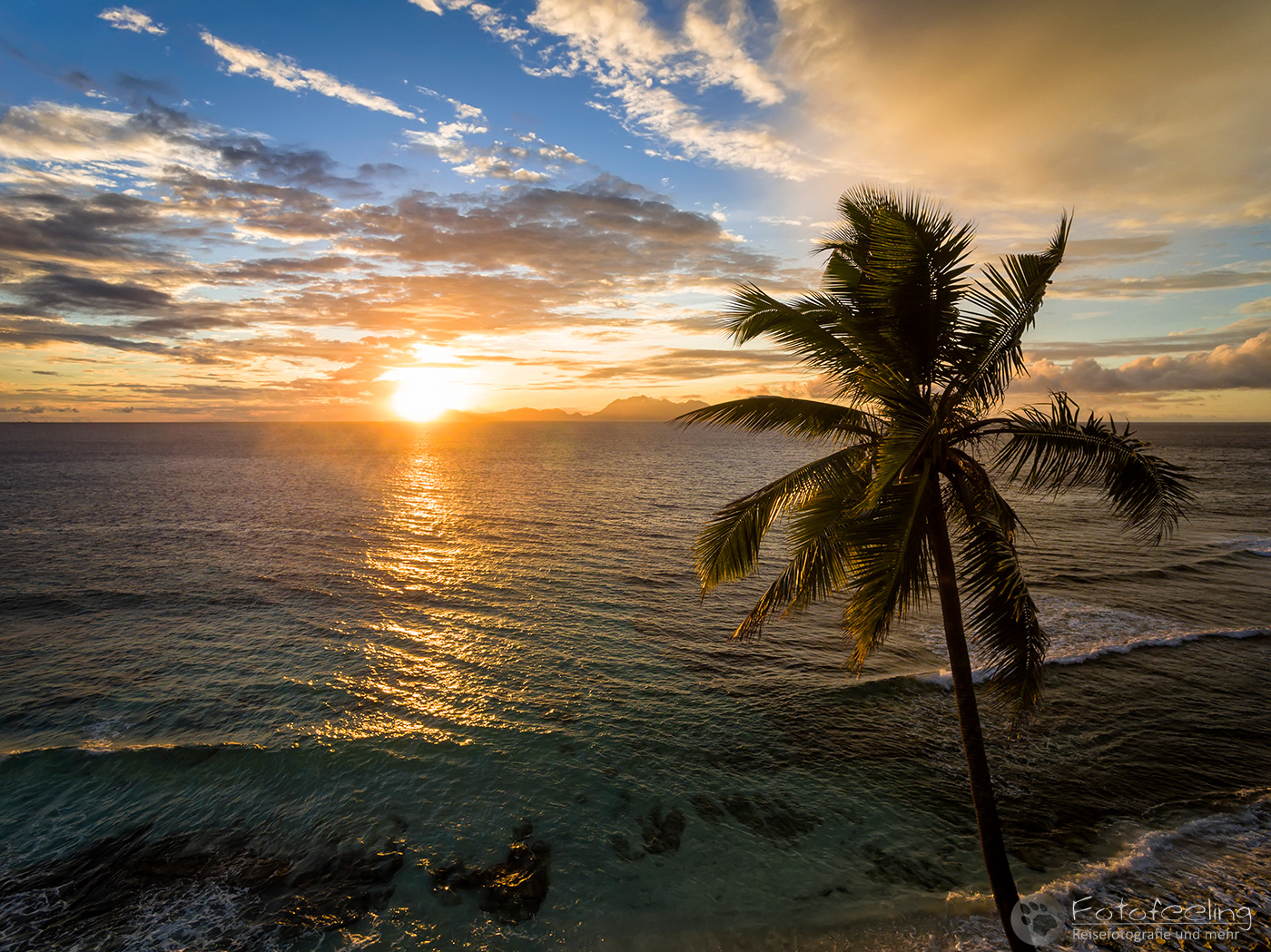 Wir standen wieder im Dunkeln auf und gingen mit unseren Taschenlampen bewaffnet zum Anse Lascars. Es war bewölkt an diesem Morgen, aber über Mahé war ein wolkenfreier Streifen und der Himmel verfärbte sich langsam gelb als wir ankamen. Die Farben wurden immer intensiver, bis die Sonne über den Horizont geklettert war. Die ersten Flughunde zogen hoch über den Palmen ihre Bahnen und wieder war es so friedlich und still hier. Chris ließ erneut den Kopter steigen. Ich machte ein paar Bilder und schaute den Wellen zu, die auf das Riff trafen. Die Wolken verzogen sich nach und nach und das Wetter wurde immer schöner.