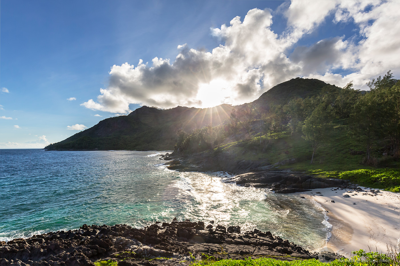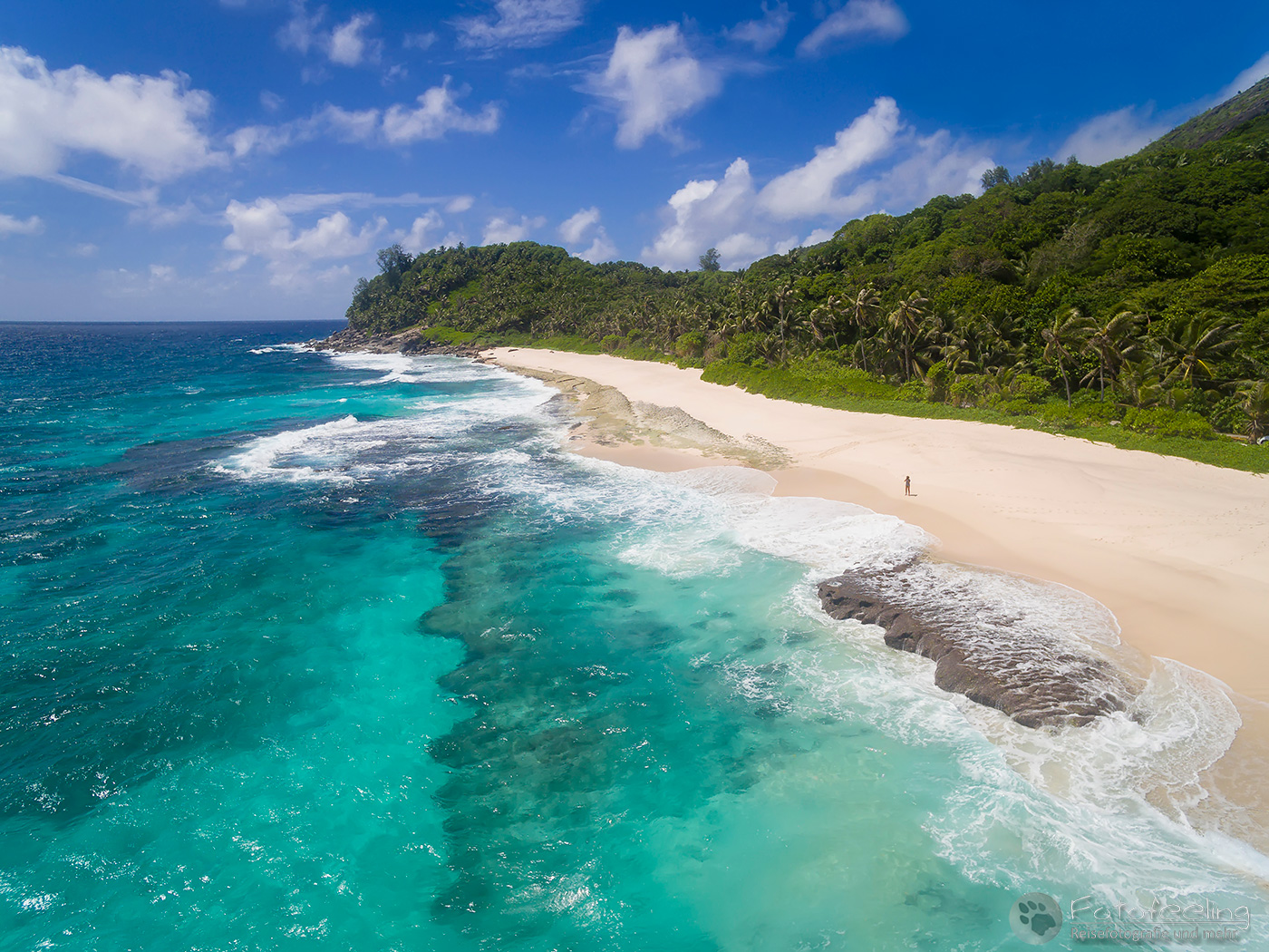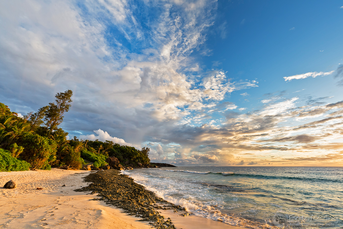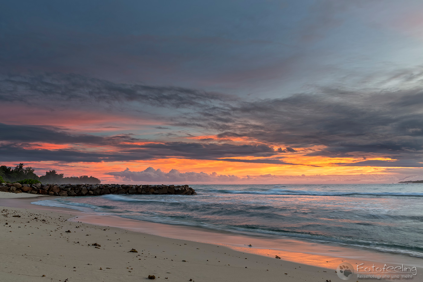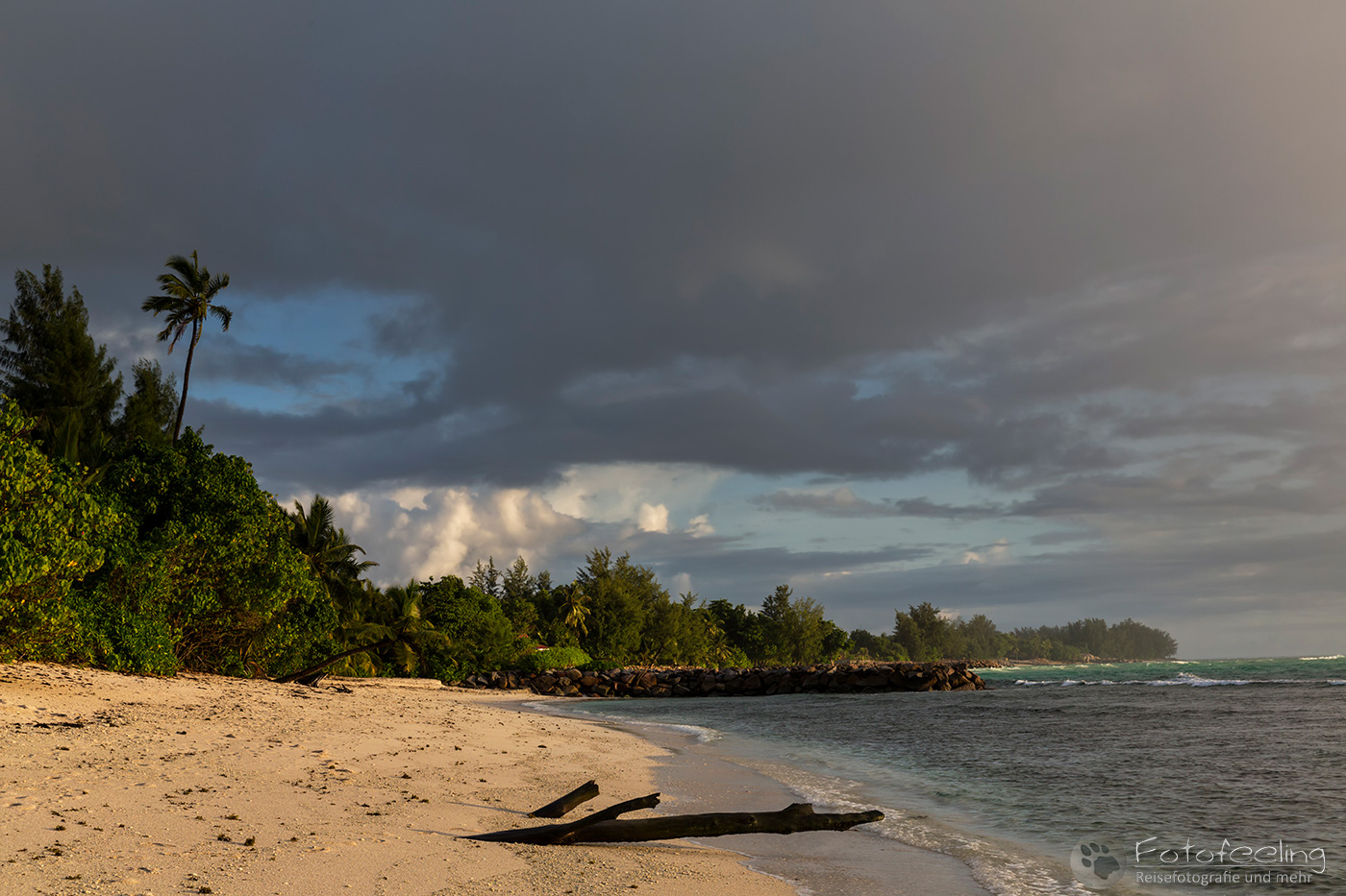 Wir standen wieder im Dunkeln auf und gingen mit unseren Taschenlampen bewaffnet zum Anse Lascars. Es war bewölkt an diesem Morgen, aber über Mahé war ein wolkenfreier Streifen und der Himmel verfärbte sich langsam gelb als wir ankamen. Die Farben wurden immer intensiver, bis die Sonne über den Horizont geklettert war. Die ersten Flughunde zogen hoch über den Palmen ihre Bahnen und wieder war es so friedlich und still hier. Chris ließ erneut den Kopter steigen. Ich machte ein paar Bilder und schaute den Wellen zu, die auf das Riff trafen. Die Wolken verzogen sich nach und nach und das Wetter wurde immer schöner.
